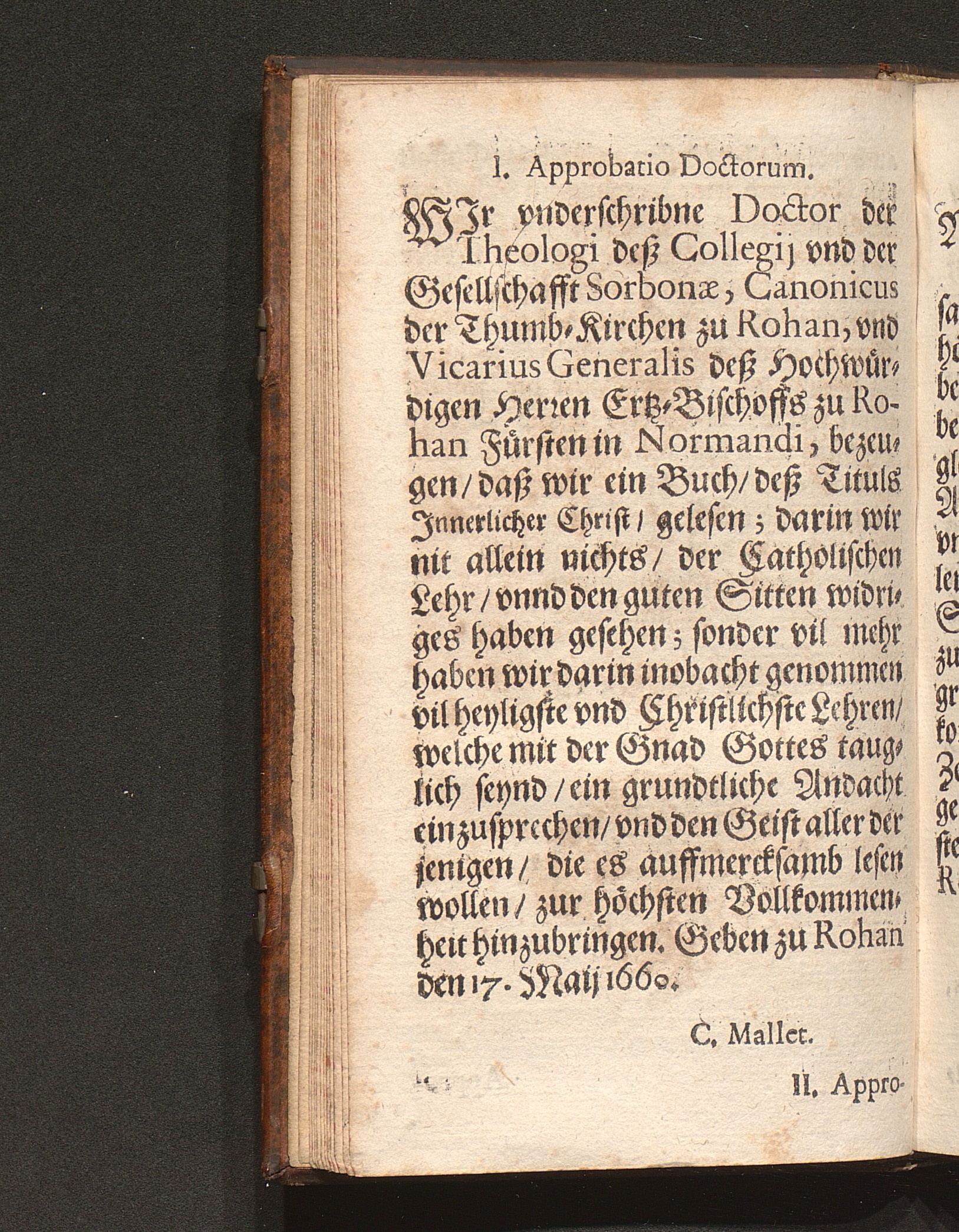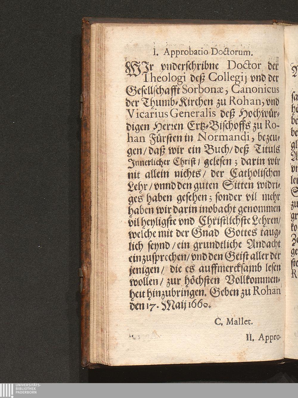 Jnnerlicher Christ/ oder Die Jnnerliche Gleichförmigkeit/ welche der Christ mit Christo haben soll : Abgetheilt in VIII. Bücher/ darin gantz Göttliche Lehren Sprüch vnnd Meynungen begriffen seynd / Gezogen auß den Schrifften eines grossen Dieners Gottes vnserer Zeiten/ Durch einen Einsidler. Auß dem Frantzösischen ... in das Teutsche versetzt ... Von dem Francisco Brandenberg, Canonico zu Bischoffzell/ [et]c.