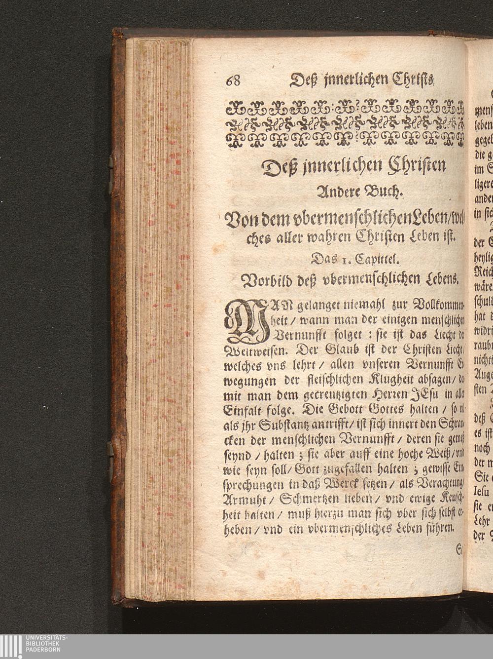 Jnnerlicher Christ/ oder Die Jnnerliche Gleichförmigkeit/ welche der Christ mit Christo haben soll : Abgetheilt in VIII. Bücher/ darin gantz Göttliche Lehren Sprüch vnnd Meynungen begriffen seynd / Gezogen auß den Schrifften eines grossen Dieners Gottes vnserer Zeiten/ Durch einen Einsidler. Auß dem Frantzösischen ... in das Teutsche versetzt ... Von dem Francisco Brandenberg, Canonico zu Bischoffzell/ [et]c.