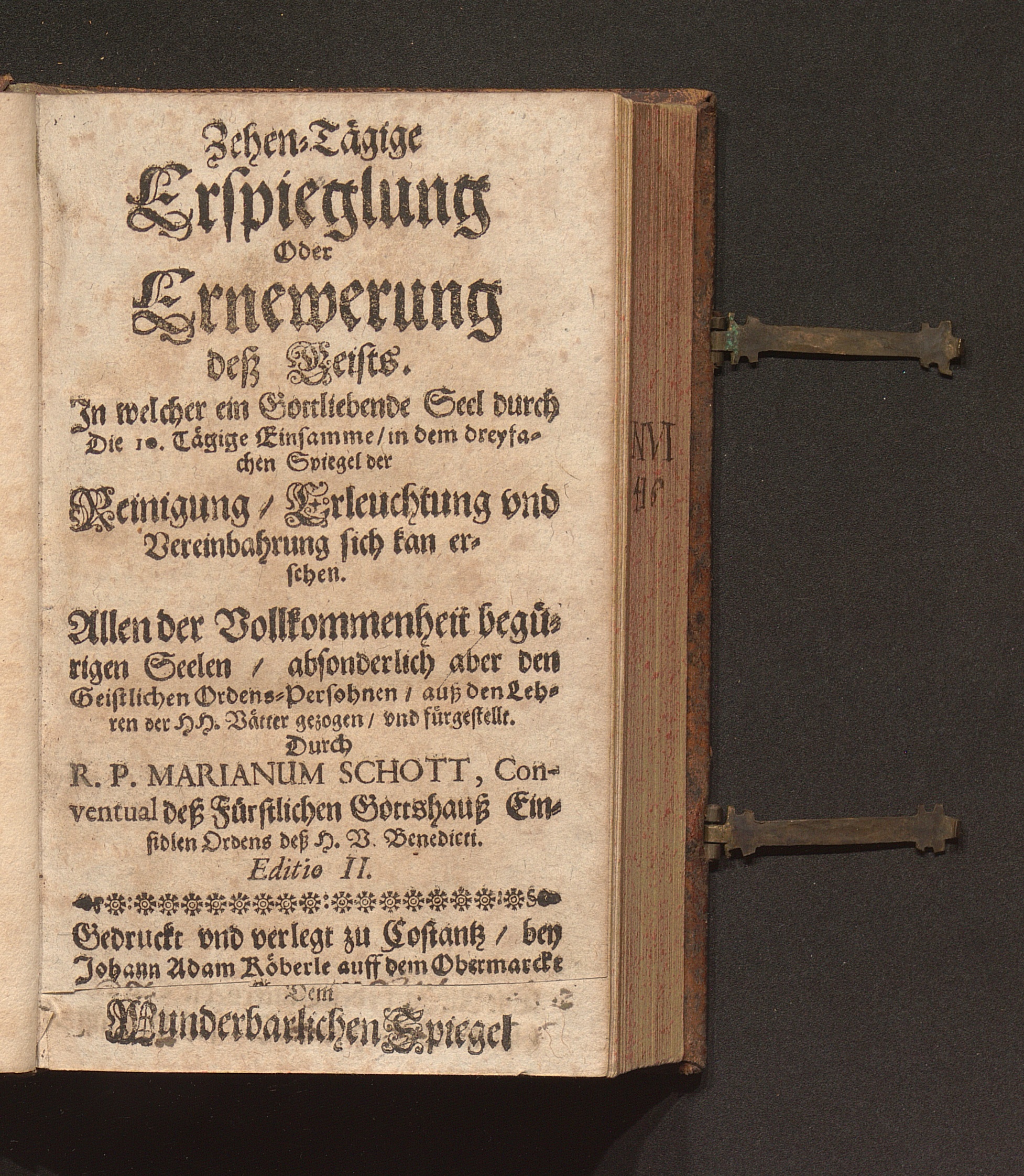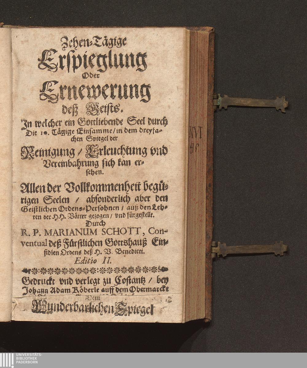 Zehen-Tägige Erspieglung Oder Ernewerung deß Geists : Jn welcher ein Gottliebende Seel durch Die 10. Tägige Einsamme/ in dem dreyfachen Spiegel der Reinigung/ Erleuchtung vnd Vereinbahrung sich kan ersehen ... / auß den Lehren der HH. Vätter gezogen/ vnd fürgestellt. Durch R. P. Marianum Schott, Conventual deß Fürstlichen Gottshauß Einsidlen Ordens deß H. V. Benedicti