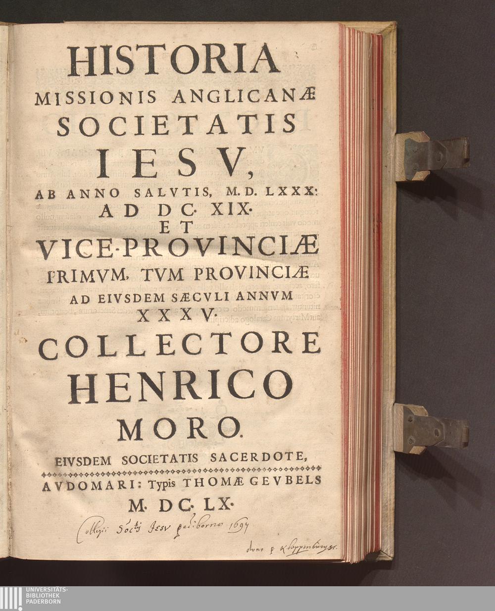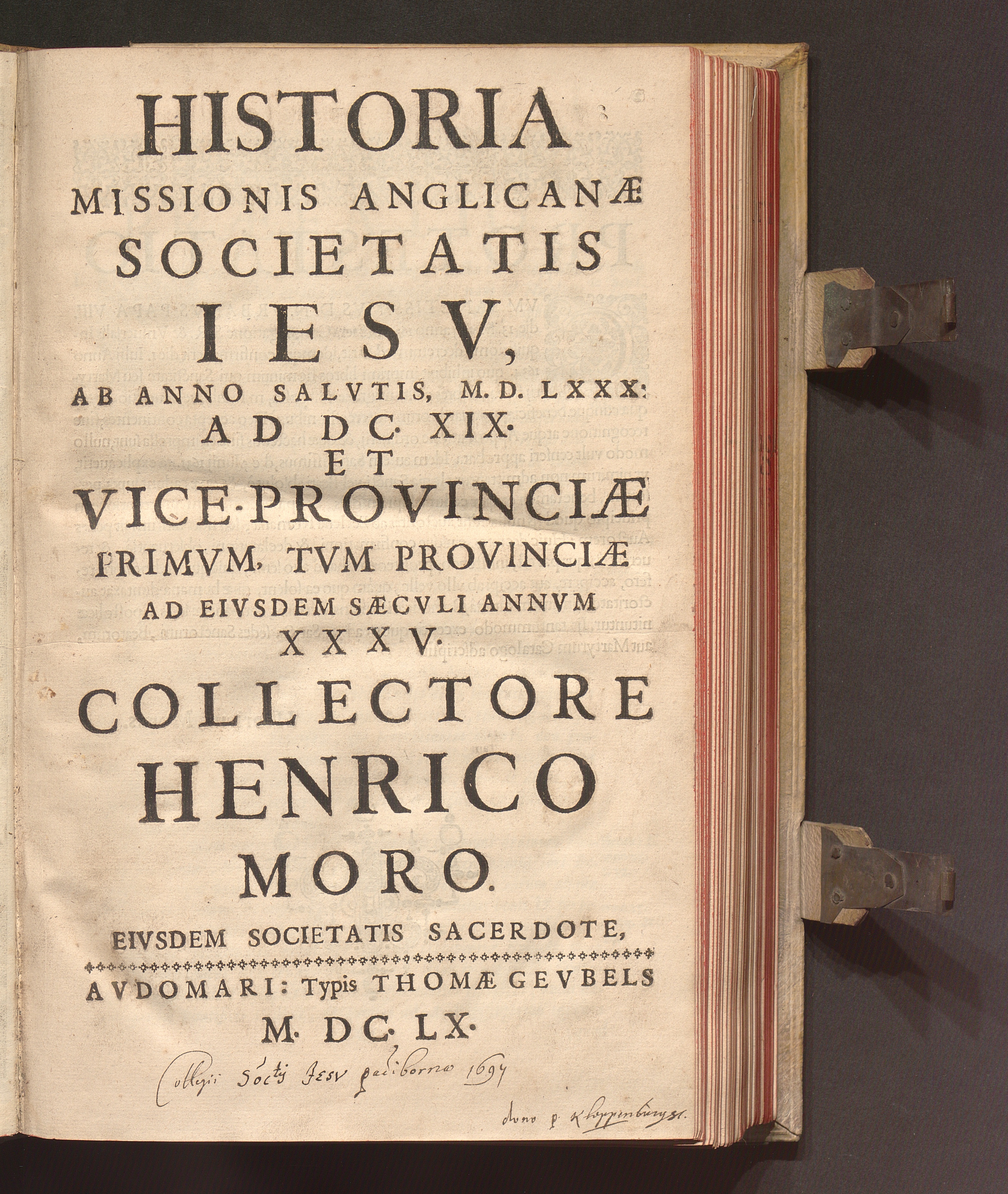 Historia Missionis Anglicanæ Societatis Iesv : Ab Anno Salvtis, M.D.XXX: Ad DC.XIX. Et Vice-Provinciæ Primvm, Tvm Provinciæ Ad Eivsdem Sæcvli Annvm XXXV. / Collectore Henrico Moro. Eivsdem Societatis Sacerdote