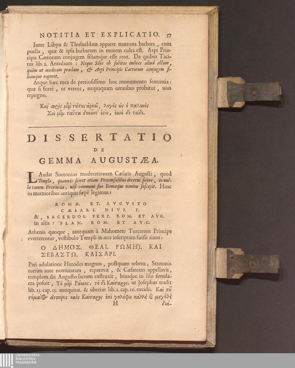 Achates Tiberianus, Sive Gemma Cæsarea, Antiquitate, Argumento, Arte, Historiâ, prorsùs incomparabilis, Et cui parem in Orbe Terrarum, non est reperire, D. Augusti Apotheosin, Imp. Cæs. Tiberii, Augustæque Juliæ Domus, Seriem & Iconas, Gentesque Bello captas Repræsentans ... / nova Notitia & Explicatio, Notis Historicis illustrata: Auctore Jacobo Le Roy, libero Barone S. R. I.
