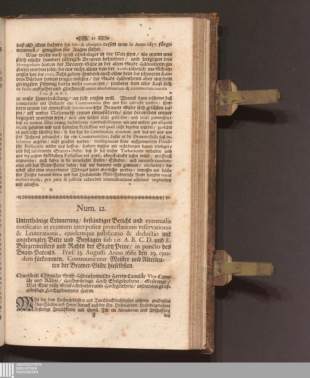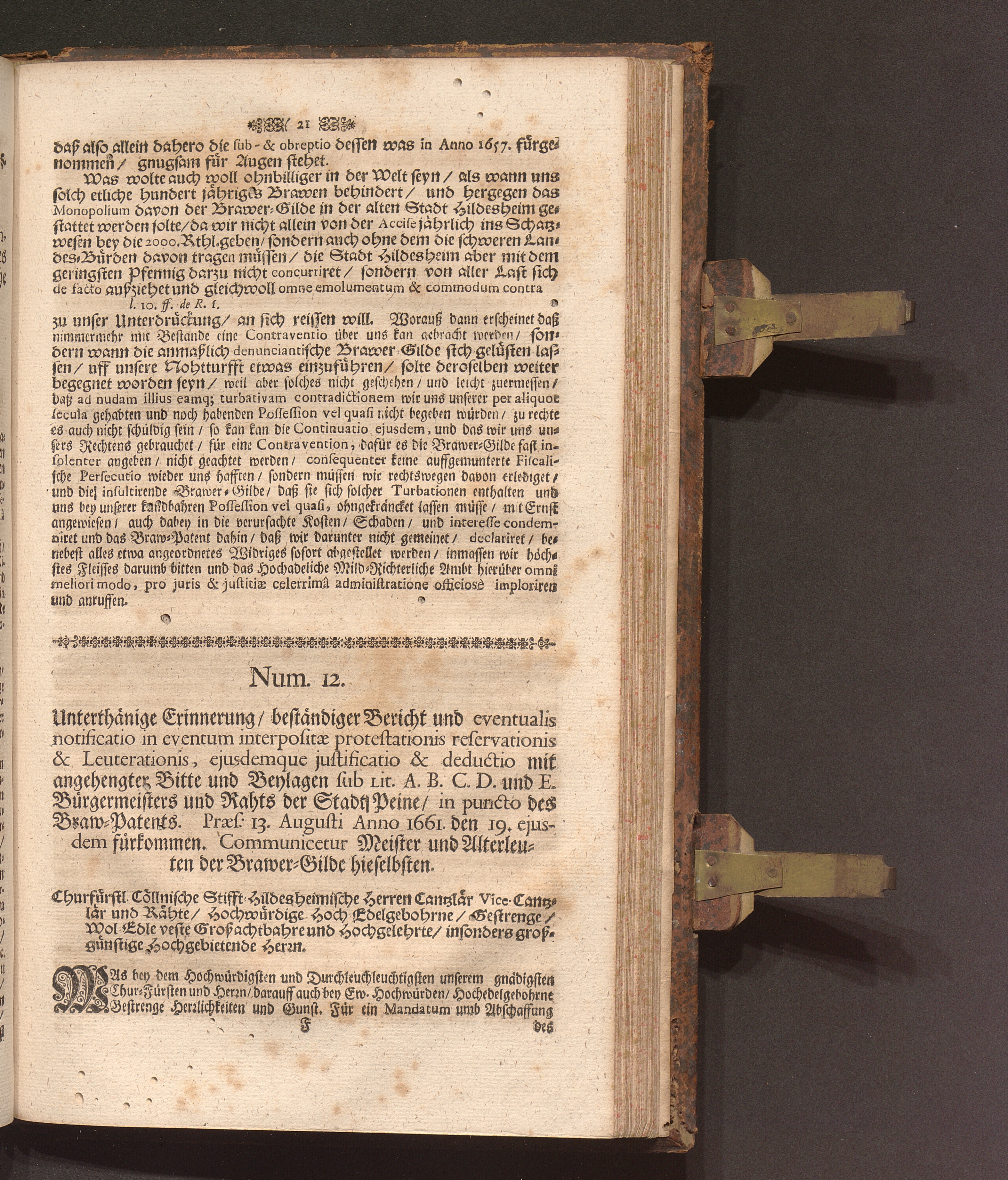 Speculum Veritatis Et Justitiæ: Repræsentans Pacem & Æquitatem Principis, Veritatem Facti, Et Juris Evidentiam Oppositum Caliginosæ Lampadi, Tribus Braxatoriæ Hildesiensis Pro Principe, Capitulo Cathedrali, Clero, Equestri Ordine, Urbibus, Patria, Populoque Hildesiensi Contra Monopolium Palliatum, Aviditatem Velatam, Miseriam Fucatam, Libertatem Naturalem Restrictam, Ingratitudinem Publicam Braxatorum Hildesiensium. Das ist Spiegel Der Warheit und Gerechtigkeit/ und Schutz der Natürlichen Freyheit Wider Den bemäntelten Eigennutz/ erdichtete Armuht/ offenbahre Undanckbarkeit/ und im gantzen Stifft angemastes alleiniges Braw Commercium der also genandten Brawer-Gilde zu Hildesheim. Verthätiget Für den Lands-Fürsten ...