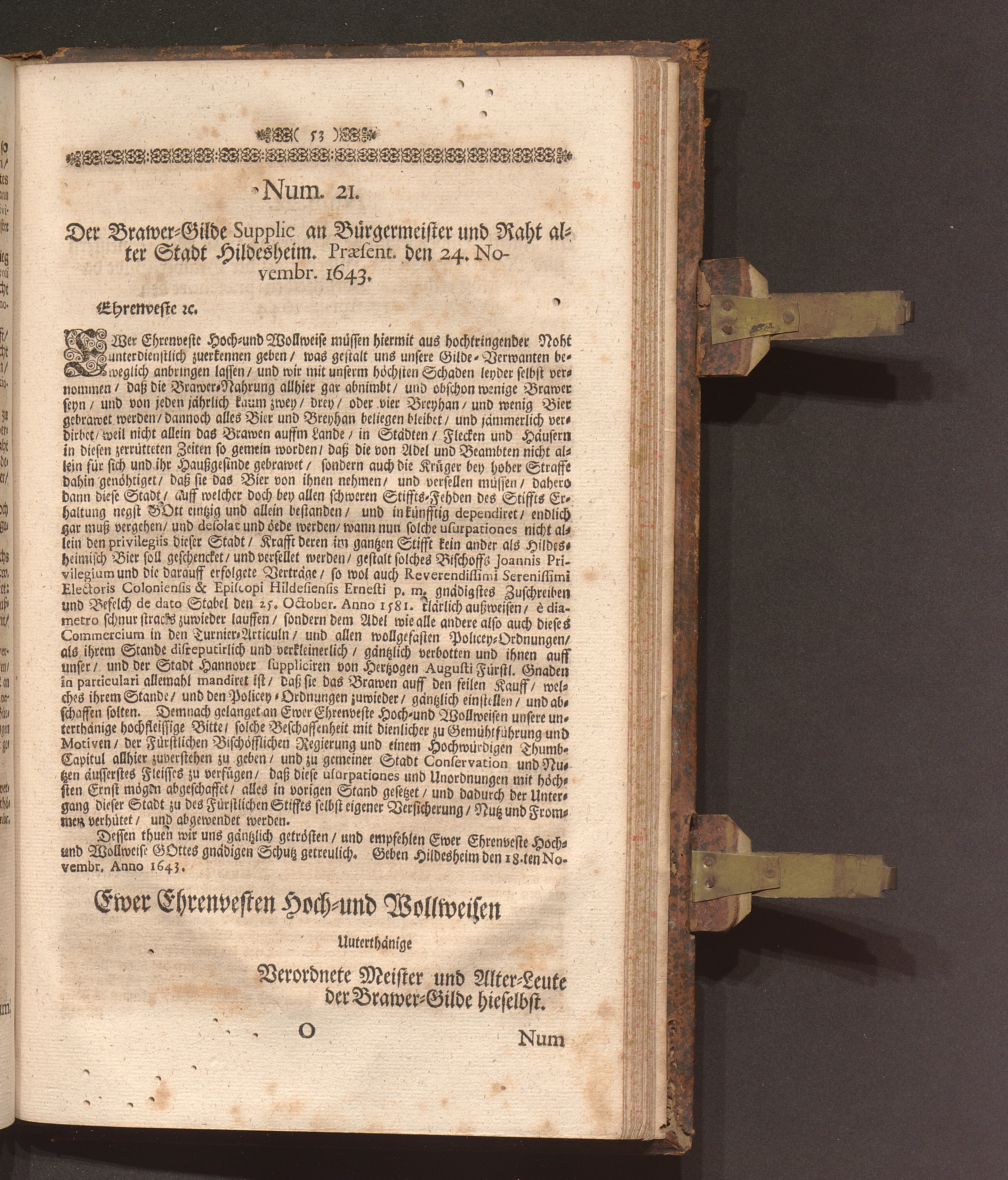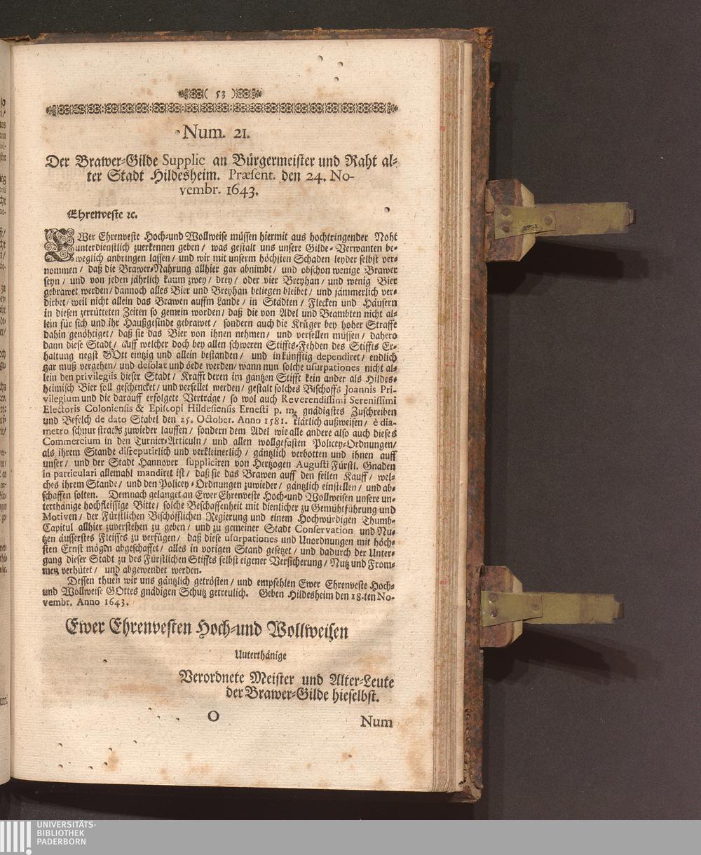 Speculum Veritatis Et Justitiæ: Repræsentans Pacem & Æquitatem Principis, Veritatem Facti, Et Juris Evidentiam Oppositum Caliginosæ Lampadi, Tribus Braxatoriæ Hildesiensis Pro Principe, Capitulo Cathedrali, Clero, Equestri Ordine, Urbibus, Patria, Populoque Hildesiensi Contra Monopolium Palliatum, Aviditatem Velatam, Miseriam Fucatam, Libertatem Naturalem Restrictam, Ingratitudinem Publicam Braxatorum Hildesiensium. Das ist Spiegel Der Warheit und Gerechtigkeit/ und Schutz der Natürlichen Freyheit Wider Den bemäntelten Eigennutz/ erdichtete Armuht/ offenbahre Undanckbarkeit/ und im gantzen Stifft angemastes alleiniges Braw Commercium der also genandten Brawer-Gilde zu Hildesheim. Verthätiget Für den Lands-Fürsten ...