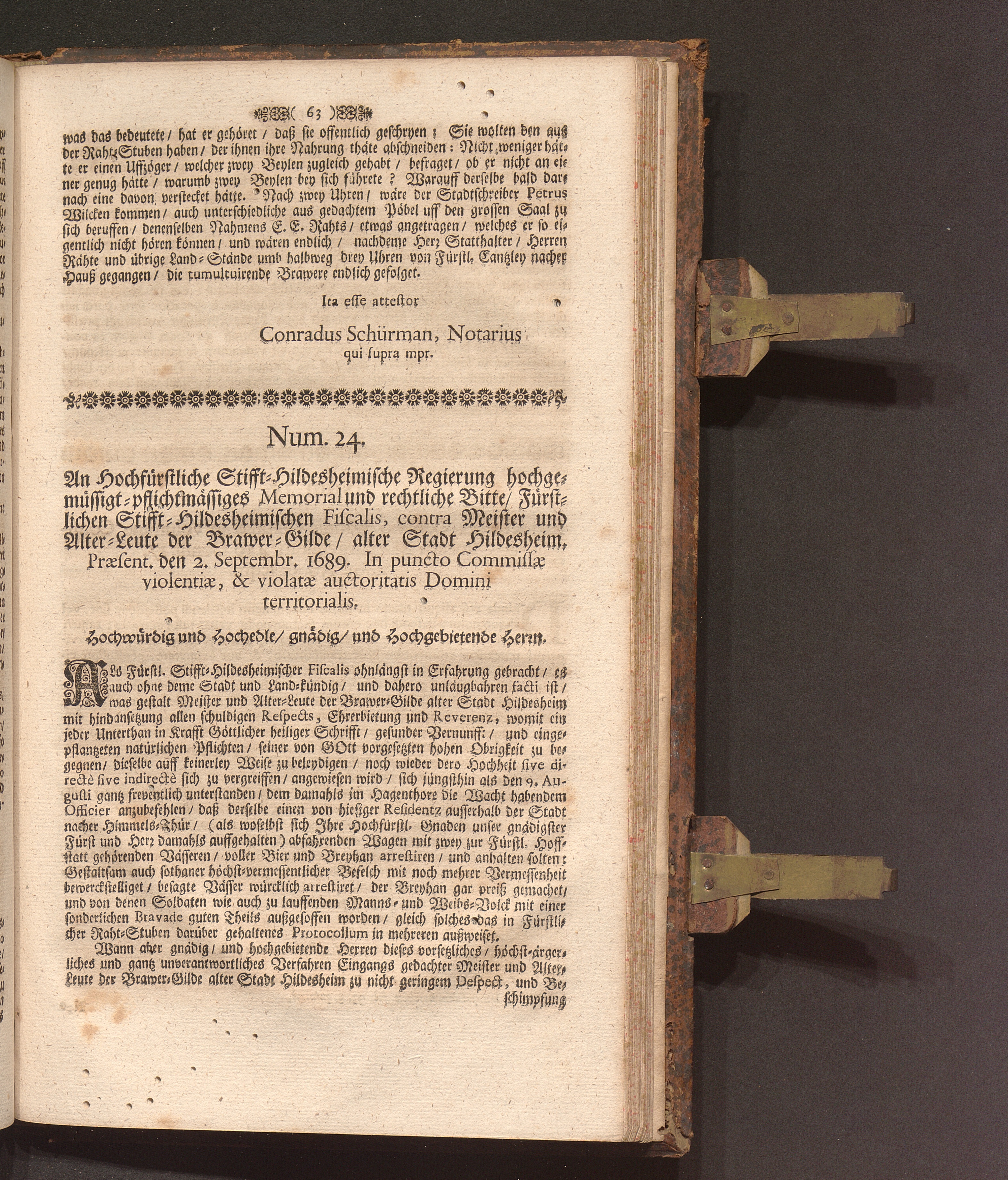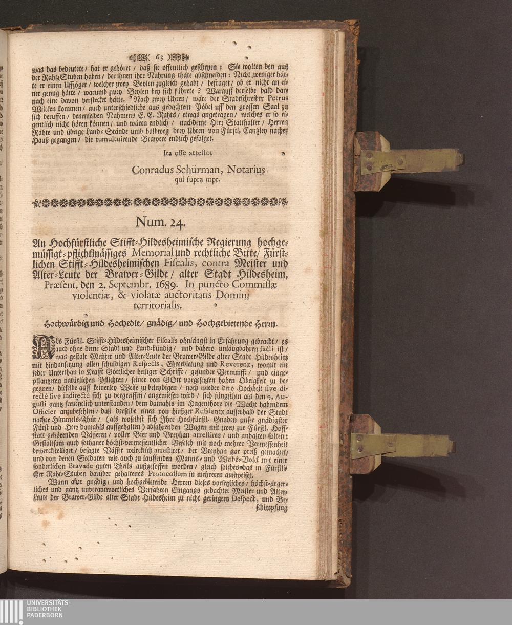 Speculum Veritatis Et Justitiæ: Repræsentans Pacem & Æquitatem Principis, Veritatem Facti, Et Juris Evidentiam Oppositum Caliginosæ Lampadi, Tribus Braxatoriæ Hildesiensis Pro Principe, Capitulo Cathedrali, Clero, Equestri Ordine, Urbibus, Patria, Populoque Hildesiensi Contra Monopolium Palliatum, Aviditatem Velatam, Miseriam Fucatam, Libertatem Naturalem Restrictam, Ingratitudinem Publicam Braxatorum Hildesiensium. Das ist Spiegel Der Warheit und Gerechtigkeit/ und Schutz der Natürlichen Freyheit Wider Den bemäntelten Eigennutz/ erdichtete Armuht/ offenbahre Undanckbarkeit/ und im gantzen Stifft angemastes alleiniges Braw Commercium der also genandten Brawer-Gilde zu Hildesheim. Verthätiget Für den Lands-Fürsten ...