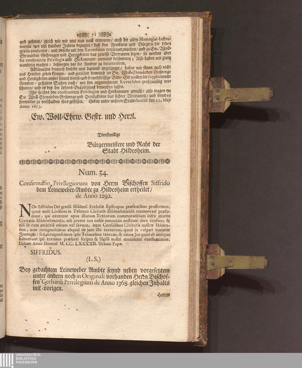 Speculum Veritatis Et Justitiæ: Repræsentans Pacem & Æquitatem Principis, Veritatem Facti, Et Juris Evidentiam Oppositum Caliginosæ Lampadi, Tribus Braxatoriæ Hildesiensis Pro Principe, Capitulo Cathedrali, Clero, Equestri Ordine, Urbibus, Patria, Populoque Hildesiensi Contra Monopolium Palliatum, Aviditatem Velatam, Miseriam Fucatam, Libertatem Naturalem Restrictam, Ingratitudinem Publicam Braxatorum Hildesiensium. Das ist Spiegel Der Warheit und Gerechtigkeit/ und Schutz der Natürlichen Freyheit Wider Den bemäntelten Eigennutz/ erdichtete Armuht/ offenbahre Undanckbarkeit/ und im gantzen Stifft angemastes alleiniges Braw Commercium der also genandten Brawer-Gilde zu Hildesheim. Verthätiget Für den Lands-Fürsten ...