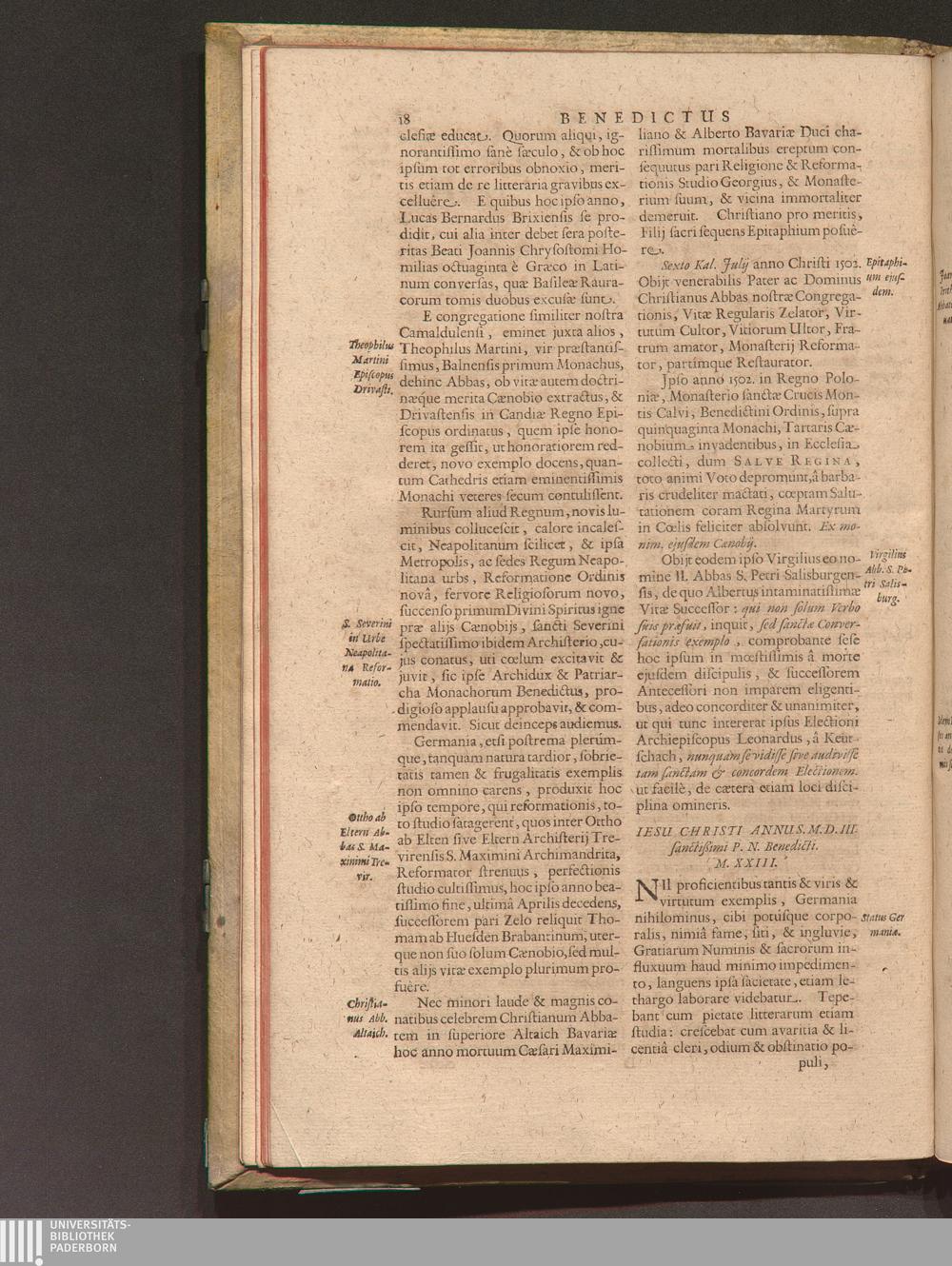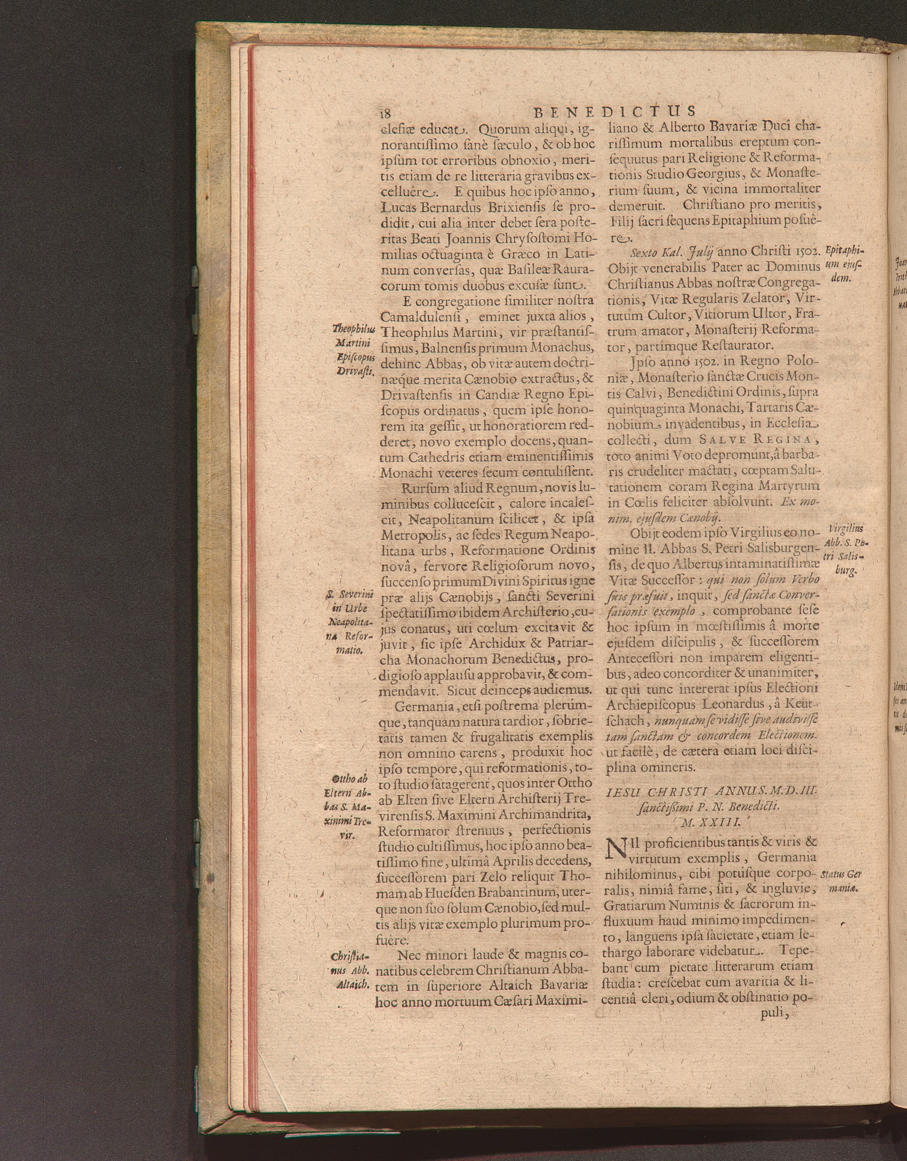 Benedictus Redivivus Hoc est: Benedictinj Ordinis Vetustißimi Amplißimique, Nostra, ac supera ætate Jmmarcescibilis Vigor, ac Viror : Anniversariâ Vernantiâ Chronologicè comprobatus, ac demonstratus Ab anno Christi M. D. Ad Præsentem Usque Ætatem, Et Annos Nostros, Jn Quo ... Operationes Jn Effusione Mirabili sui Spiritus ... quam compendiosissimè exhibe[n]tur / Opera, & Studio R. P. F. Gabrielis Bucelini Ascetæ Benedictini Imperialis Monasterij VVeingartensis Prioris S. Joannis Bapt. in Oppido Rhætiæ Superioris Veldkirchensi