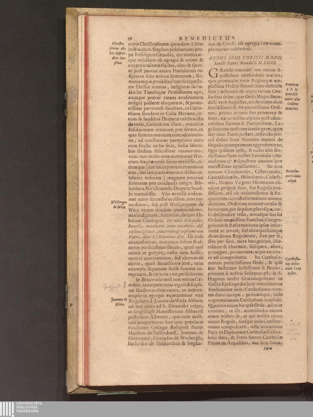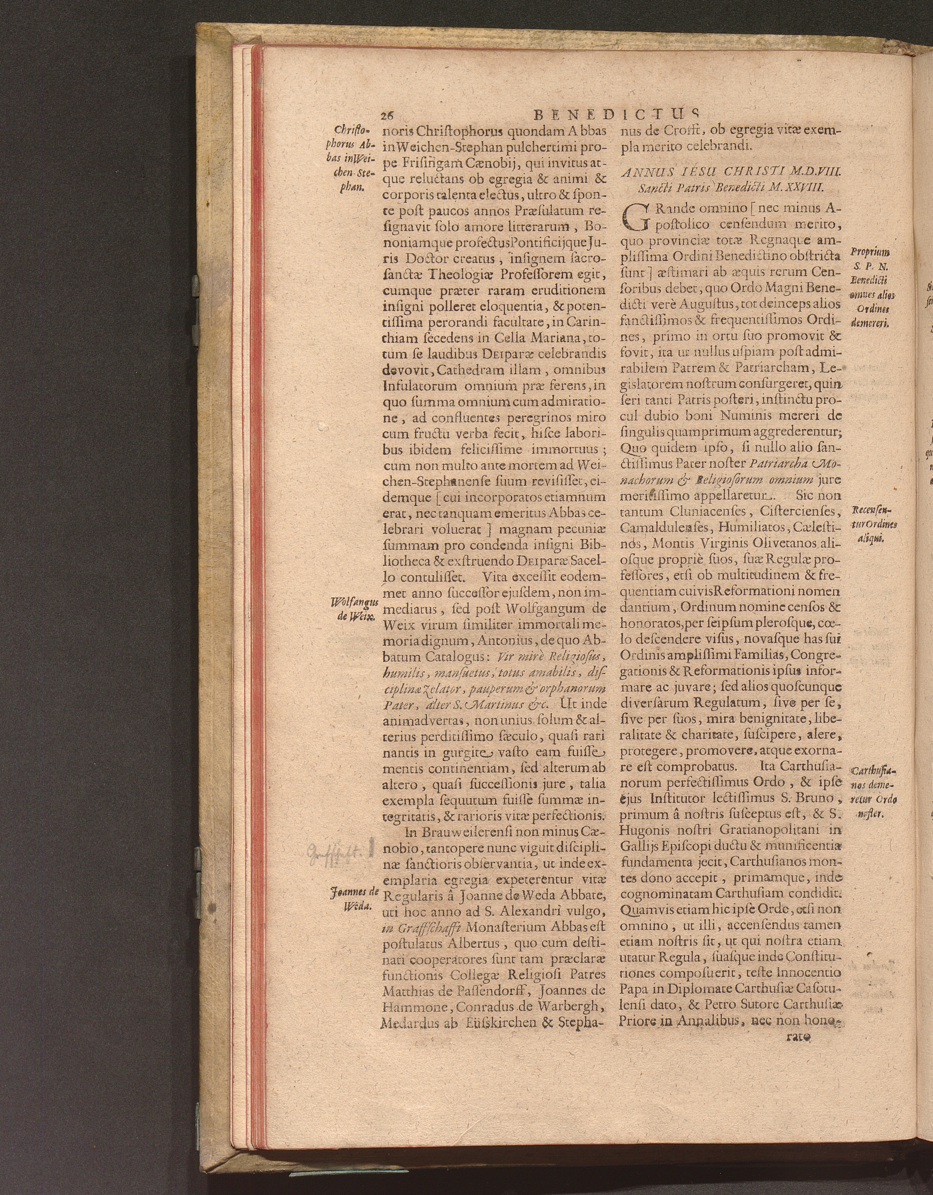 Benedictus Redivivus Hoc est: Benedictinj Ordinis Vetustißimi Amplißimique, Nostra, ac supera ætate Jmmarcescibilis Vigor, ac Viror : Anniversariâ Vernantiâ Chronologicè comprobatus, ac demonstratus Ab anno Christi M. D. Ad Præsentem Usque Ætatem, Et Annos Nostros, Jn Quo ... Operationes Jn Effusione Mirabili sui Spiritus ... quam compendiosissimè exhibe[n]tur / Opera, & Studio R. P. F. Gabrielis Bucelini Ascetæ Benedictini Imperialis Monasterij VVeingartensis Prioris S. Joannis Bapt. in Oppido Rhætiæ Superioris Veldkirchensi