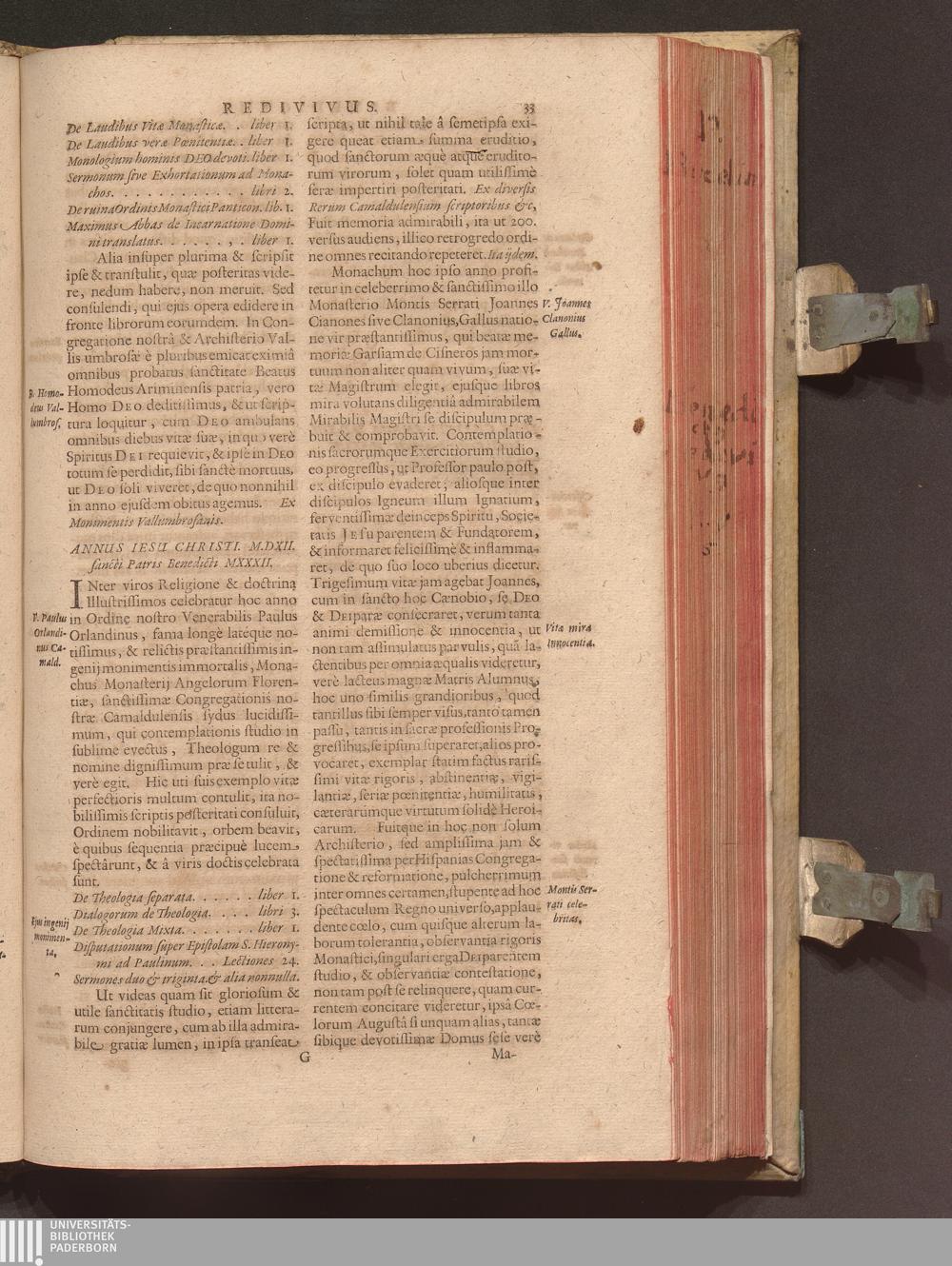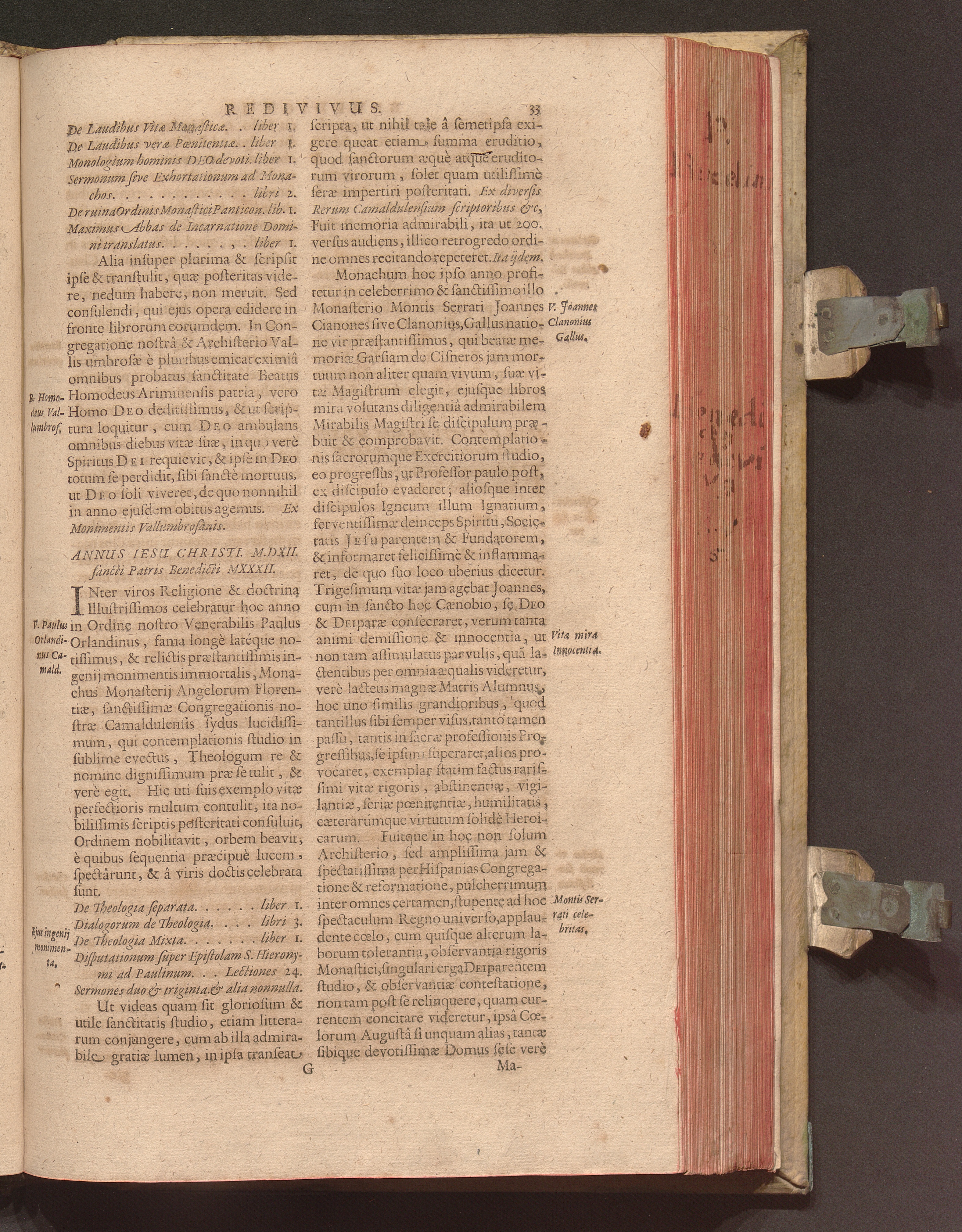Benedictus Redivivus Hoc est: Benedictinj Ordinis Vetustißimi Amplißimique, Nostra, ac supera ætate Jmmarcescibilis Vigor, ac Viror : Anniversariâ Vernantiâ Chronologicè comprobatus, ac demonstratus Ab anno Christi M. D. Ad Præsentem Usque Ætatem, Et Annos Nostros, Jn Quo ... Operationes Jn Effusione Mirabili sui Spiritus ... quam compendiosissimè exhibe[n]tur / Opera, & Studio R. P. F. Gabrielis Bucelini Ascetæ Benedictini Imperialis Monasterij VVeingartensis Prioris S. Joannis Bapt. in Oppido Rhætiæ Superioris Veldkirchensi