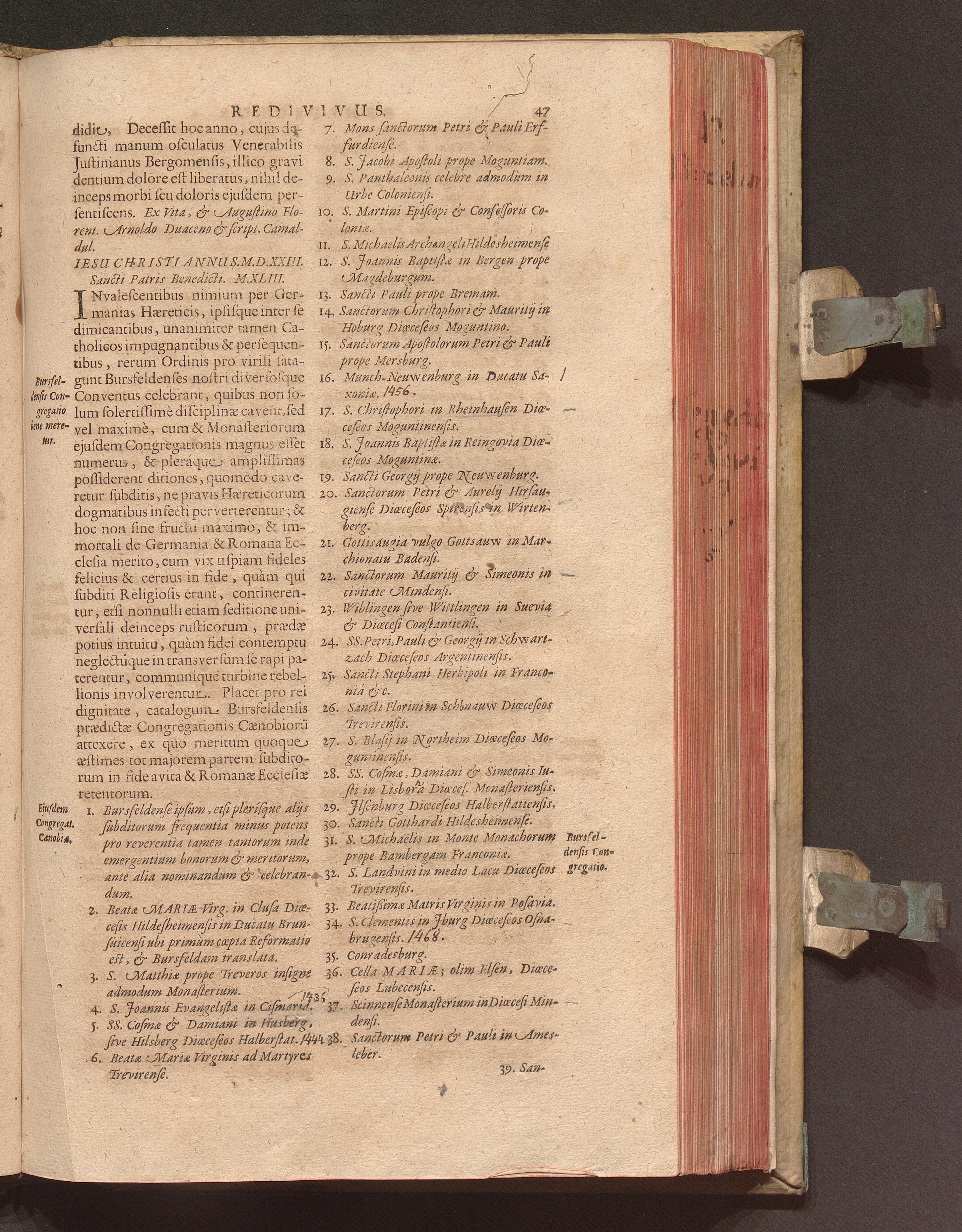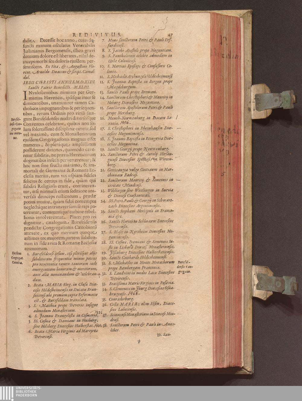 Benedictus Redivivus Hoc est: Benedictinj Ordinis Vetustißimi Amplißimique, Nostra, ac supera ætate Jmmarcescibilis Vigor, ac Viror : Anniversariâ Vernantiâ Chronologicè comprobatus, ac demonstratus Ab anno Christi M. D. Ad Præsentem Usque Ætatem, Et Annos Nostros, Jn Quo ... Operationes Jn Effusione Mirabili sui Spiritus ... quam compendiosissimè exhibe[n]tur / Opera, & Studio R. P. F. Gabrielis Bucelini Ascetæ Benedictini Imperialis Monasterij VVeingartensis Prioris S. Joannis Bapt. in Oppido Rhætiæ Superioris Veldkirchensi