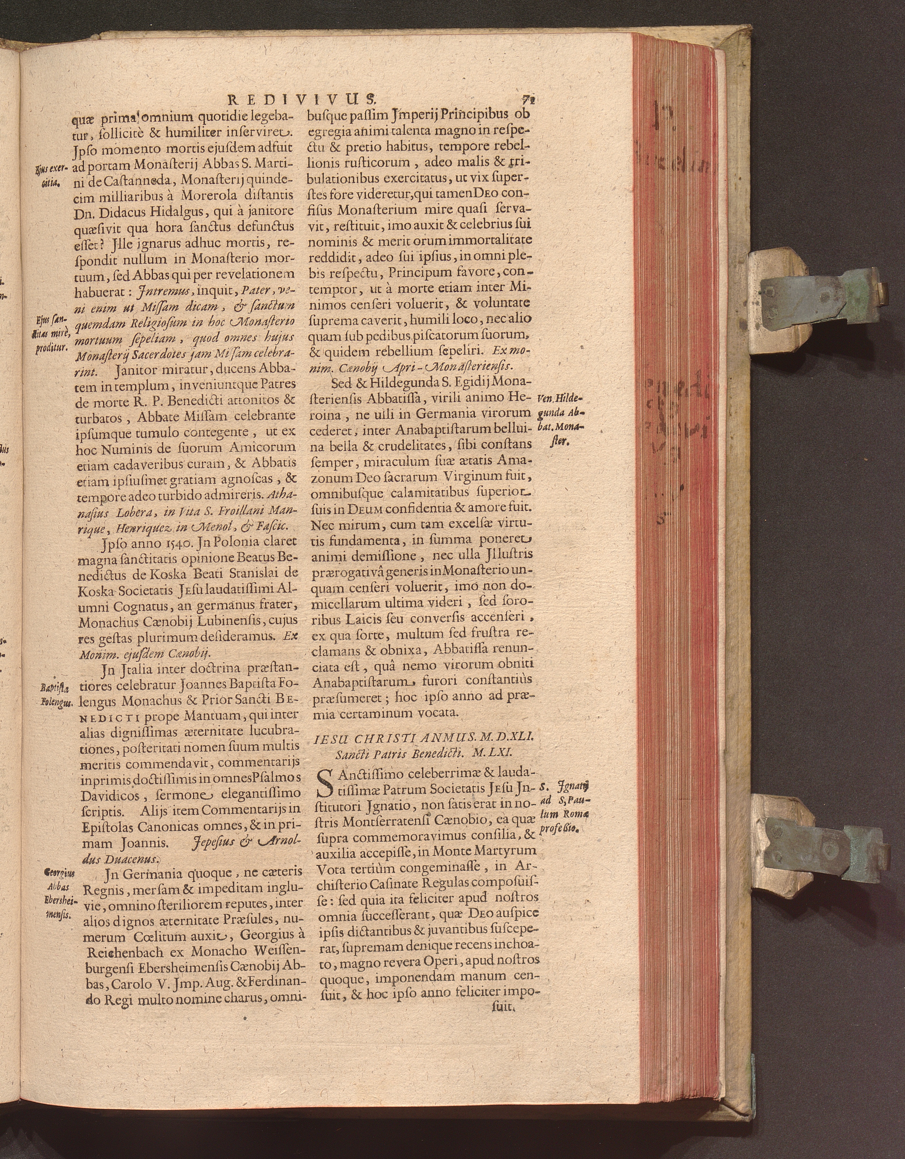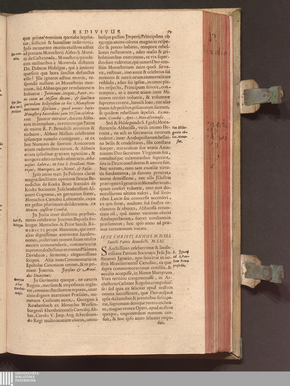 Benedictus Redivivus Hoc est: Benedictinj Ordinis Vetustißimi Amplißimique, Nostra, ac supera ætate Jmmarcescibilis Vigor, ac Viror : Anniversariâ Vernantiâ Chronologicè comprobatus, ac demonstratus Ab anno Christi M. D. Ad Præsentem Usque Ætatem, Et Annos Nostros, Jn Quo ... Operationes Jn Effusione Mirabili sui Spiritus ... quam compendiosissimè exhibe[n]tur / Opera, & Studio R. P. F. Gabrielis Bucelini Ascetæ Benedictini Imperialis Monasterij VVeingartensis Prioris S. Joannis Bapt. in Oppido Rhætiæ Superioris Veldkirchensi