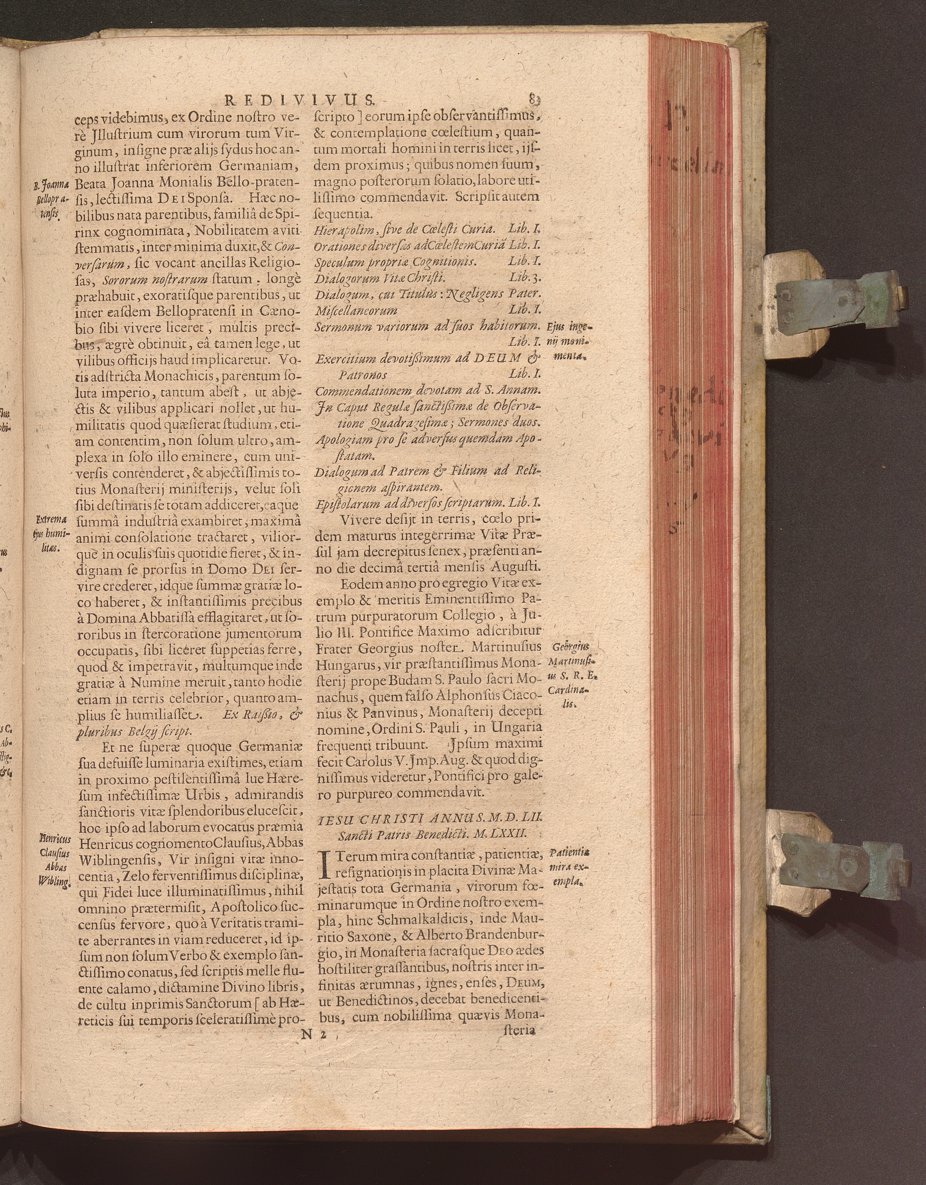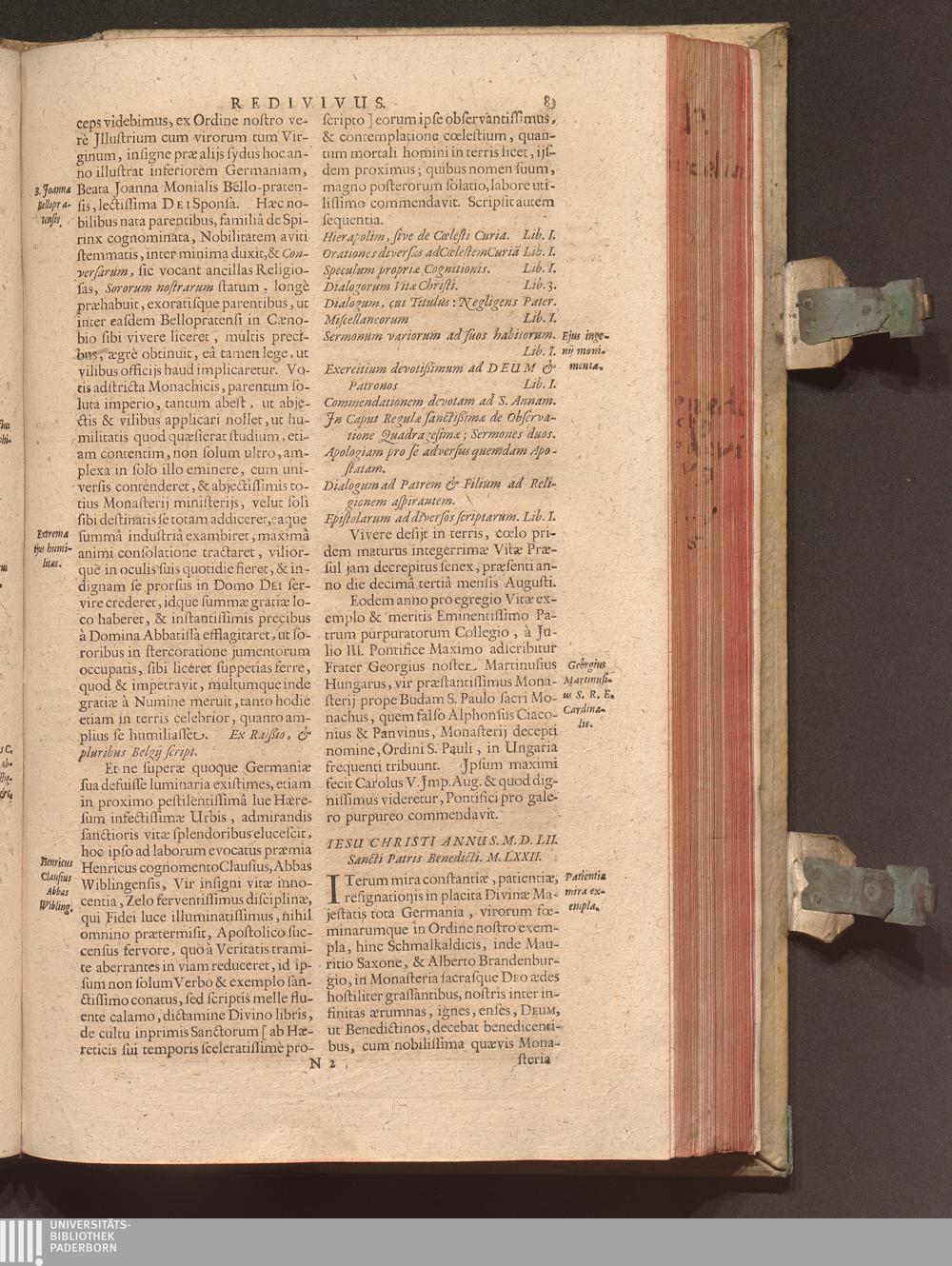 Benedictus Redivivus Hoc est: Benedictinj Ordinis Vetustißimi Amplißimique, Nostra, ac supera ætate Jmmarcescibilis Vigor, ac Viror : Anniversariâ Vernantiâ Chronologicè comprobatus, ac demonstratus Ab anno Christi M. D. Ad Præsentem Usque Ætatem, Et Annos Nostros, Jn Quo ... Operationes Jn Effusione Mirabili sui Spiritus ... quam compendiosissimè exhibe[n]tur / Opera, & Studio R. P. F. Gabrielis Bucelini Ascetæ Benedictini Imperialis Monasterij VVeingartensis Prioris S. Joannis Bapt. in Oppido Rhætiæ Superioris Veldkirchensi