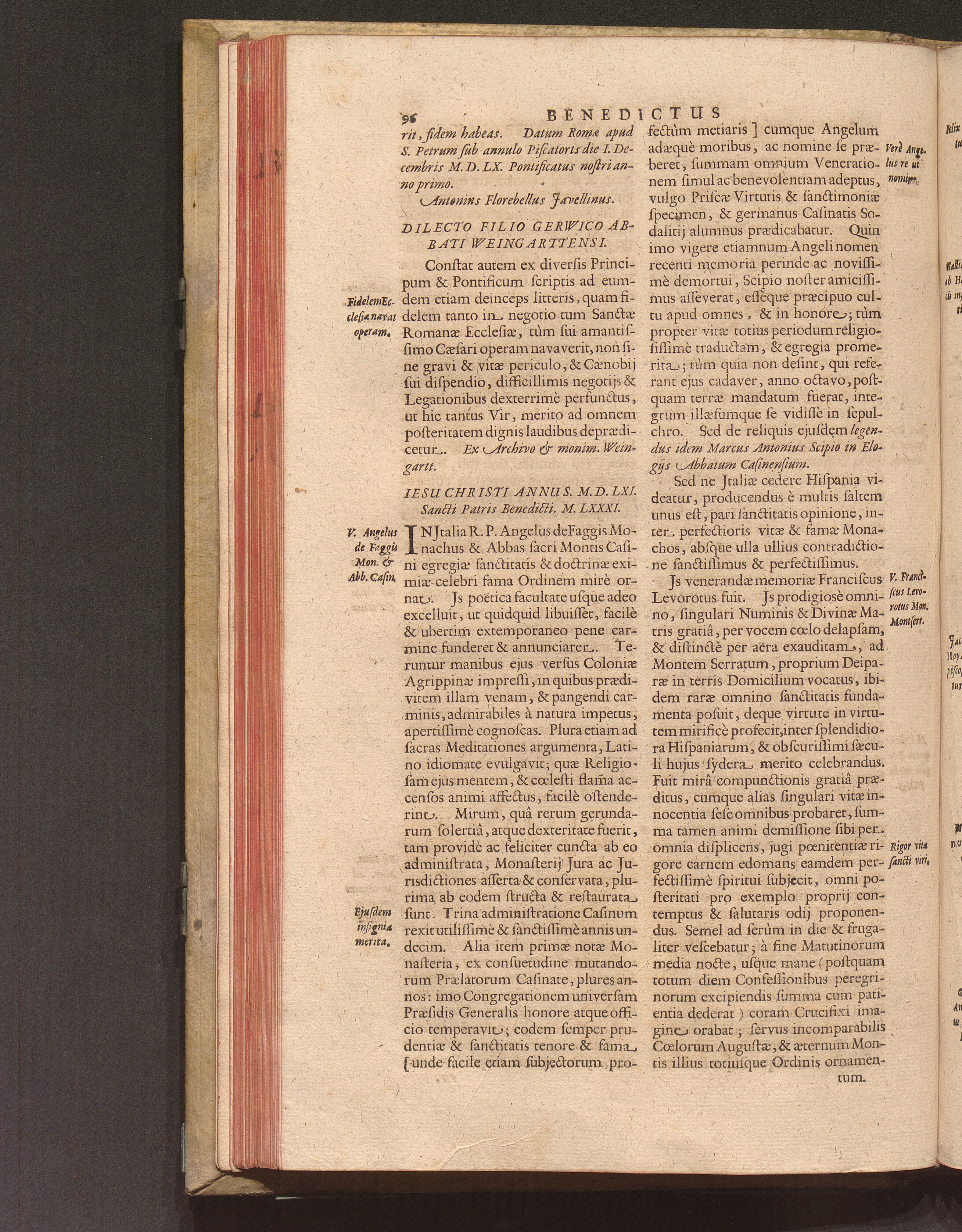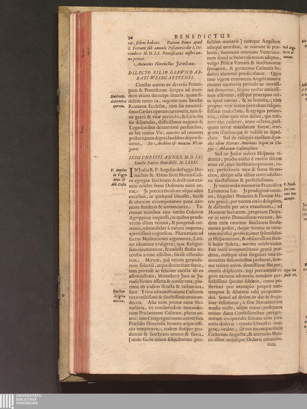 Benedictus Redivivus Hoc est: Benedictinj Ordinis Vetustißimi Amplißimique, Nostra, ac supera ætate Jmmarcescibilis Vigor, ac Viror : Anniversariâ Vernantiâ Chronologicè comprobatus, ac demonstratus Ab anno Christi M. D. Ad Præsentem Usque Ætatem, Et Annos Nostros, Jn Quo ... Operationes Jn Effusione Mirabili sui Spiritus ... quam compendiosissimè exhibe[n]tur / Opera, & Studio R. P. F. Gabrielis Bucelini Ascetæ Benedictini Imperialis Monasterij VVeingartensis Prioris S. Joannis Bapt. in Oppido Rhætiæ Superioris Veldkirchensi