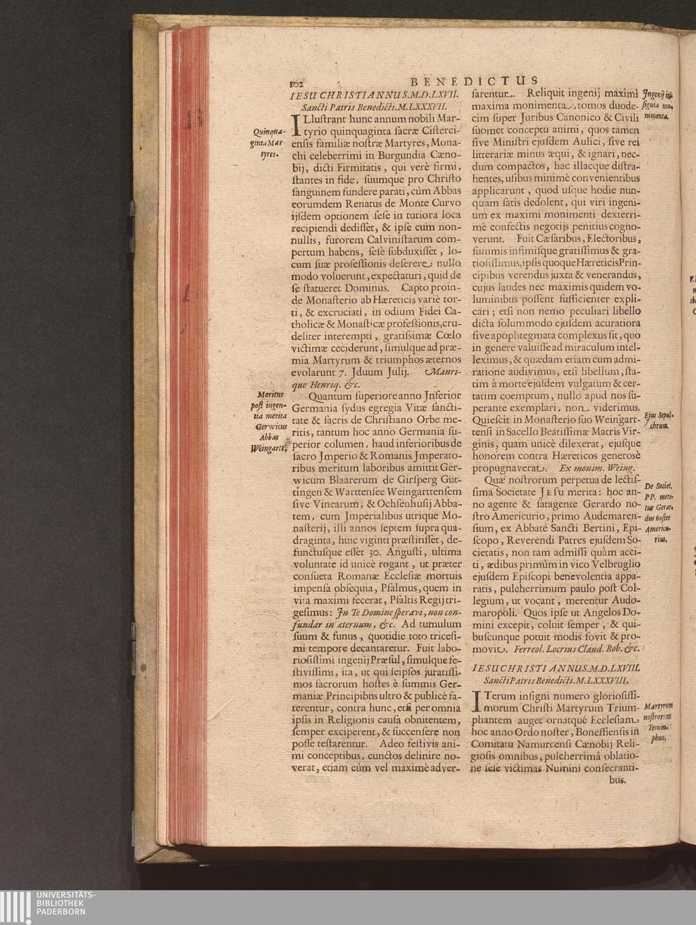 Benedictus Redivivus Hoc est: Benedictinj Ordinis Vetustißimi Amplißimique, Nostra, ac supera ætate Jmmarcescibilis Vigor, ac Viror : Anniversariâ Vernantiâ Chronologicè comprobatus, ac demonstratus Ab anno Christi M. D. Ad Præsentem Usque Ætatem, Et Annos Nostros, Jn Quo ... Operationes Jn Effusione Mirabili sui Spiritus ... quam compendiosissimè exhibe[n]tur / Opera, & Studio R. P. F. Gabrielis Bucelini Ascetæ Benedictini Imperialis Monasterij VVeingartensis Prioris S. Joannis Bapt. in Oppido Rhætiæ Superioris Veldkirchensi