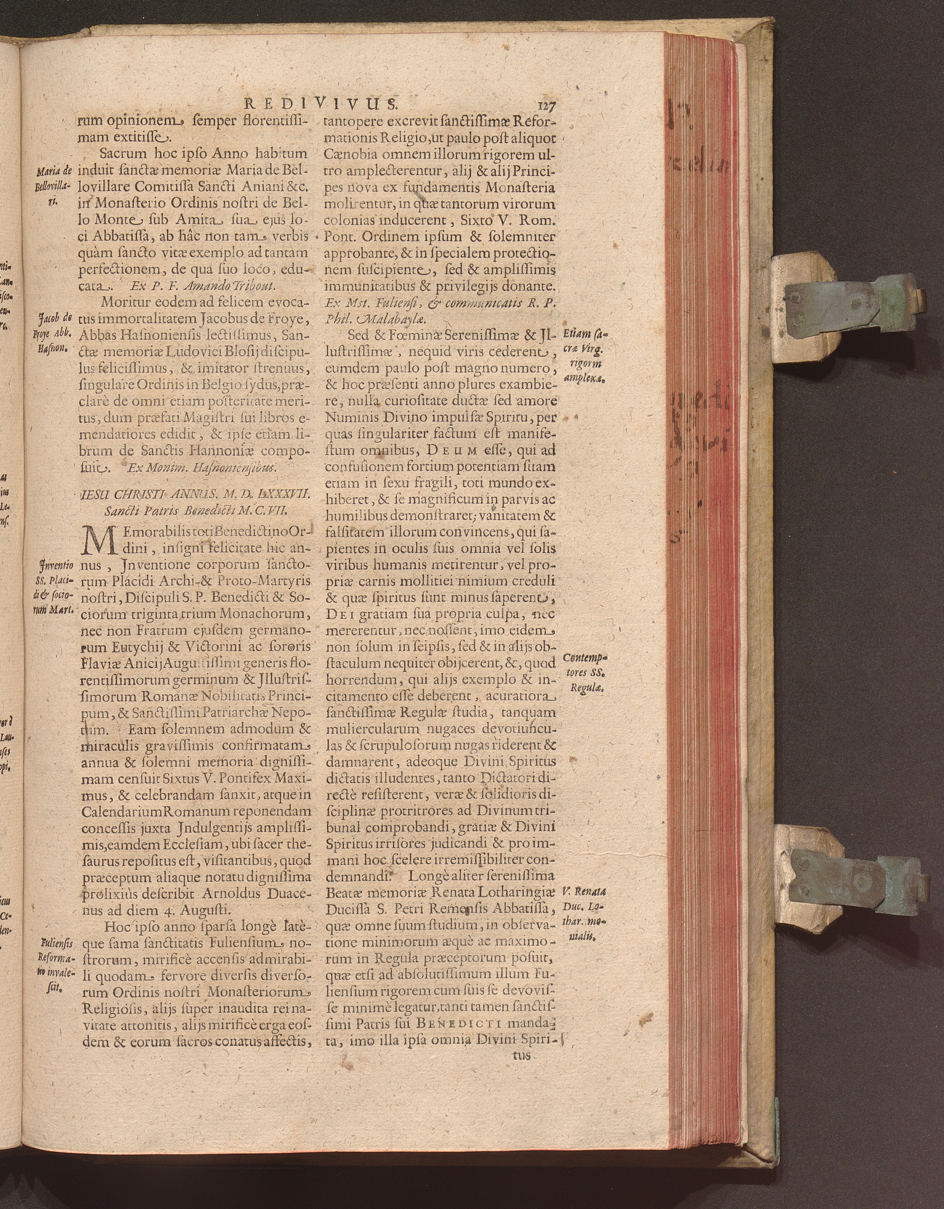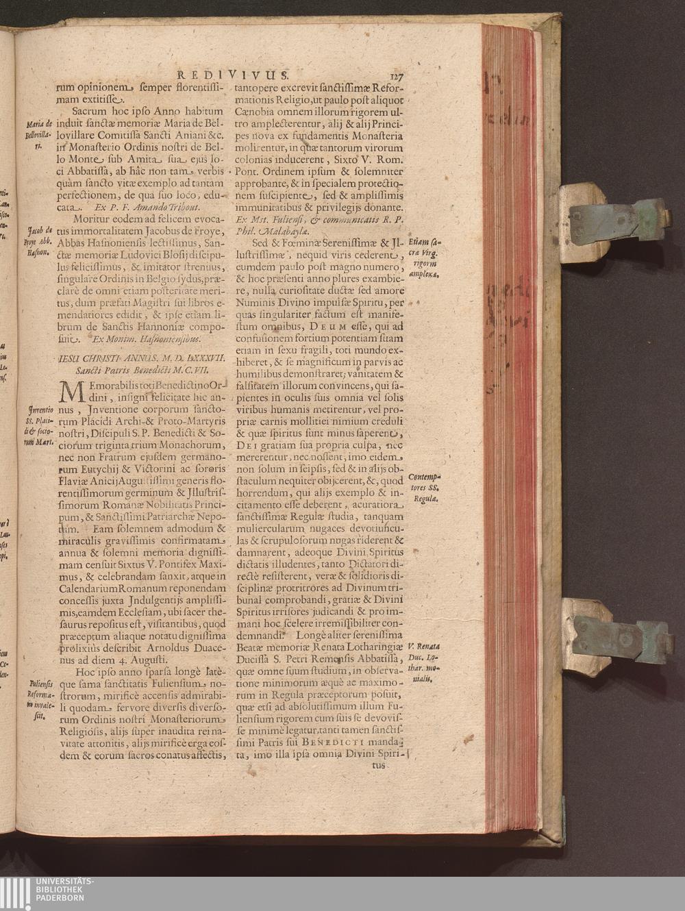 Benedictus Redivivus Hoc est: Benedictinj Ordinis Vetustißimi Amplißimique, Nostra, ac supera ætate Jmmarcescibilis Vigor, ac Viror : Anniversariâ Vernantiâ Chronologicè comprobatus, ac demonstratus Ab anno Christi M. D. Ad Præsentem Usque Ætatem, Et Annos Nostros, Jn Quo ... Operationes Jn Effusione Mirabili sui Spiritus ... quam compendiosissimè exhibe[n]tur / Opera, & Studio R. P. F. Gabrielis Bucelini Ascetæ Benedictini Imperialis Monasterij VVeingartensis Prioris S. Joannis Bapt. in Oppido Rhætiæ Superioris Veldkirchensi