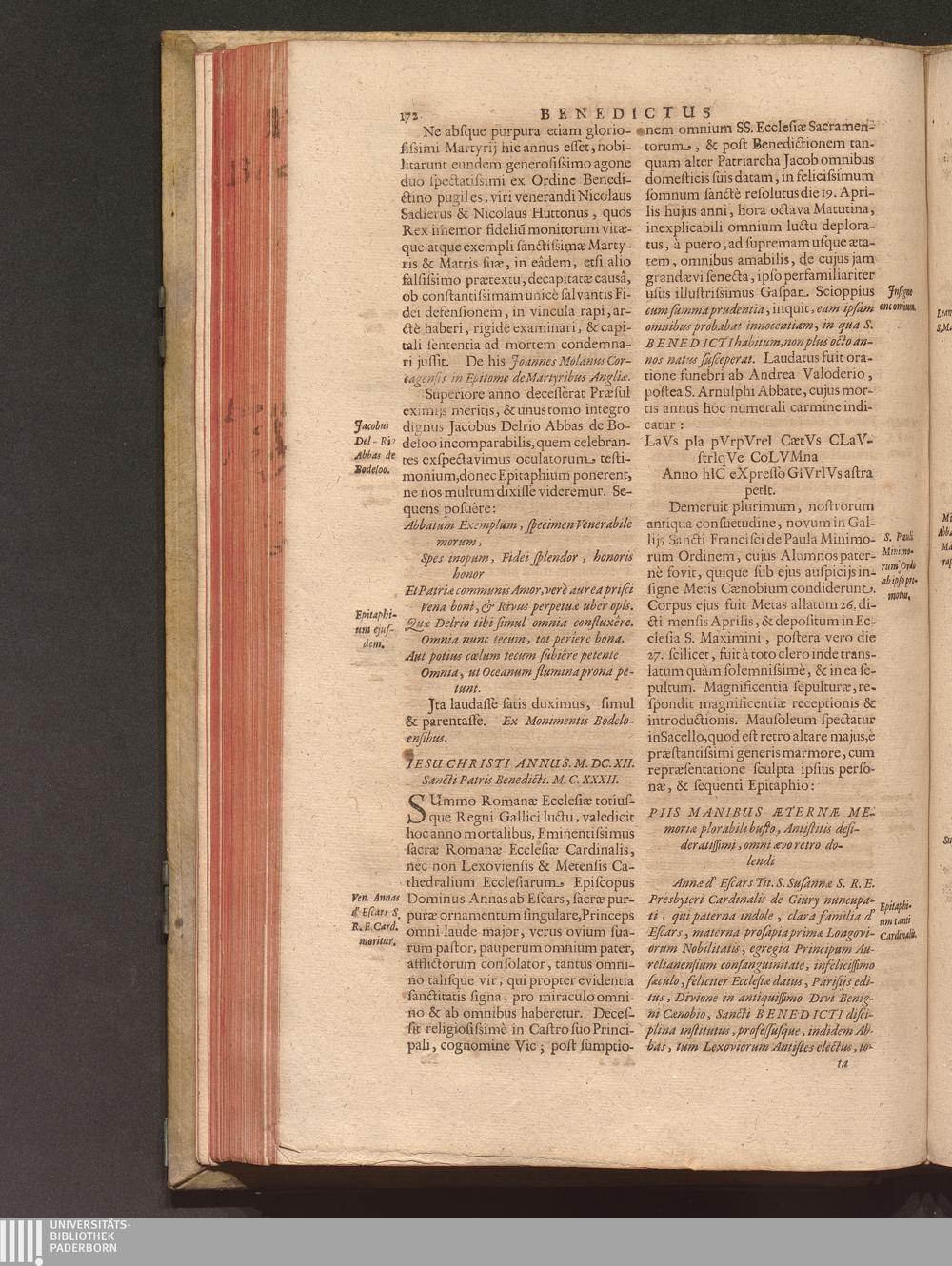 Benedictus Redivivus Hoc est: Benedictinj Ordinis Vetustißimi Amplißimique, Nostra, ac supera ætate Jmmarcescibilis Vigor, ac Viror : Anniversariâ Vernantiâ Chronologicè comprobatus, ac demonstratus Ab anno Christi M. D. Ad Præsentem Usque Ætatem, Et Annos Nostros, Jn Quo ... Operationes Jn Effusione Mirabili sui Spiritus ... quam compendiosissimè exhibe[n]tur / Opera, & Studio R. P. F. Gabrielis Bucelini Ascetæ Benedictini Imperialis Monasterij VVeingartensis Prioris S. Joannis Bapt. in Oppido Rhætiæ Superioris Veldkirchensi