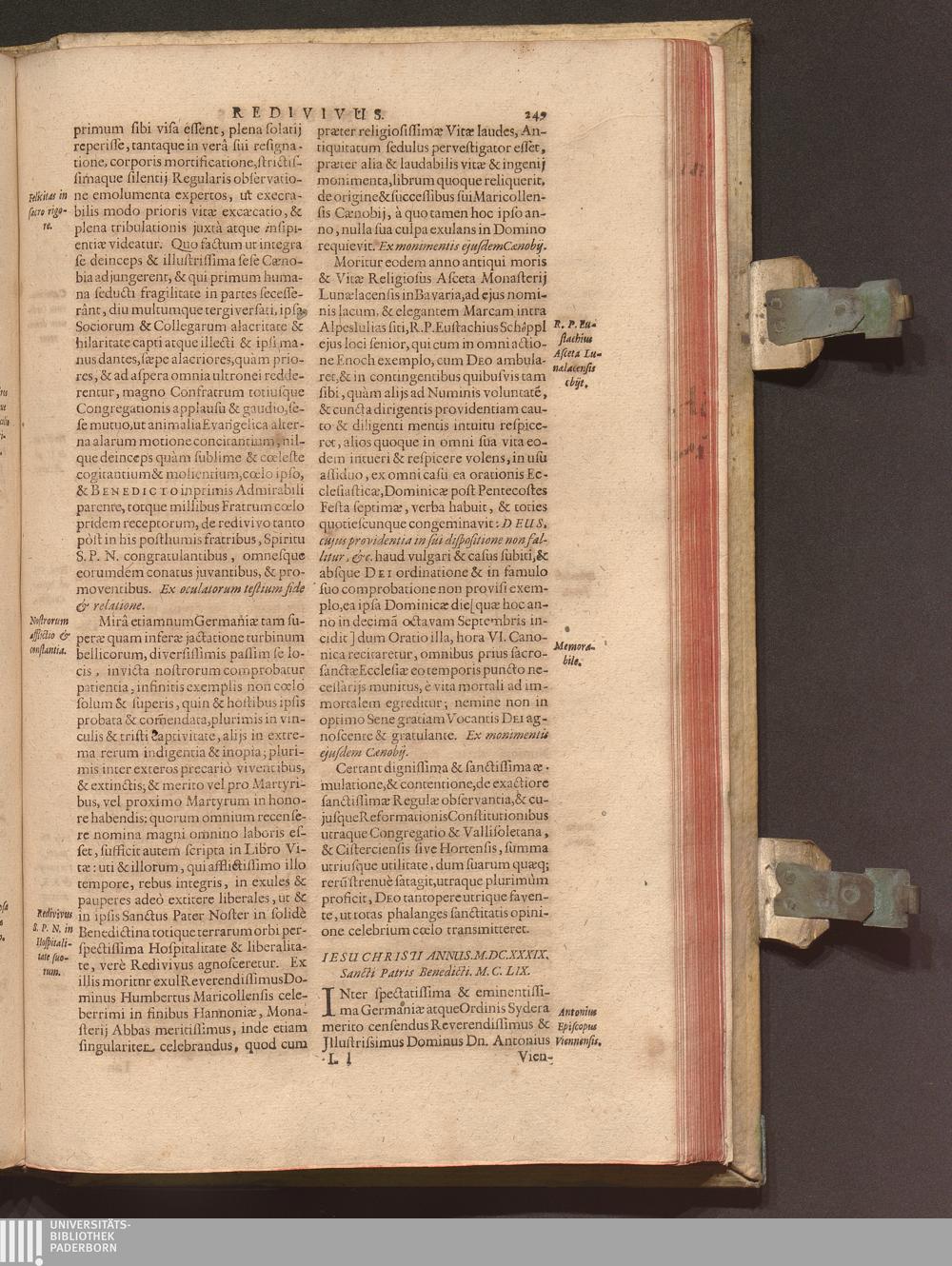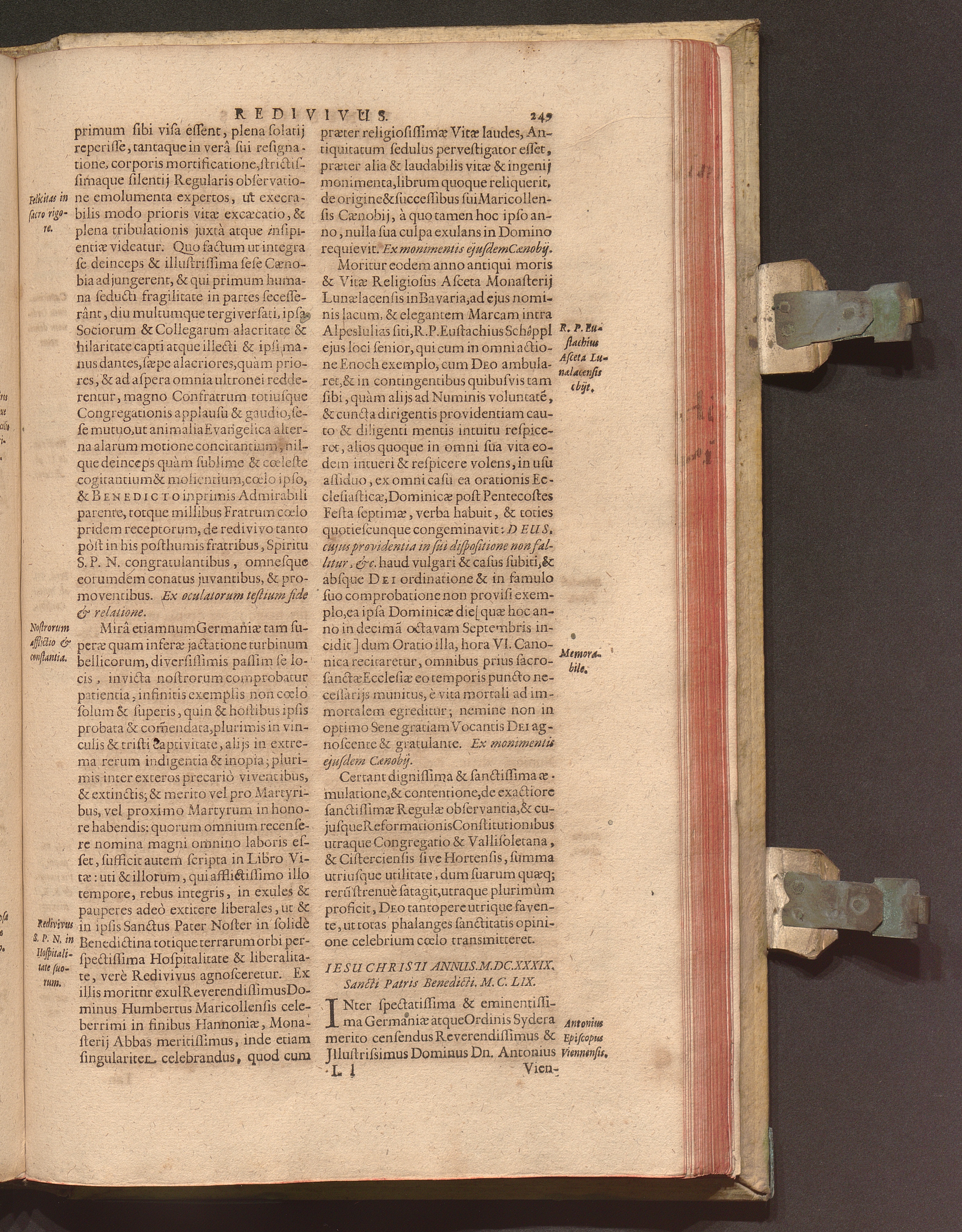 Benedictus Redivivus Hoc est: Benedictinj Ordinis Vetustißimi Amplißimique, Nostra, ac supera ætate Jmmarcescibilis Vigor, ac Viror : Anniversariâ Vernantiâ Chronologicè comprobatus, ac demonstratus Ab anno Christi M. D. Ad Præsentem Usque Ætatem, Et Annos Nostros, Jn Quo ... Operationes Jn Effusione Mirabili sui Spiritus ... quam compendiosissimè exhibe[n]tur / Opera, & Studio R. P. F. Gabrielis Bucelini Ascetæ Benedictini Imperialis Monasterij VVeingartensis Prioris S. Joannis Bapt. in Oppido Rhætiæ Superioris Veldkirchensi