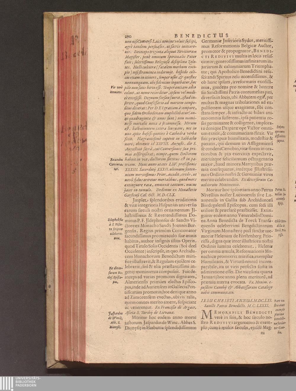 Benedictus Redivivus Hoc est: Benedictinj Ordinis Vetustißimi Amplißimique, Nostra, ac supera ætate Jmmarcescibilis Vigor, ac Viror : Anniversariâ Vernantiâ Chronologicè comprobatus, ac demonstratus Ab anno Christi M. D. Ad Præsentem Usque Ætatem, Et Annos Nostros, Jn Quo ... Operationes Jn Effusione Mirabili sui Spiritus ... quam compendiosissimè exhibe[n]tur / Opera, & Studio R. P. F. Gabrielis Bucelini Ascetæ Benedictini Imperialis Monasterij VVeingartensis Prioris S. Joannis Bapt. in Oppido Rhætiæ Superioris Veldkirchensi
