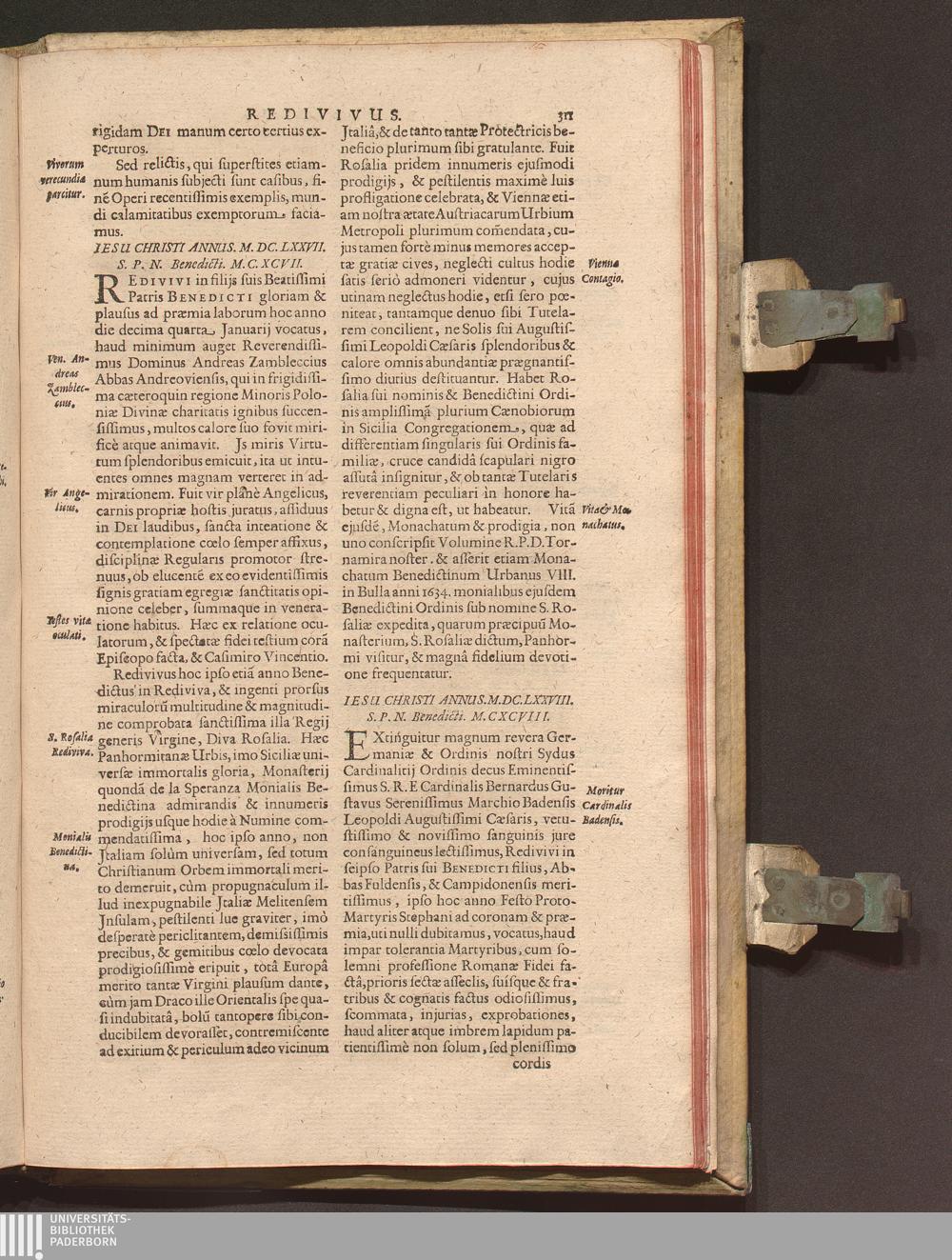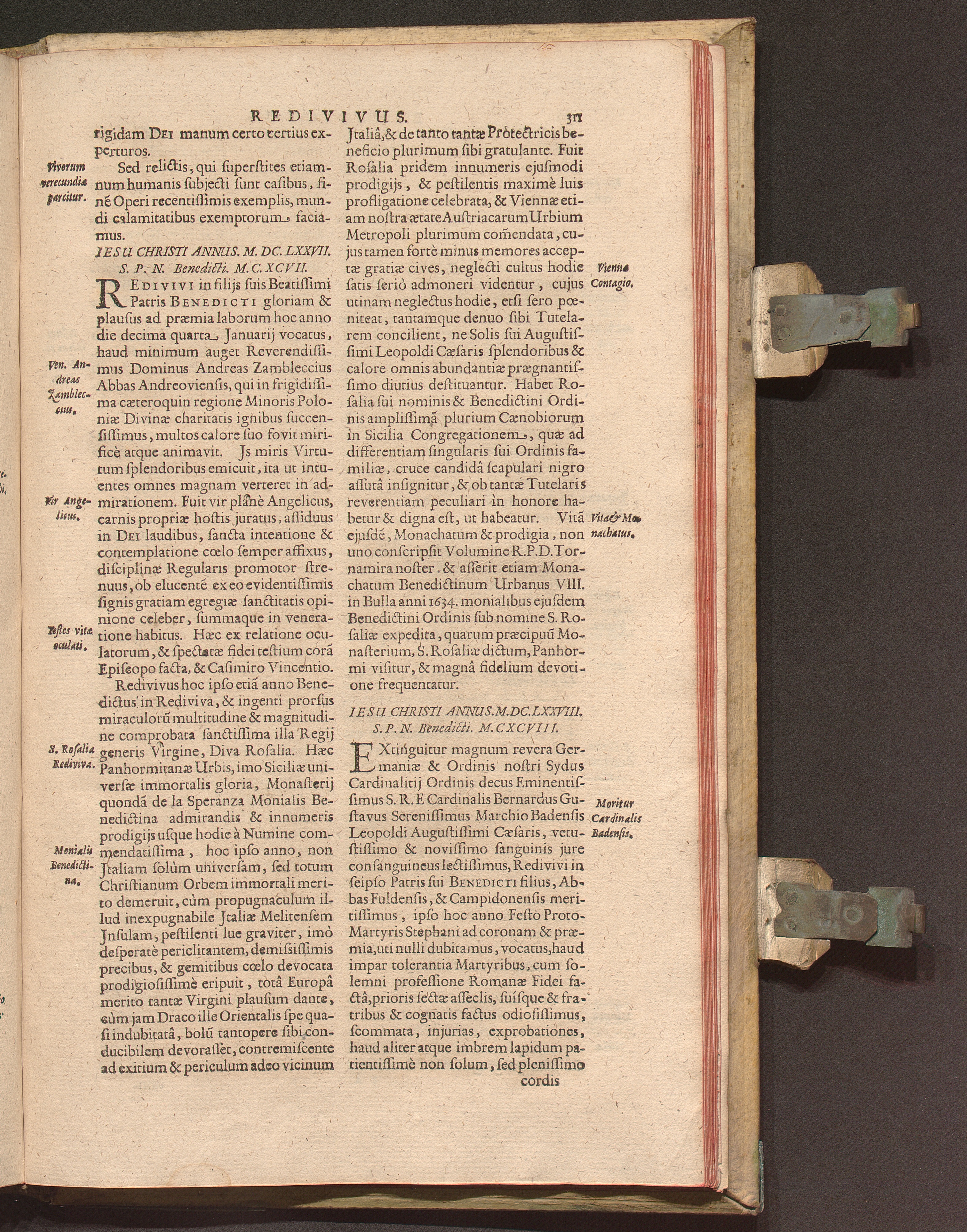 Benedictus Redivivus Hoc est: Benedictinj Ordinis Vetustißimi Amplißimique, Nostra, ac supera ætate Jmmarcescibilis Vigor, ac Viror : Anniversariâ Vernantiâ Chronologicè comprobatus, ac demonstratus Ab anno Christi M. D. Ad Præsentem Usque Ætatem, Et Annos Nostros, Jn Quo ... Operationes Jn Effusione Mirabili sui Spiritus ... quam compendiosissimè exhibe[n]tur / Opera, & Studio R. P. F. Gabrielis Bucelini Ascetæ Benedictini Imperialis Monasterij VVeingartensis Prioris S. Joannis Bapt. in Oppido Rhætiæ Superioris Veldkirchensi