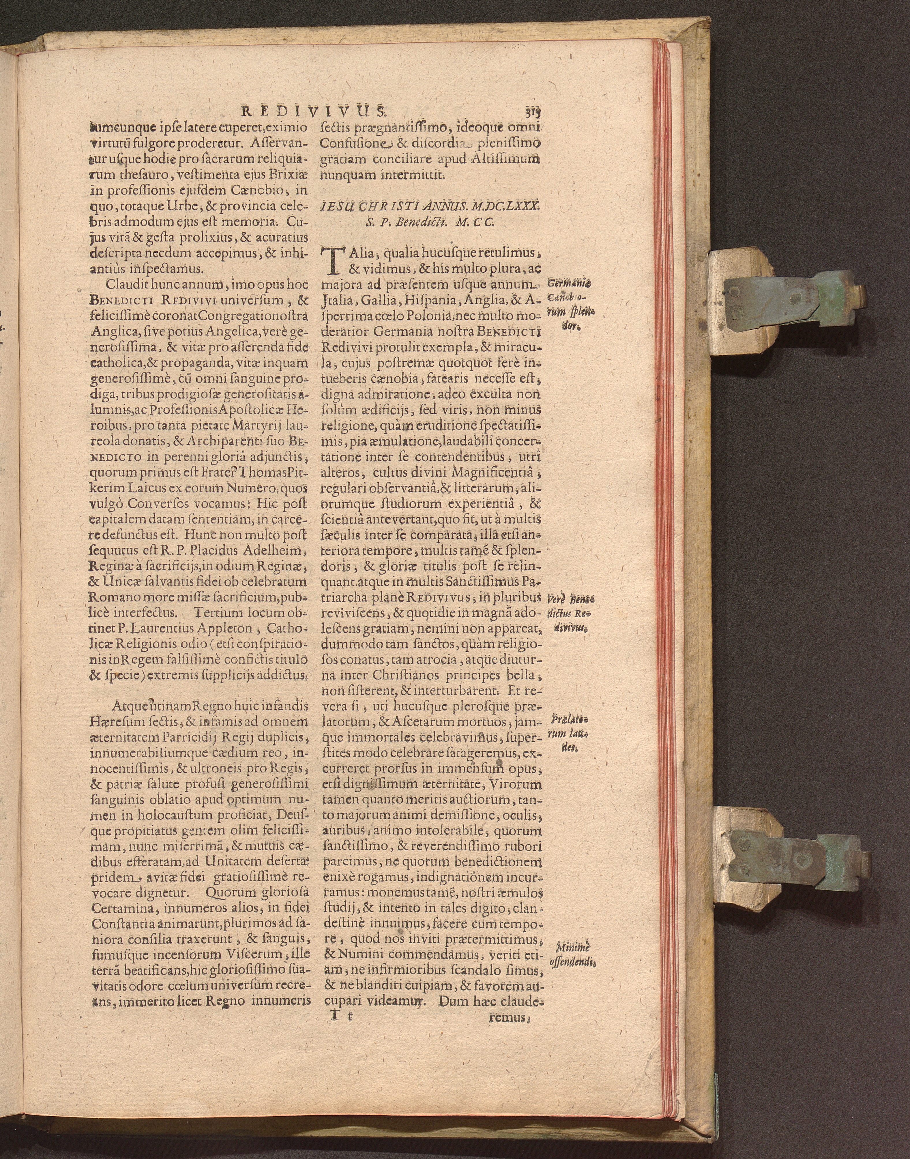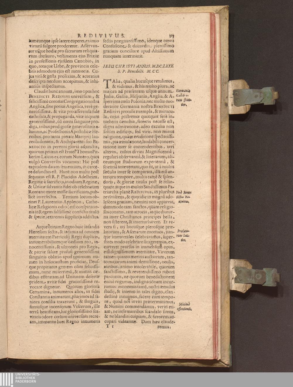 Benedictus Redivivus Hoc est: Benedictinj Ordinis Vetustißimi Amplißimique, Nostra, ac supera ætate Jmmarcescibilis Vigor, ac Viror : Anniversariâ Vernantiâ Chronologicè comprobatus, ac demonstratus Ab anno Christi M. D. Ad Præsentem Usque Ætatem, Et Annos Nostros, Jn Quo ... Operationes Jn Effusione Mirabili sui Spiritus ... quam compendiosissimè exhibe[n]tur / Opera, & Studio R. P. F. Gabrielis Bucelini Ascetæ Benedictini Imperialis Monasterij VVeingartensis Prioris S. Joannis Bapt. in Oppido Rhætiæ Superioris Veldkirchensi