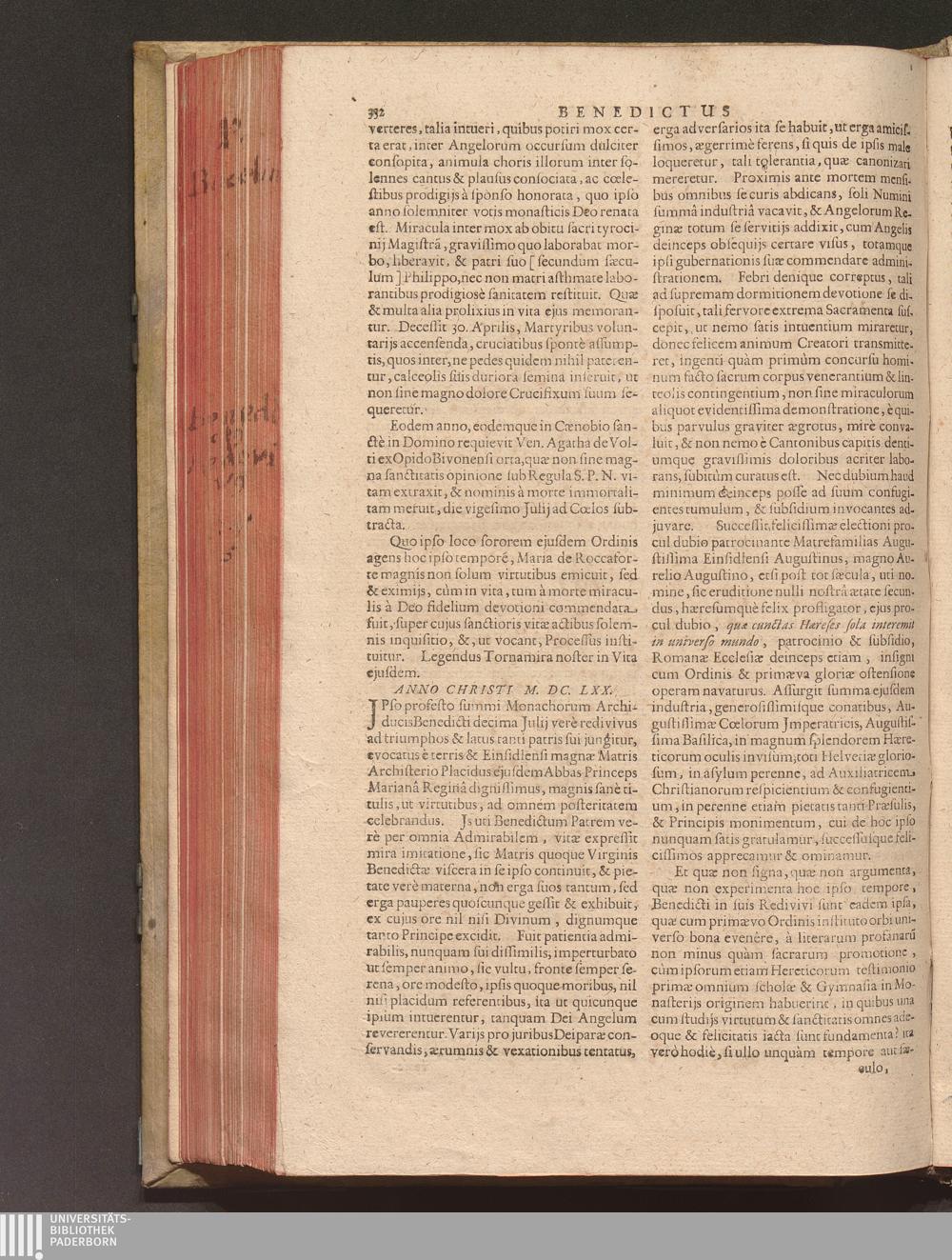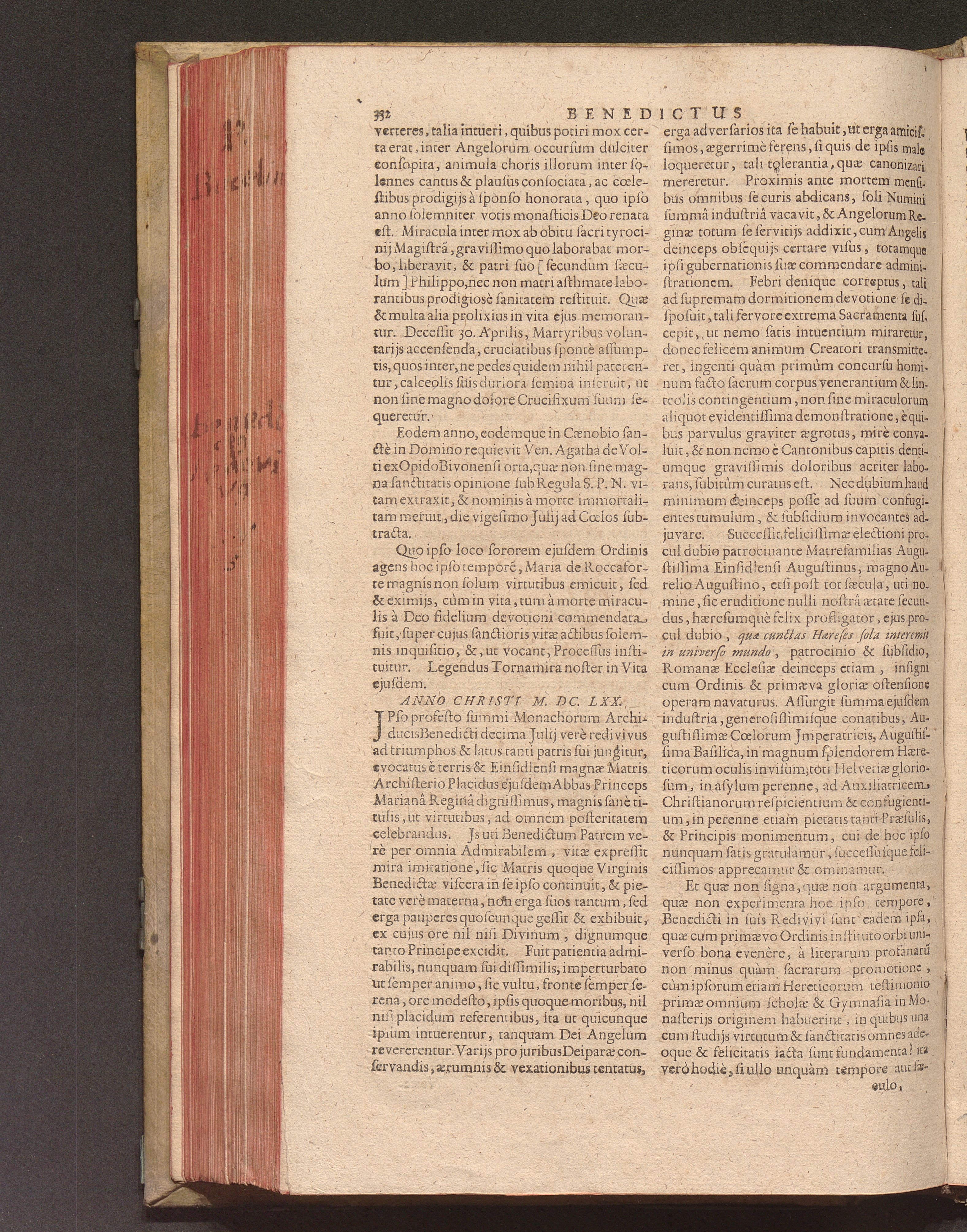 Benedictus Redivivus Hoc est: Benedictinj Ordinis Vetustißimi Amplißimique, Nostra, ac supera ætate Jmmarcescibilis Vigor, ac Viror : Anniversariâ Vernantiâ Chronologicè comprobatus, ac demonstratus Ab anno Christi M. D. Ad Præsentem Usque Ætatem, Et Annos Nostros, Jn Quo ... Operationes Jn Effusione Mirabili sui Spiritus ... quam compendiosissimè exhibe[n]tur / Opera, & Studio R. P. F. Gabrielis Bucelini Ascetæ Benedictini Imperialis Monasterij VVeingartensis Prioris S. Joannis Bapt. in Oppido Rhætiæ Superioris Veldkirchensi
