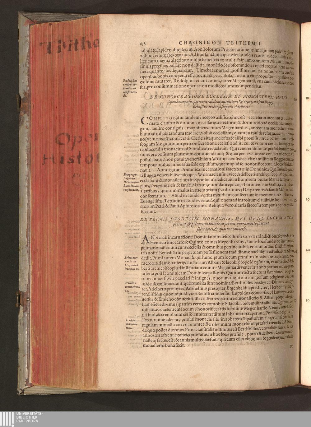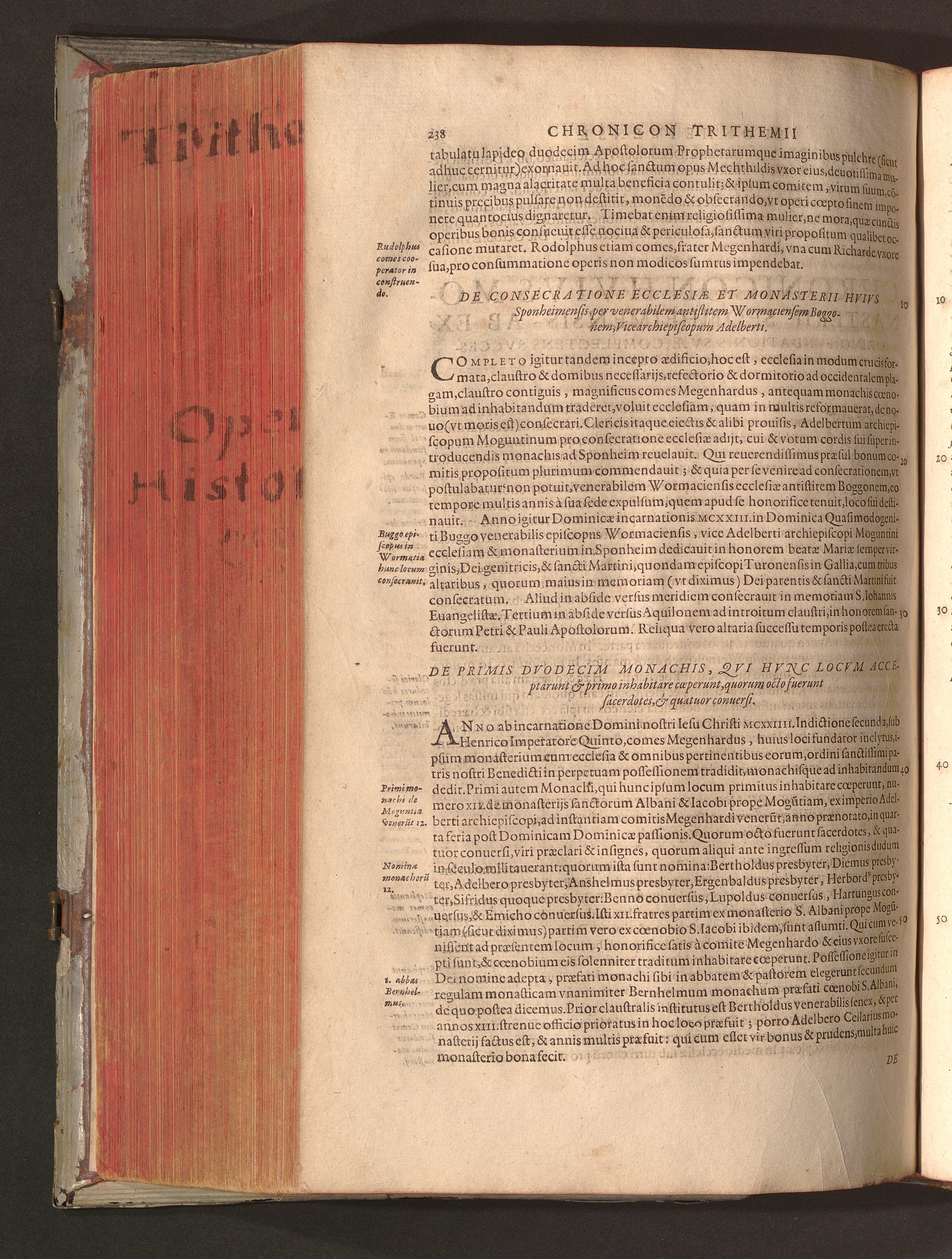 2 (1601) Iohannis Trithemii Spanheimensis Primo, Deinde D. Iacobi Maioris Apvd Herbipolin Abbatis, viri suo æuo doctissimi Secvndæ Partis Chronica Insignia Dvo : I. Coenobii Hirsavgiensis, Diœcesis Spirensis: eius fundationem & progressum ab Anno Christi DCCCXXX. vsque ad Annum MCCCLXX. II. Coenobii Spanheimensis, Diœcesis Moguntinensis: eius fundationem & progressum ab Anno Christi MCXXIIII. vsque ad Annum MDXXVI. vel potius res ab octo illis sæculis in tota Ecclesia & Imperio memorabiliter gestas, complectens; Qvorvm Privs Collatione Archetypi Ipsivs Auctoris manuscripti correctius & plenius; posterius verò istud nunc primùm è tenebris erutum, ob insignem vtilitatem optimâ fide in lucem editur; Accedunt Epistolæ eiusdem Familiares, ab excessu eius de cœnobio Spanheimensi ad Principes clarosque viros scriptæ, historiis eius æui referctæ