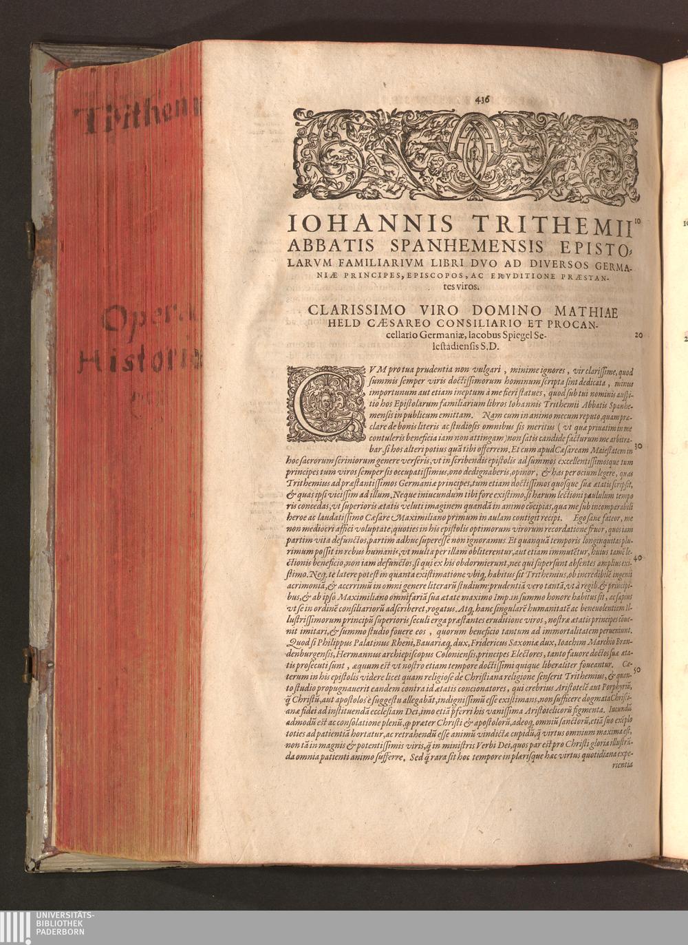 2 (1601) Iohannis Trithemii Spanheimensis Primo, Deinde D. Iacobi Maioris Apvd Herbipolin Abbatis, viri suo æuo doctissimi Secvndæ Partis Chronica Insignia Dvo : I. Coenobii Hirsavgiensis, Diœcesis Spirensis: eius fundationem & progressum ab Anno Christi DCCCXXX. vsque ad Annum MCCCLXX. II. Coenobii Spanheimensis, Diœcesis Moguntinensis: eius fundationem & progressum ab Anno Christi MCXXIIII. vsque ad Annum MDXXVI. vel potius res ab octo illis sæculis in tota Ecclesia & Imperio memorabiliter gestas, complectens; Qvorvm Privs Collatione Archetypi Ipsivs Auctoris manuscripti correctius & plenius; posterius verò istud nunc primùm è tenebris erutum, ob insignem vtilitatem optimâ fide in lucem editur; Accedunt Epistolæ eiusdem Familiares, ab excessu eius de cœnobio Spanheimensi ad Principes clarosque viros scriptæ, historiis eius æui referctæ