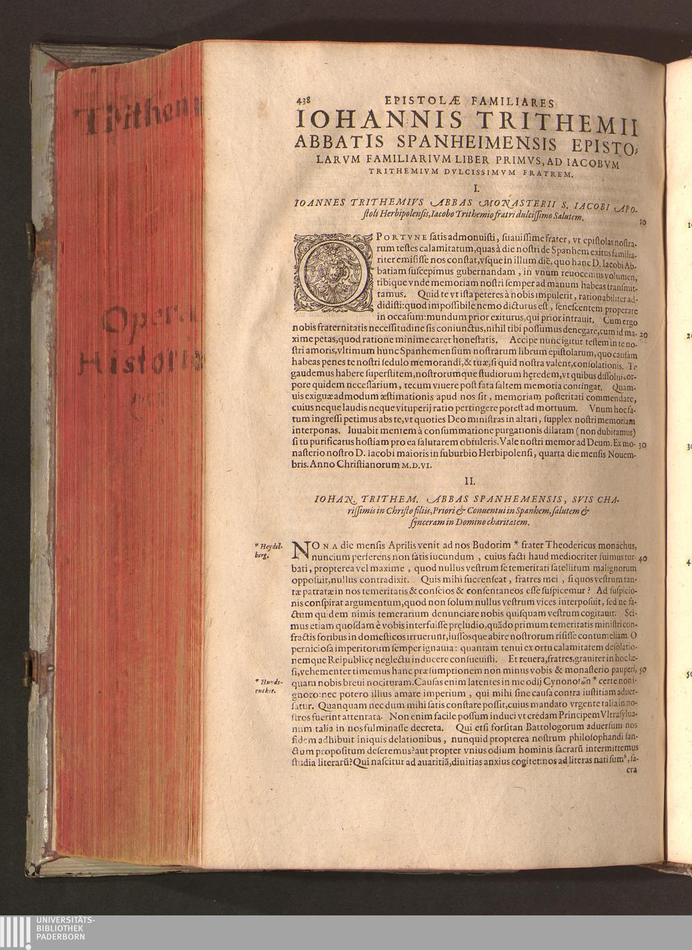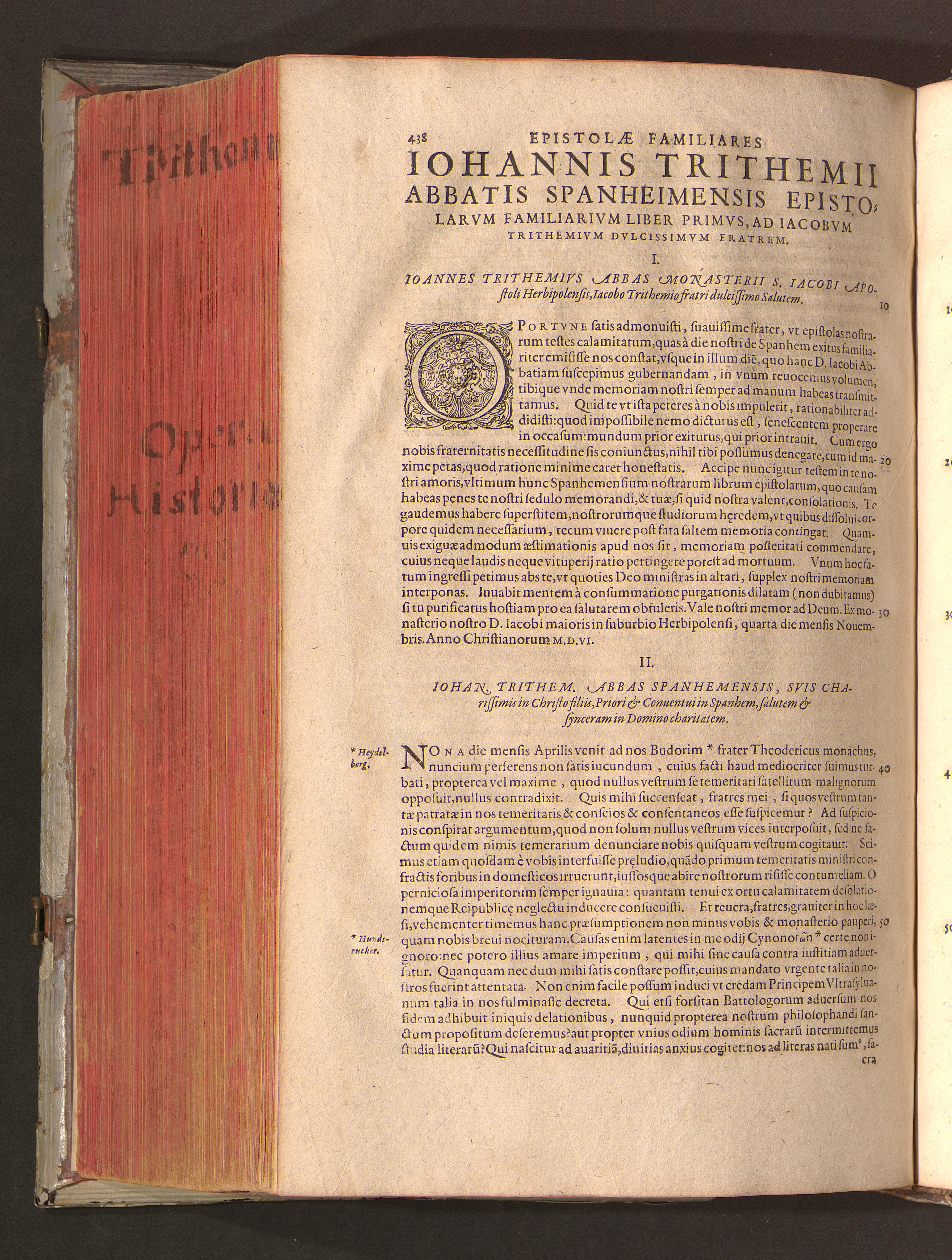 2 (1601) Iohannis Trithemii Spanheimensis Primo, Deinde D. Iacobi Maioris Apvd Herbipolin Abbatis, viri suo æuo doctissimi Secvndæ Partis Chronica Insignia Dvo : I. Coenobii Hirsavgiensis, Diœcesis Spirensis: eius fundationem & progressum ab Anno Christi DCCCXXX. vsque ad Annum MCCCLXX. II. Coenobii Spanheimensis, Diœcesis Moguntinensis: eius fundationem & progressum ab Anno Christi MCXXIIII. vsque ad Annum MDXXVI. vel potius res ab octo illis sæculis in tota Ecclesia & Imperio memorabiliter gestas, complectens; Qvorvm Privs Collatione Archetypi Ipsivs Auctoris manuscripti correctius & plenius; posterius verò istud nunc primùm è tenebris erutum, ob insignem vtilitatem optimâ fide in lucem editur; Accedunt Epistolæ eiusdem Familiares, ab excessu eius de cœnobio Spanheimensi ad Principes clarosque viros scriptæ, historiis eius æui referctæ