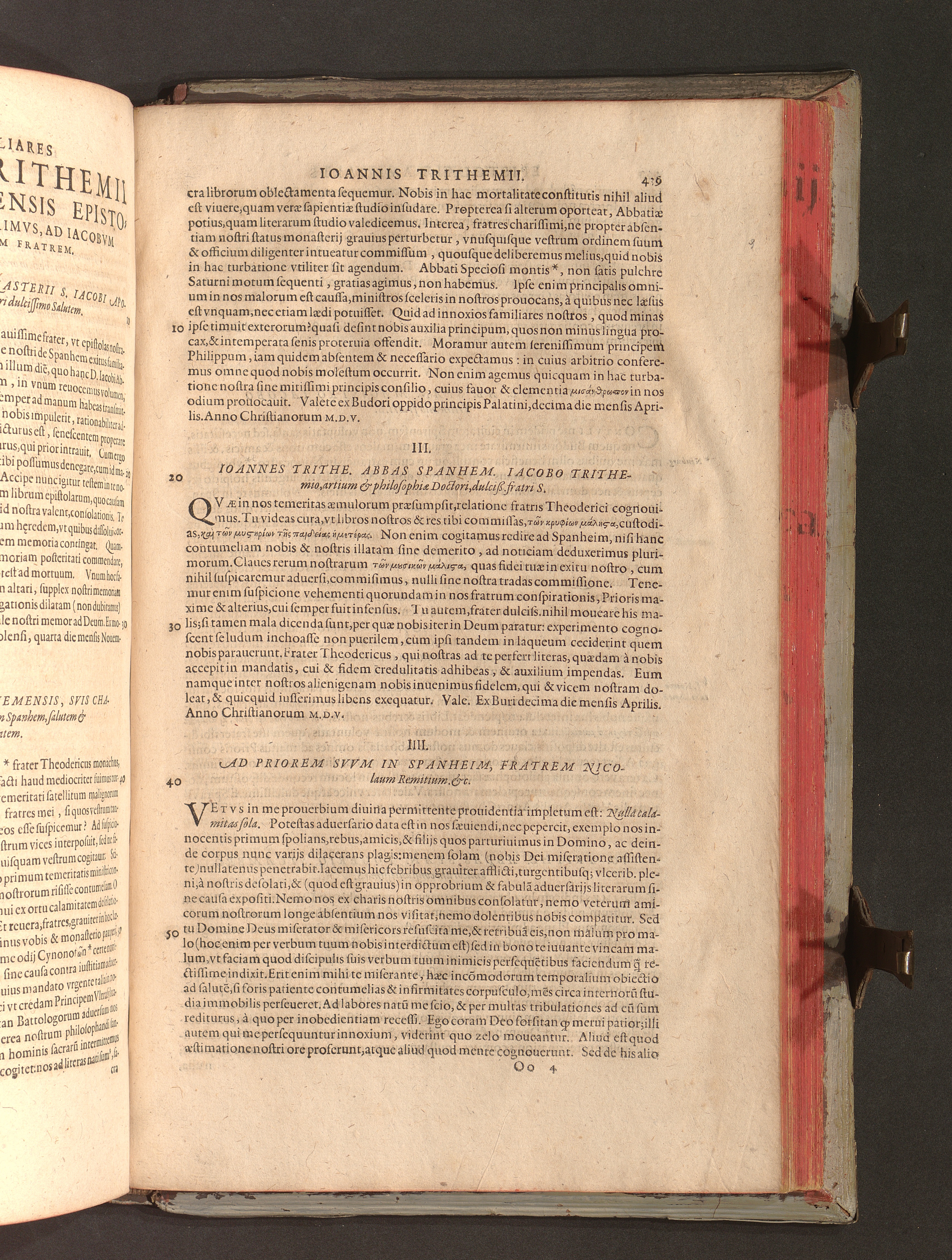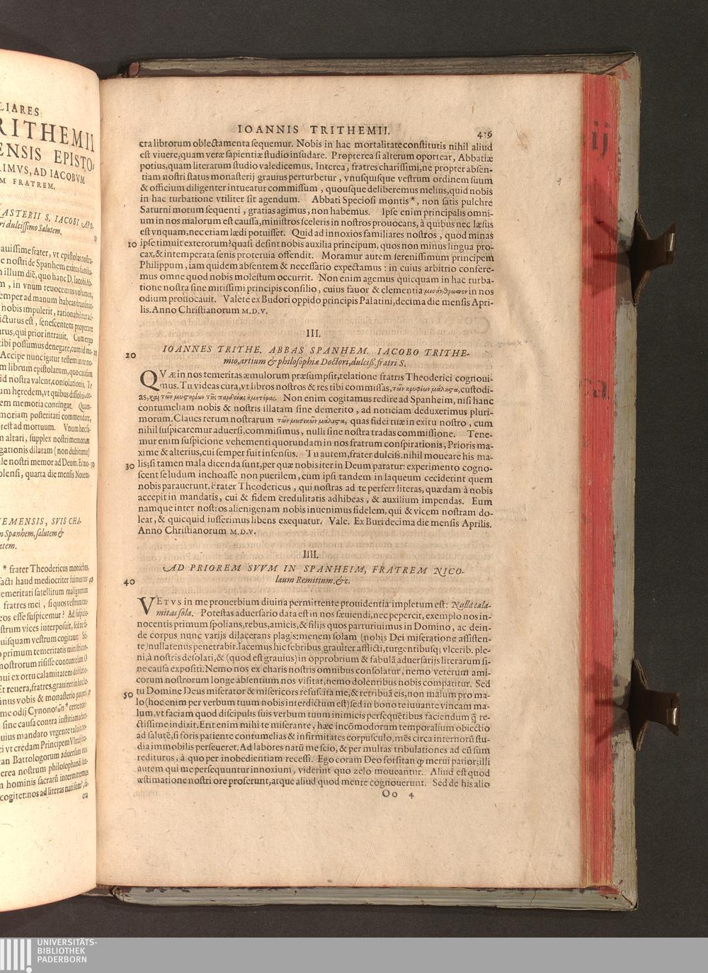 2 (1601) Iohannis Trithemii Spanheimensis Primo, Deinde D. Iacobi Maioris Apvd Herbipolin Abbatis, viri suo æuo doctissimi Secvndæ Partis Chronica Insignia Dvo : I. Coenobii Hirsavgiensis, Diœcesis Spirensis: eius fundationem & progressum ab Anno Christi DCCCXXX. vsque ad Annum MCCCLXX. II. Coenobii Spanheimensis, Diœcesis Moguntinensis: eius fundationem & progressum ab Anno Christi MCXXIIII. vsque ad Annum MDXXVI. vel potius res ab octo illis sæculis in tota Ecclesia & Imperio memorabiliter gestas, complectens; Qvorvm Privs Collatione Archetypi Ipsivs Auctoris manuscripti correctius & plenius; posterius verò istud nunc primùm è tenebris erutum, ob insignem vtilitatem optimâ fide in lucem editur; Accedunt Epistolæ eiusdem Familiares, ab excessu eius de cœnobio Spanheimensi ad Principes clarosque viros scriptæ, historiis eius æui referctæ