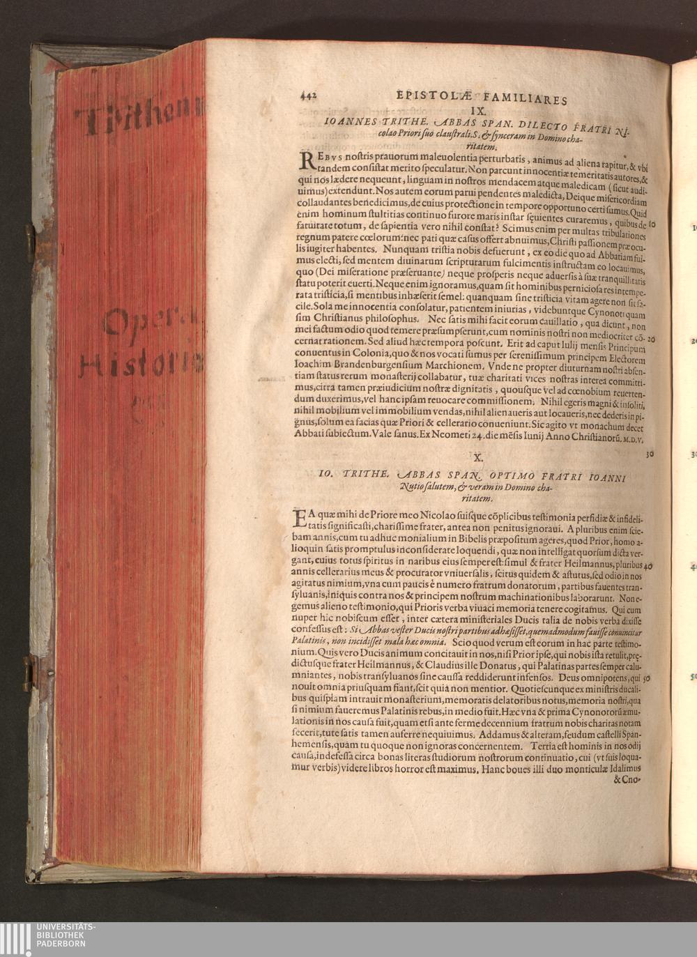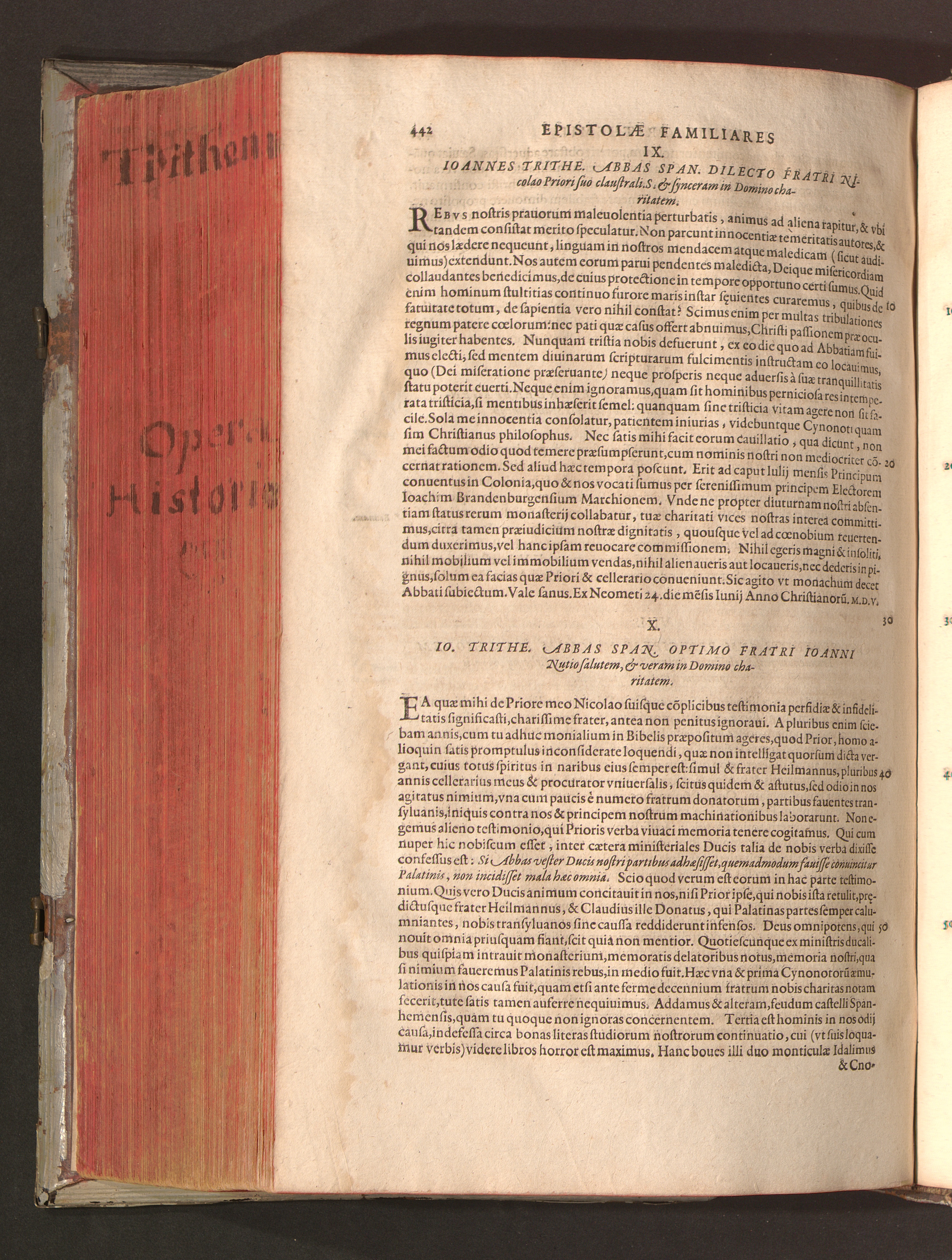 2 (1601) Iohannis Trithemii Spanheimensis Primo, Deinde D. Iacobi Maioris Apvd Herbipolin Abbatis, viri suo æuo doctissimi Secvndæ Partis Chronica Insignia Dvo : I. Coenobii Hirsavgiensis, Diœcesis Spirensis: eius fundationem & progressum ab Anno Christi DCCCXXX. vsque ad Annum MCCCLXX. II. Coenobii Spanheimensis, Diœcesis Moguntinensis: eius fundationem & progressum ab Anno Christi MCXXIIII. vsque ad Annum MDXXVI. vel potius res ab octo illis sæculis in tota Ecclesia & Imperio memorabiliter gestas, complectens; Qvorvm Privs Collatione Archetypi Ipsivs Auctoris manuscripti correctius & plenius; posterius verò istud nunc primùm è tenebris erutum, ob insignem vtilitatem optimâ fide in lucem editur; Accedunt Epistolæ eiusdem Familiares, ab excessu eius de cœnobio Spanheimensi ad Principes clarosque viros scriptæ, historiis eius æui referctæ
