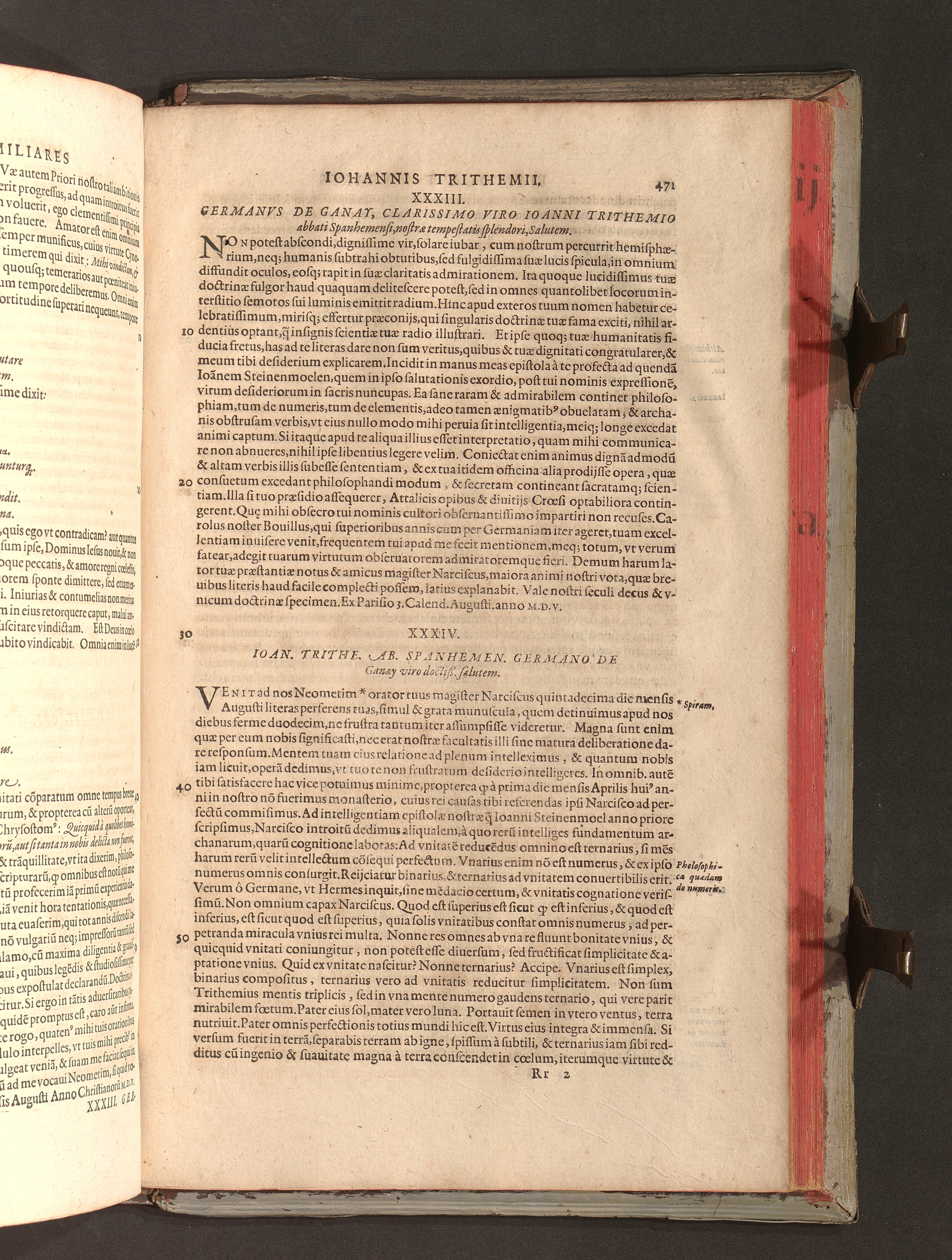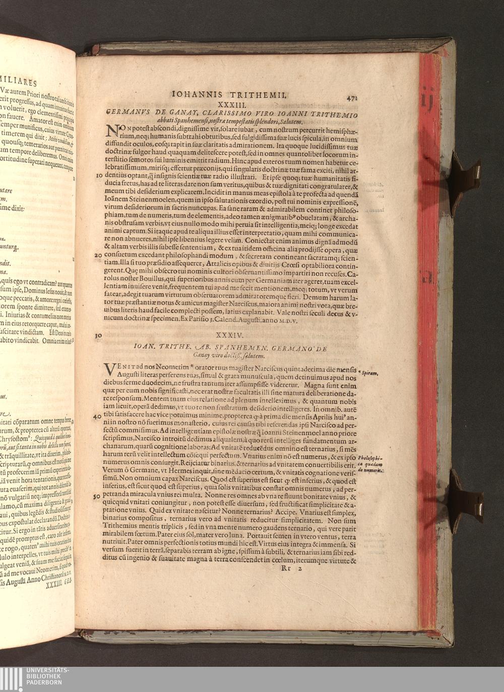 2 (1601) Iohannis Trithemii Spanheimensis Primo, Deinde D. Iacobi Maioris Apvd Herbipolin Abbatis, viri suo æuo doctissimi Secvndæ Partis Chronica Insignia Dvo : I. Coenobii Hirsavgiensis, Diœcesis Spirensis: eius fundationem & progressum ab Anno Christi DCCCXXX. vsque ad Annum MCCCLXX. II. Coenobii Spanheimensis, Diœcesis Moguntinensis: eius fundationem & progressum ab Anno Christi MCXXIIII. vsque ad Annum MDXXVI. vel potius res ab octo illis sæculis in tota Ecclesia & Imperio memorabiliter gestas, complectens; Qvorvm Privs Collatione Archetypi Ipsivs Auctoris manuscripti correctius & plenius; posterius verò istud nunc primùm è tenebris erutum, ob insignem vtilitatem optimâ fide in lucem editur; Accedunt Epistolæ eiusdem Familiares, ab excessu eius de cœnobio Spanheimensi ad Principes clarosque viros scriptæ, historiis eius æui referctæ