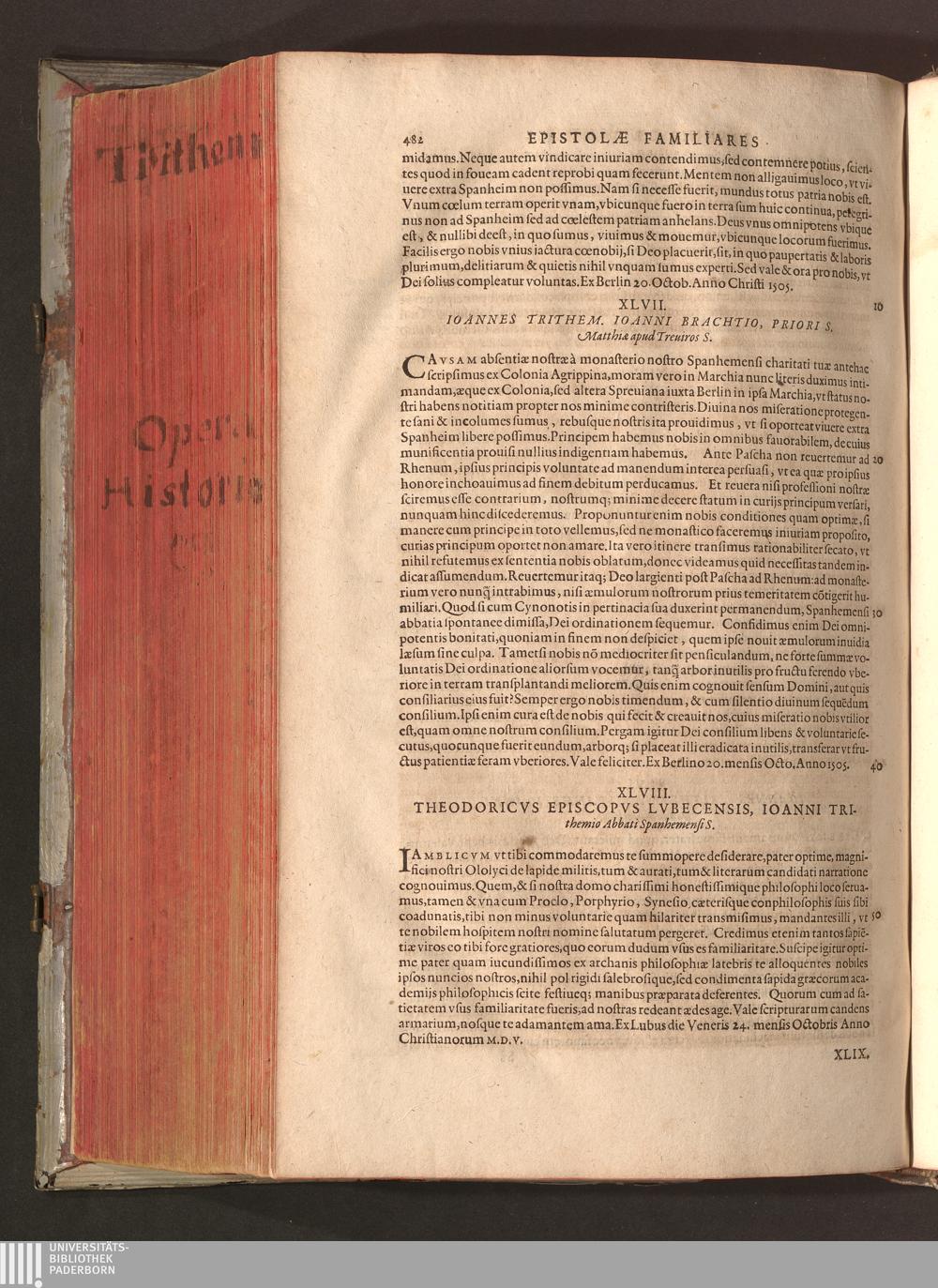 2 (1601) Iohannis Trithemii Spanheimensis Primo, Deinde D. Iacobi Maioris Apvd Herbipolin Abbatis, viri suo æuo doctissimi Secvndæ Partis Chronica Insignia Dvo : I. Coenobii Hirsavgiensis, Diœcesis Spirensis: eius fundationem & progressum ab Anno Christi DCCCXXX. vsque ad Annum MCCCLXX. II. Coenobii Spanheimensis, Diœcesis Moguntinensis: eius fundationem & progressum ab Anno Christi MCXXIIII. vsque ad Annum MDXXVI. vel potius res ab octo illis sæculis in tota Ecclesia & Imperio memorabiliter gestas, complectens; Qvorvm Privs Collatione Archetypi Ipsivs Auctoris manuscripti correctius & plenius; posterius verò istud nunc primùm è tenebris erutum, ob insignem vtilitatem optimâ fide in lucem editur; Accedunt Epistolæ eiusdem Familiares, ab excessu eius de cœnobio Spanheimensi ad Principes clarosque viros scriptæ, historiis eius æui referctæ