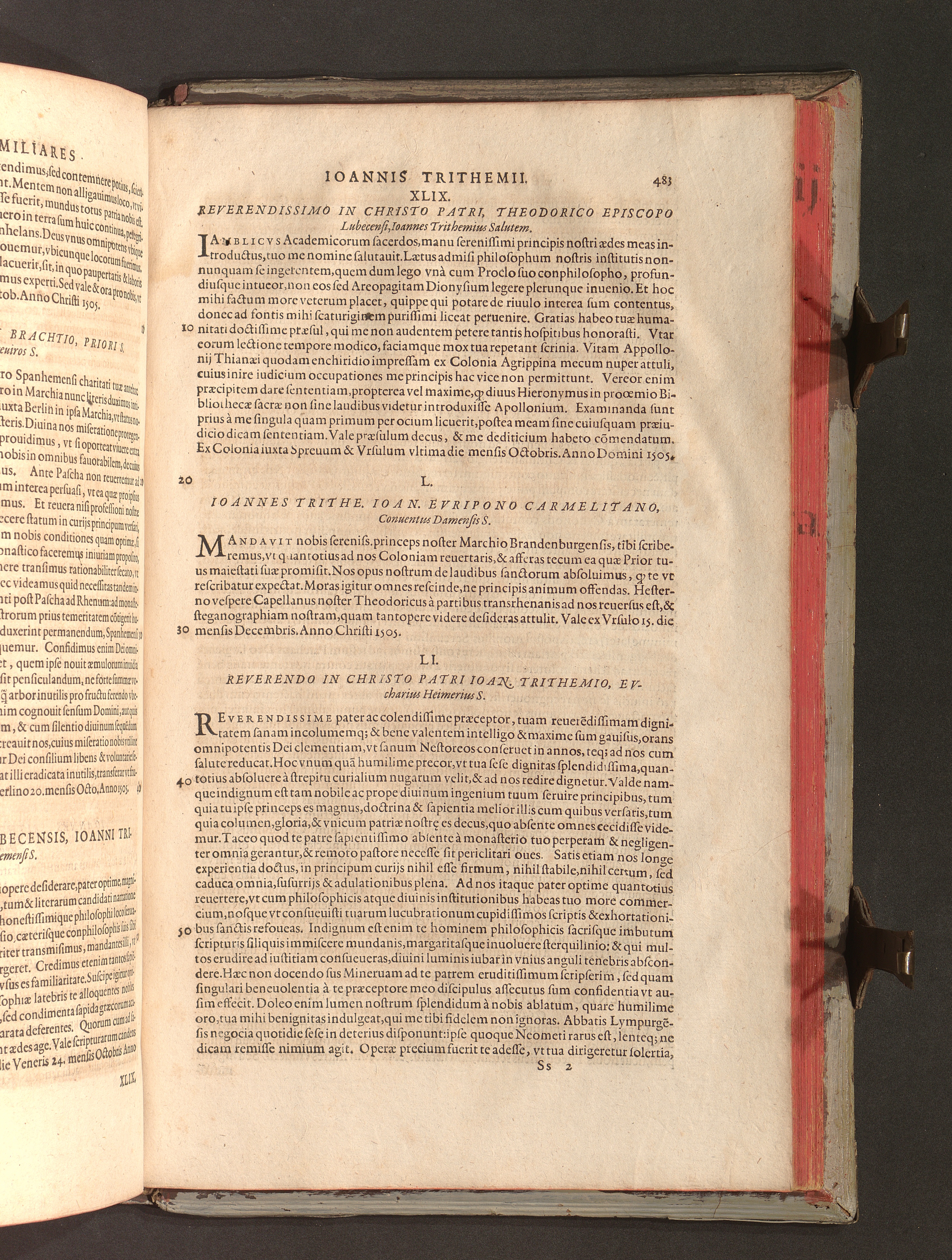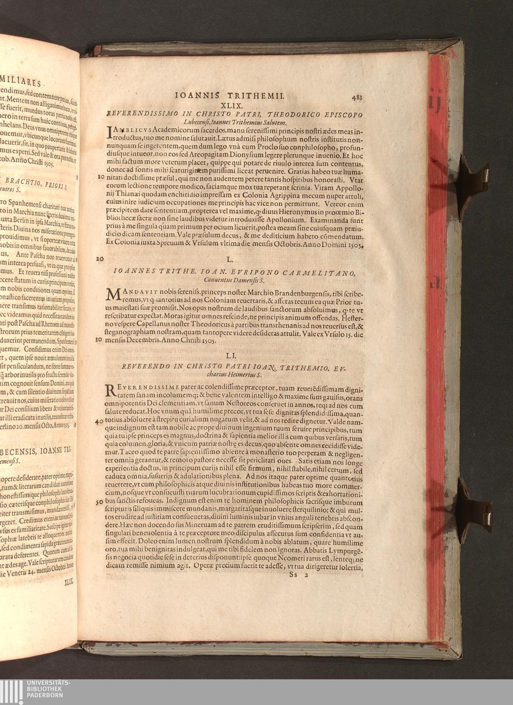 2 (1601) Iohannis Trithemii Spanheimensis Primo, Deinde D. Iacobi Maioris Apvd Herbipolin Abbatis, viri suo æuo doctissimi Secvndæ Partis Chronica Insignia Dvo : I. Coenobii Hirsavgiensis, Diœcesis Spirensis: eius fundationem & progressum ab Anno Christi DCCCXXX. vsque ad Annum MCCCLXX. II. Coenobii Spanheimensis, Diœcesis Moguntinensis: eius fundationem & progressum ab Anno Christi MCXXIIII. vsque ad Annum MDXXVI. vel potius res ab octo illis sæculis in tota Ecclesia & Imperio memorabiliter gestas, complectens; Qvorvm Privs Collatione Archetypi Ipsivs Auctoris manuscripti correctius & plenius; posterius verò istud nunc primùm è tenebris erutum, ob insignem vtilitatem optimâ fide in lucem editur; Accedunt Epistolæ eiusdem Familiares, ab excessu eius de cœnobio Spanheimensi ad Principes clarosque viros scriptæ, historiis eius æui referctæ