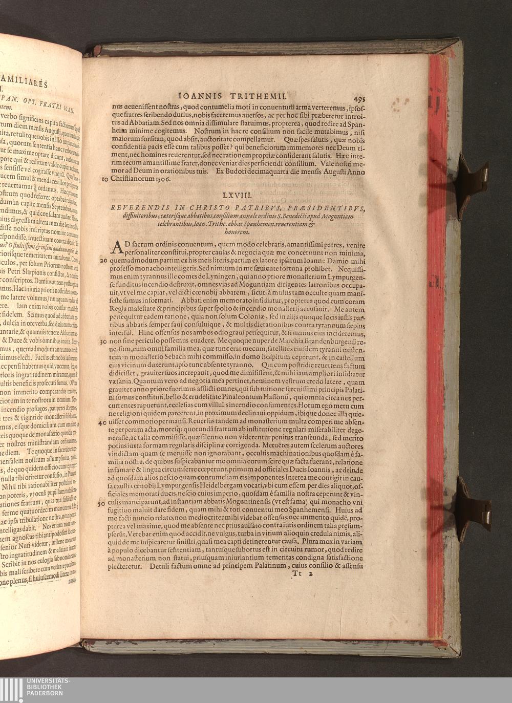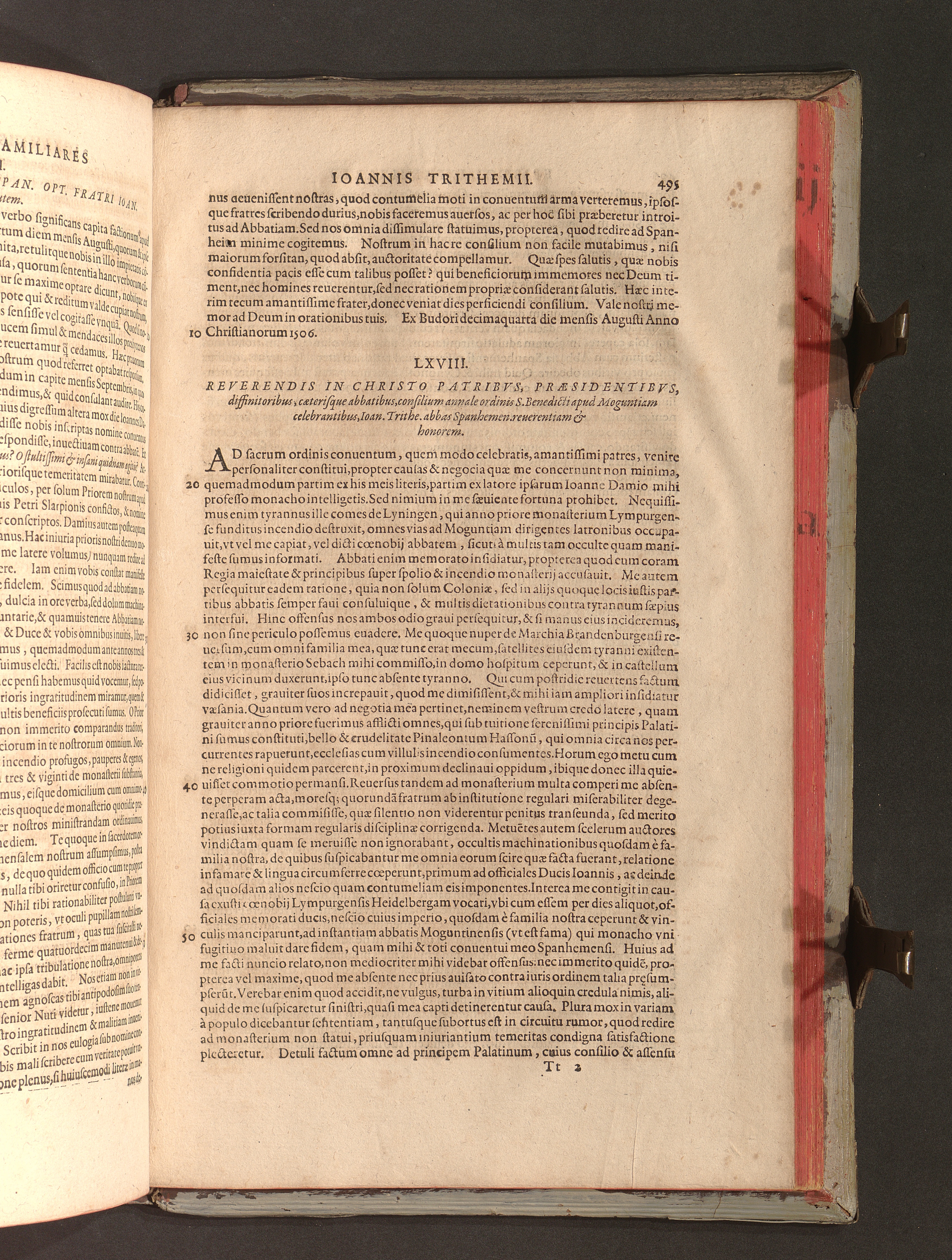 2 (1601) Iohannis Trithemii Spanheimensis Primo, Deinde D. Iacobi Maioris Apvd Herbipolin Abbatis, viri suo æuo doctissimi Secvndæ Partis Chronica Insignia Dvo : I. Coenobii Hirsavgiensis, Diœcesis Spirensis: eius fundationem & progressum ab Anno Christi DCCCXXX. vsque ad Annum MCCCLXX. II. Coenobii Spanheimensis, Diœcesis Moguntinensis: eius fundationem & progressum ab Anno Christi MCXXIIII. vsque ad Annum MDXXVI. vel potius res ab octo illis sæculis in tota Ecclesia & Imperio memorabiliter gestas, complectens; Qvorvm Privs Collatione Archetypi Ipsivs Auctoris manuscripti correctius & plenius; posterius verò istud nunc primùm è tenebris erutum, ob insignem vtilitatem optimâ fide in lucem editur; Accedunt Epistolæ eiusdem Familiares, ab excessu eius de cœnobio Spanheimensi ad Principes clarosque viros scriptæ, historiis eius æui referctæ