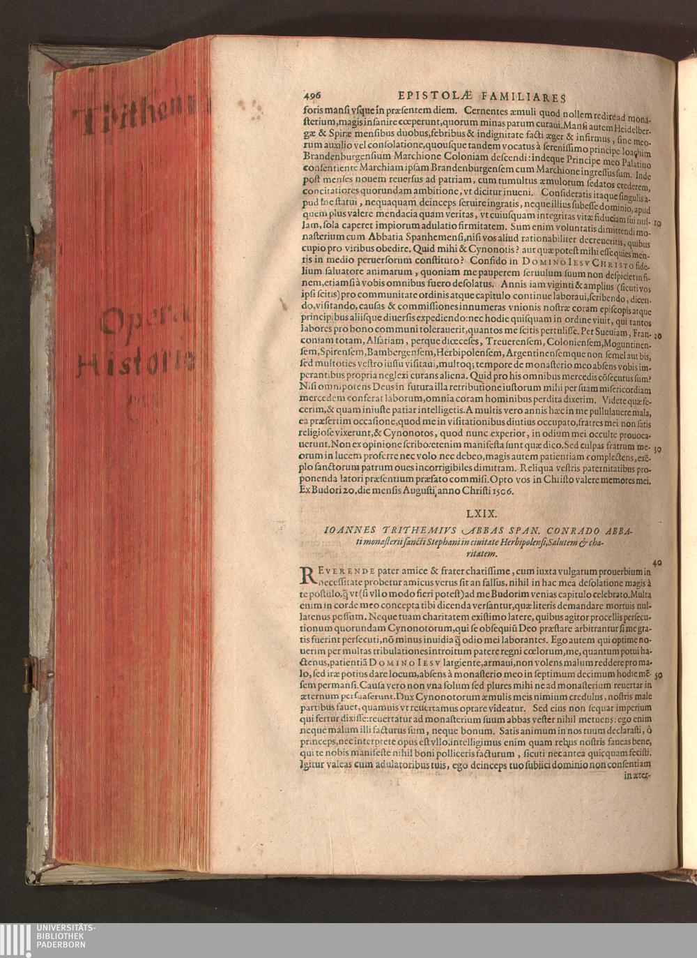 2 (1601) Iohannis Trithemii Spanheimensis Primo, Deinde D. Iacobi Maioris Apvd Herbipolin Abbatis, viri suo æuo doctissimi Secvndæ Partis Chronica Insignia Dvo : I. Coenobii Hirsavgiensis, Diœcesis Spirensis: eius fundationem & progressum ab Anno Christi DCCCXXX. vsque ad Annum MCCCLXX. II. Coenobii Spanheimensis, Diœcesis Moguntinensis: eius fundationem & progressum ab Anno Christi MCXXIIII. vsque ad Annum MDXXVI. vel potius res ab octo illis sæculis in tota Ecclesia & Imperio memorabiliter gestas, complectens; Qvorvm Privs Collatione Archetypi Ipsivs Auctoris manuscripti correctius & plenius; posterius verò istud nunc primùm è tenebris erutum, ob insignem vtilitatem optimâ fide in lucem editur; Accedunt Epistolæ eiusdem Familiares, ab excessu eius de cœnobio Spanheimensi ad Principes clarosque viros scriptæ, historiis eius æui referctæ