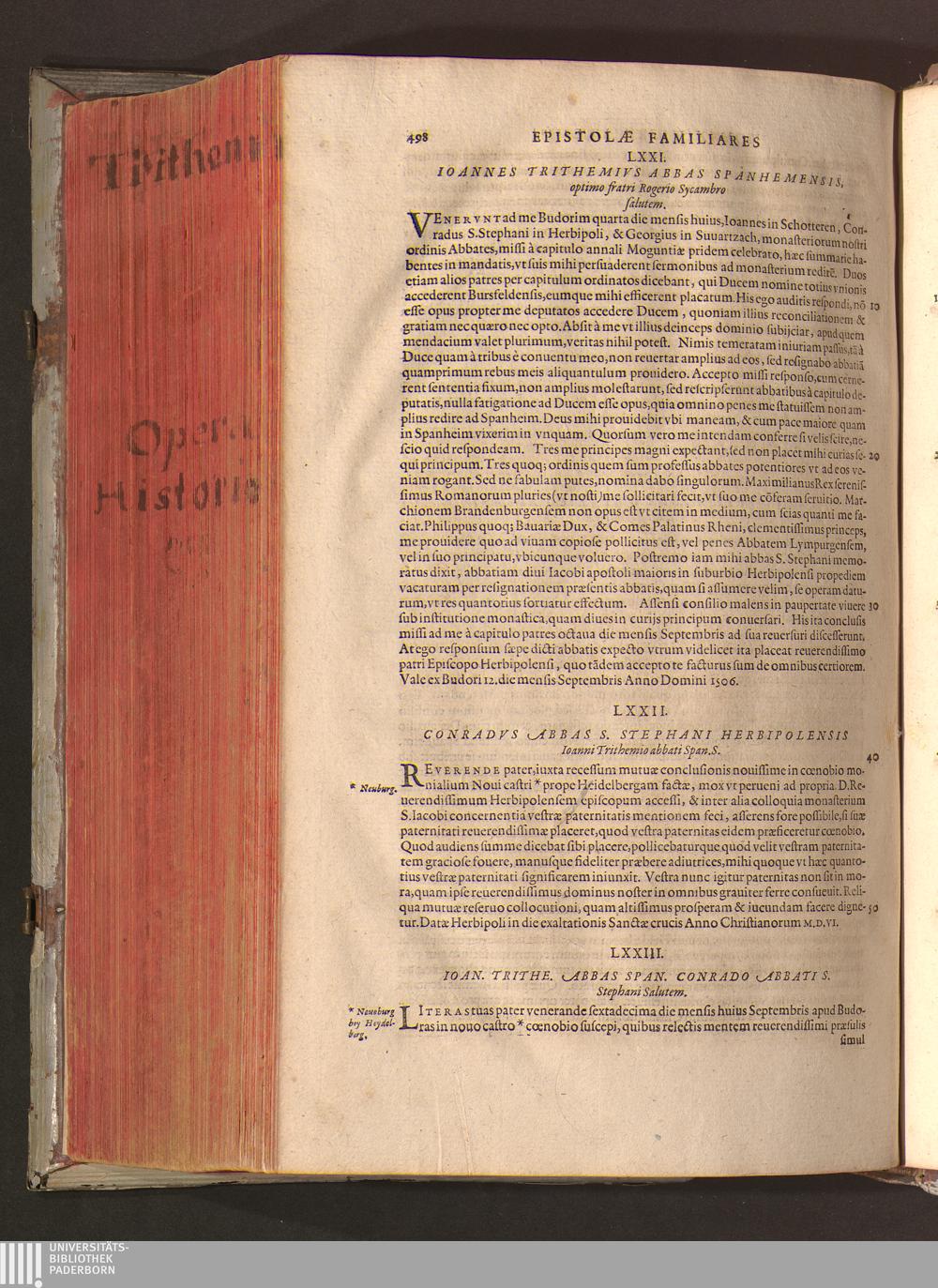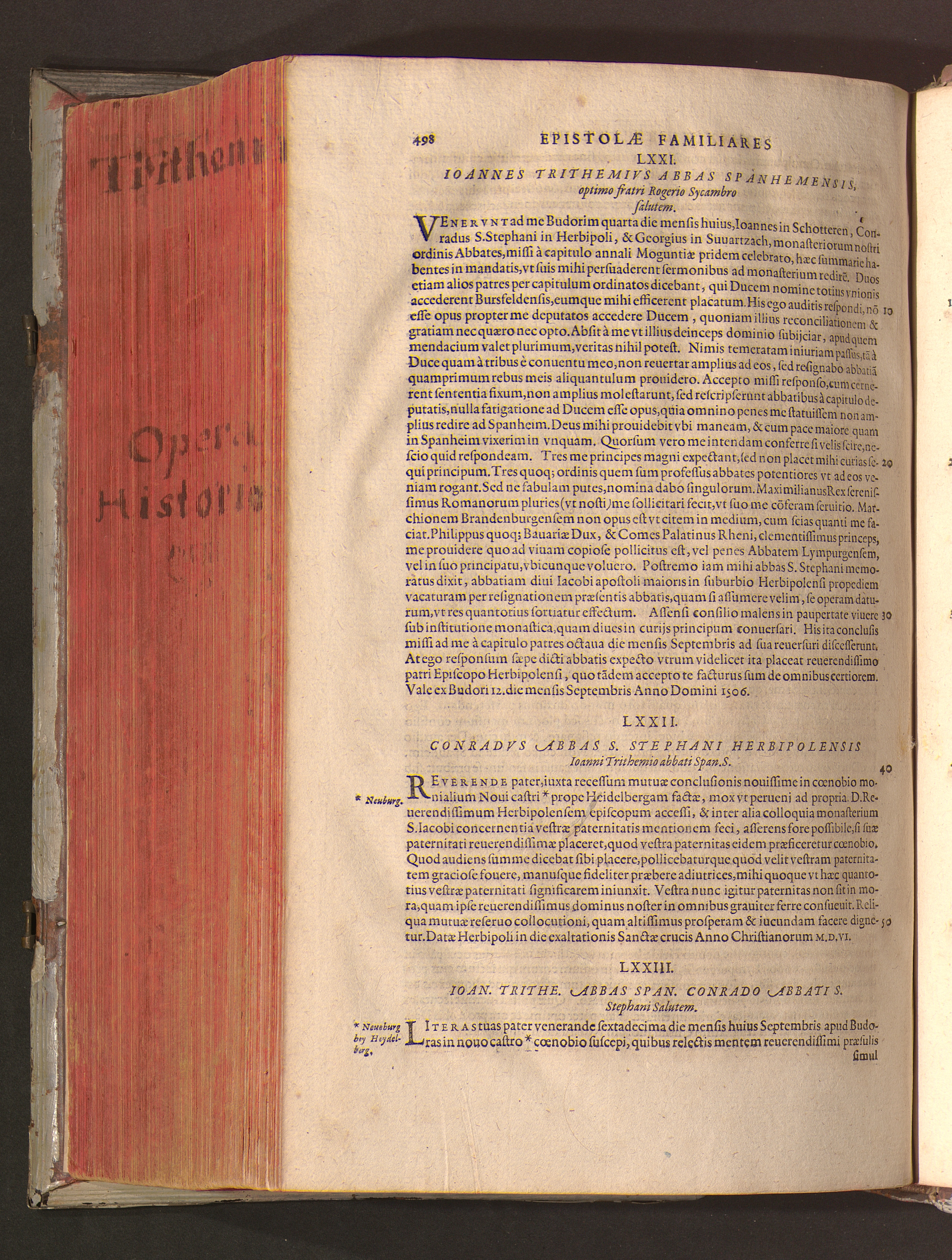 2 (1601) Iohannis Trithemii Spanheimensis Primo, Deinde D. Iacobi Maioris Apvd Herbipolin Abbatis, viri suo æuo doctissimi Secvndæ Partis Chronica Insignia Dvo : I. Coenobii Hirsavgiensis, Diœcesis Spirensis: eius fundationem & progressum ab Anno Christi DCCCXXX. vsque ad Annum MCCCLXX. II. Coenobii Spanheimensis, Diœcesis Moguntinensis: eius fundationem & progressum ab Anno Christi MCXXIIII. vsque ad Annum MDXXVI. vel potius res ab octo illis sæculis in tota Ecclesia & Imperio memorabiliter gestas, complectens; Qvorvm Privs Collatione Archetypi Ipsivs Auctoris manuscripti correctius & plenius; posterius verò istud nunc primùm è tenebris erutum, ob insignem vtilitatem optimâ fide in lucem editur; Accedunt Epistolæ eiusdem Familiares, ab excessu eius de cœnobio Spanheimensi ad Principes clarosque viros scriptæ, historiis eius æui referctæ
