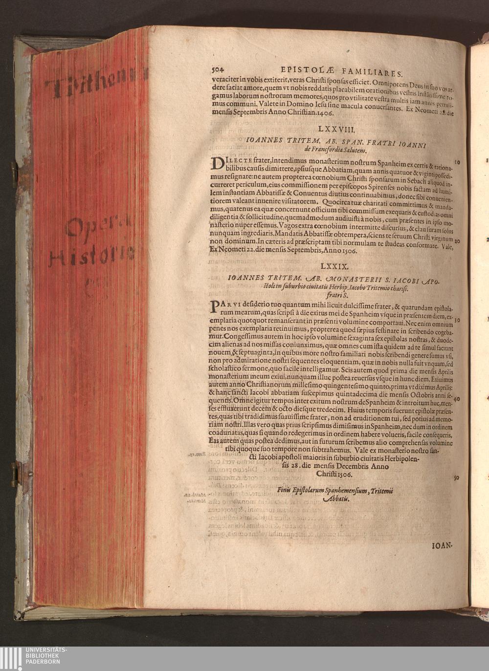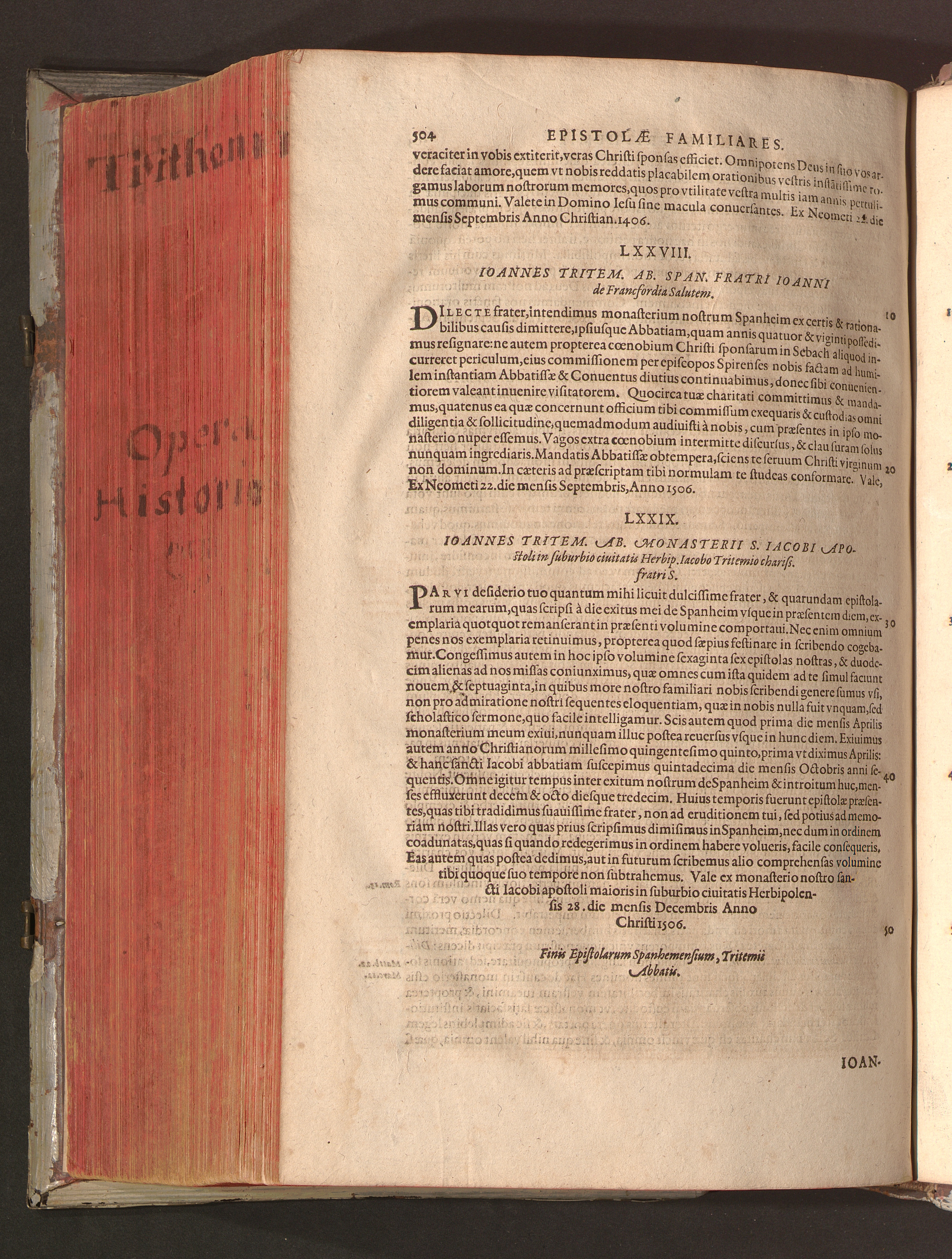 2 (1601) Iohannis Trithemii Spanheimensis Primo, Deinde D. Iacobi Maioris Apvd Herbipolin Abbatis, viri suo æuo doctissimi Secvndæ Partis Chronica Insignia Dvo : I. Coenobii Hirsavgiensis, Diœcesis Spirensis: eius fundationem & progressum ab Anno Christi DCCCXXX. vsque ad Annum MCCCLXX. II. Coenobii Spanheimensis, Diœcesis Moguntinensis: eius fundationem & progressum ab Anno Christi MCXXIIII. vsque ad Annum MDXXVI. vel potius res ab octo illis sæculis in tota Ecclesia & Imperio memorabiliter gestas, complectens; Qvorvm Privs Collatione Archetypi Ipsivs Auctoris manuscripti correctius & plenius; posterius verò istud nunc primùm è tenebris erutum, ob insignem vtilitatem optimâ fide in lucem editur; Accedunt Epistolæ eiusdem Familiares, ab excessu eius de cœnobio Spanheimensi ad Principes clarosque viros scriptæ, historiis eius æui referctæ