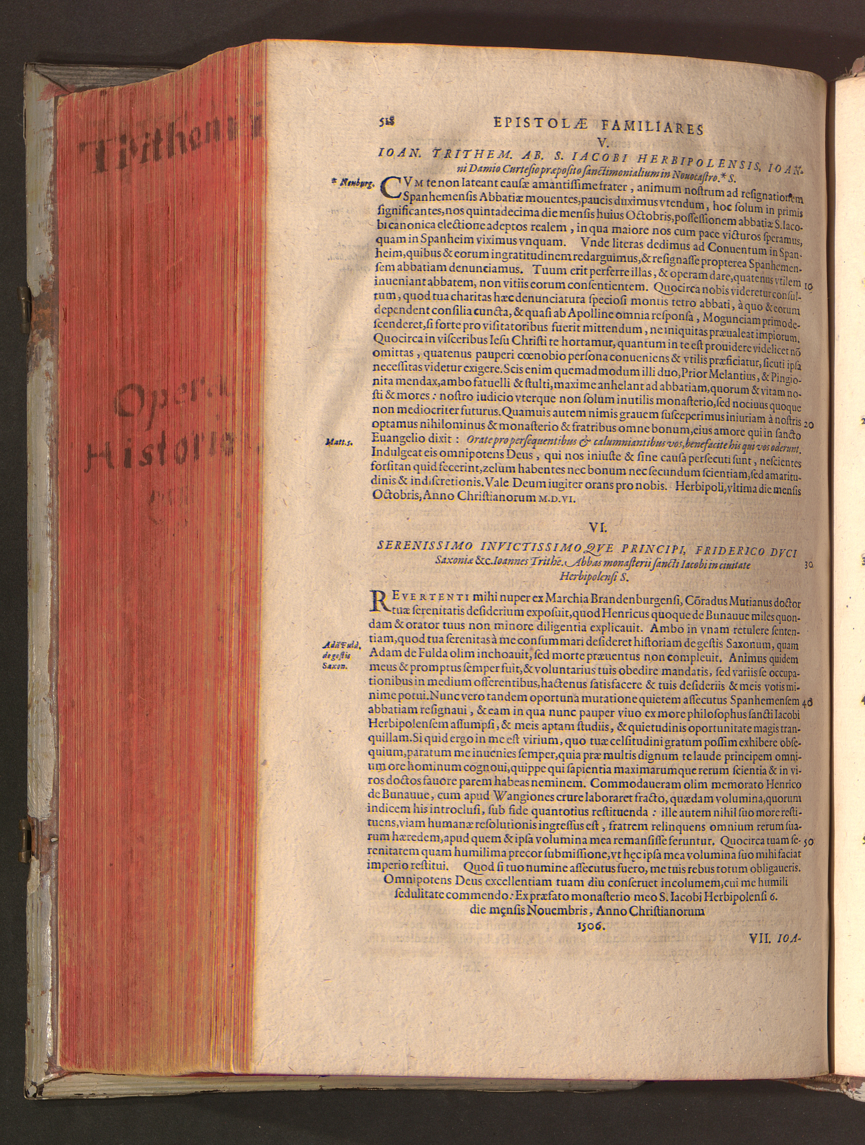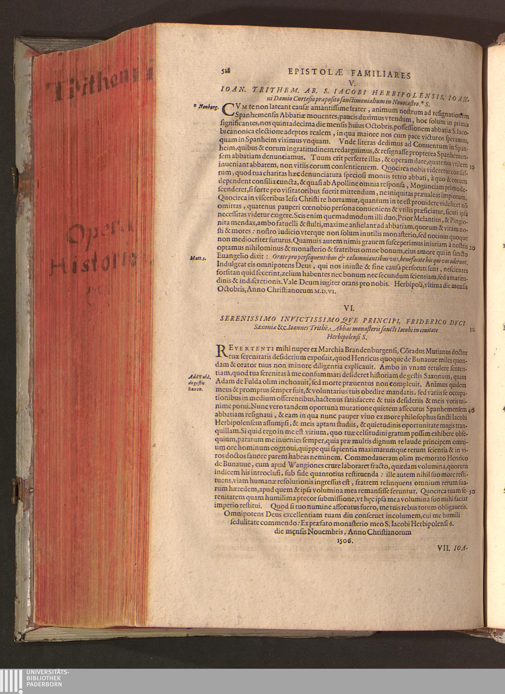 2 (1601) Iohannis Trithemii Spanheimensis Primo, Deinde D. Iacobi Maioris Apvd Herbipolin Abbatis, viri suo æuo doctissimi Secvndæ Partis Chronica Insignia Dvo : I. Coenobii Hirsavgiensis, Diœcesis Spirensis: eius fundationem & progressum ab Anno Christi DCCCXXX. vsque ad Annum MCCCLXX. II. Coenobii Spanheimensis, Diœcesis Moguntinensis: eius fundationem & progressum ab Anno Christi MCXXIIII. vsque ad Annum MDXXVI. vel potius res ab octo illis sæculis in tota Ecclesia & Imperio memorabiliter gestas, complectens; Qvorvm Privs Collatione Archetypi Ipsivs Auctoris manuscripti correctius & plenius; posterius verò istud nunc primùm è tenebris erutum, ob insignem vtilitatem optimâ fide in lucem editur; Accedunt Epistolæ eiusdem Familiares, ab excessu eius de cœnobio Spanheimensi ad Principes clarosque viros scriptæ, historiis eius æui referctæ