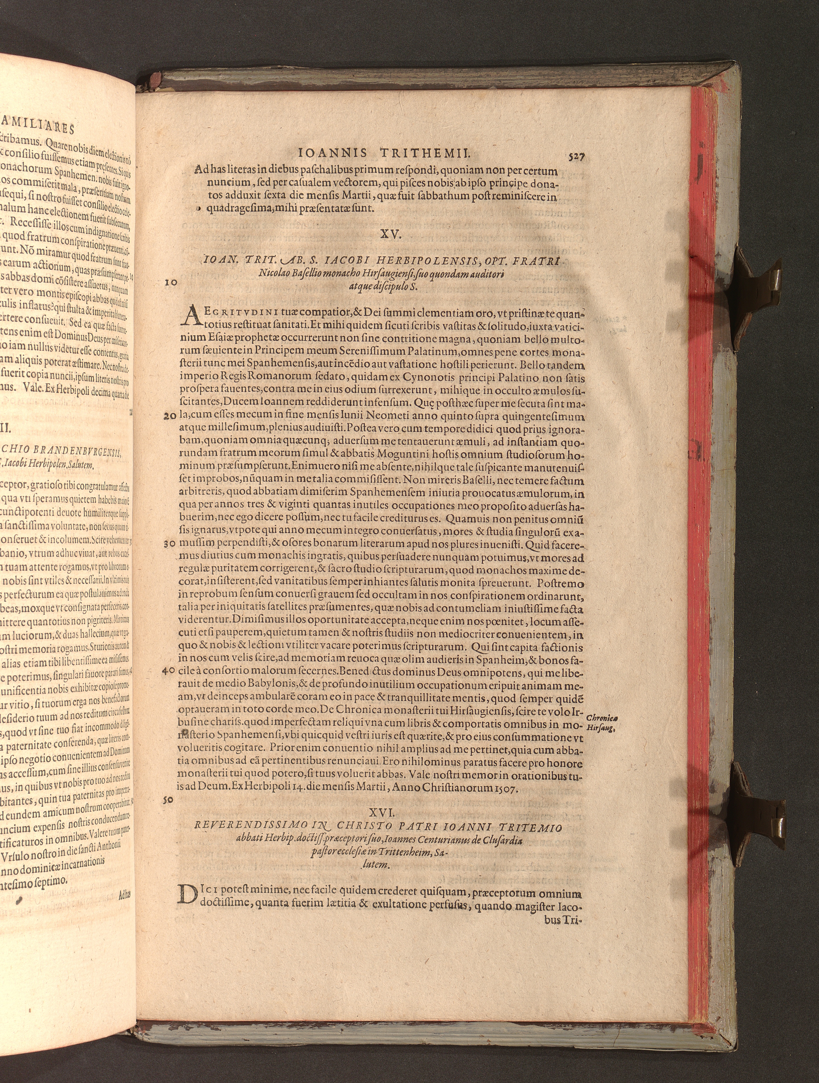 2 (1601) Iohannis Trithemii Spanheimensis Primo, Deinde D. Iacobi Maioris Apvd Herbipolin Abbatis, viri suo æuo doctissimi Secvndæ Partis Chronica Insignia Dvo : I. Coenobii Hirsavgiensis, Diœcesis Spirensis: eius fundationem & progressum ab Anno Christi DCCCXXX. vsque ad Annum MCCCLXX. II. Coenobii Spanheimensis, Diœcesis Moguntinensis: eius fundationem & progressum ab Anno Christi MCXXIIII. vsque ad Annum MDXXVI. vel potius res ab octo illis sæculis in tota Ecclesia & Imperio memorabiliter gestas, complectens; Qvorvm Privs Collatione Archetypi Ipsivs Auctoris manuscripti correctius & plenius; posterius verò istud nunc primùm è tenebris erutum, ob insignem vtilitatem optimâ fide in lucem editur; Accedunt Epistolæ eiusdem Familiares, ab excessu eius de cœnobio Spanheimensi ad Principes clarosque viros scriptæ, historiis eius æui referctæ