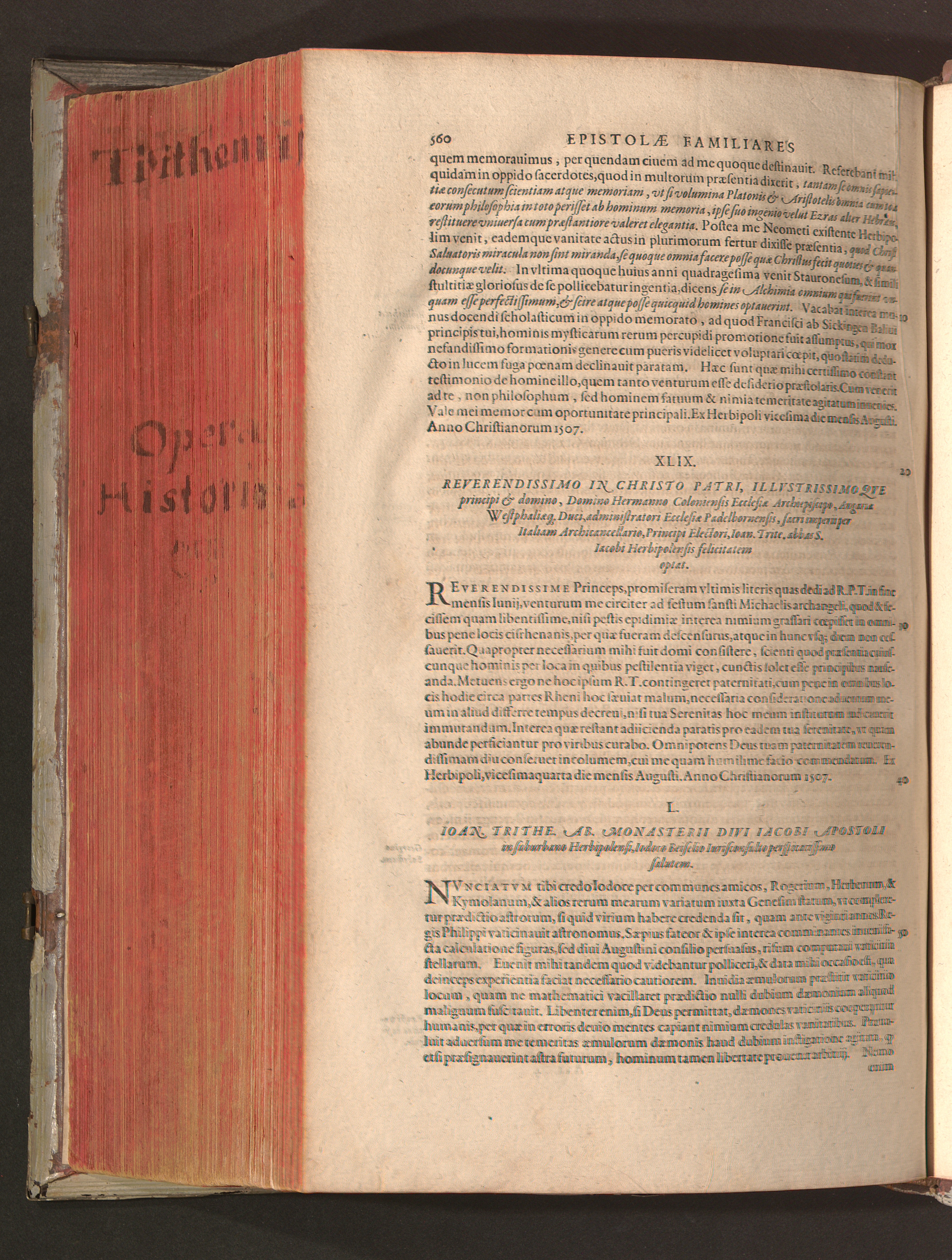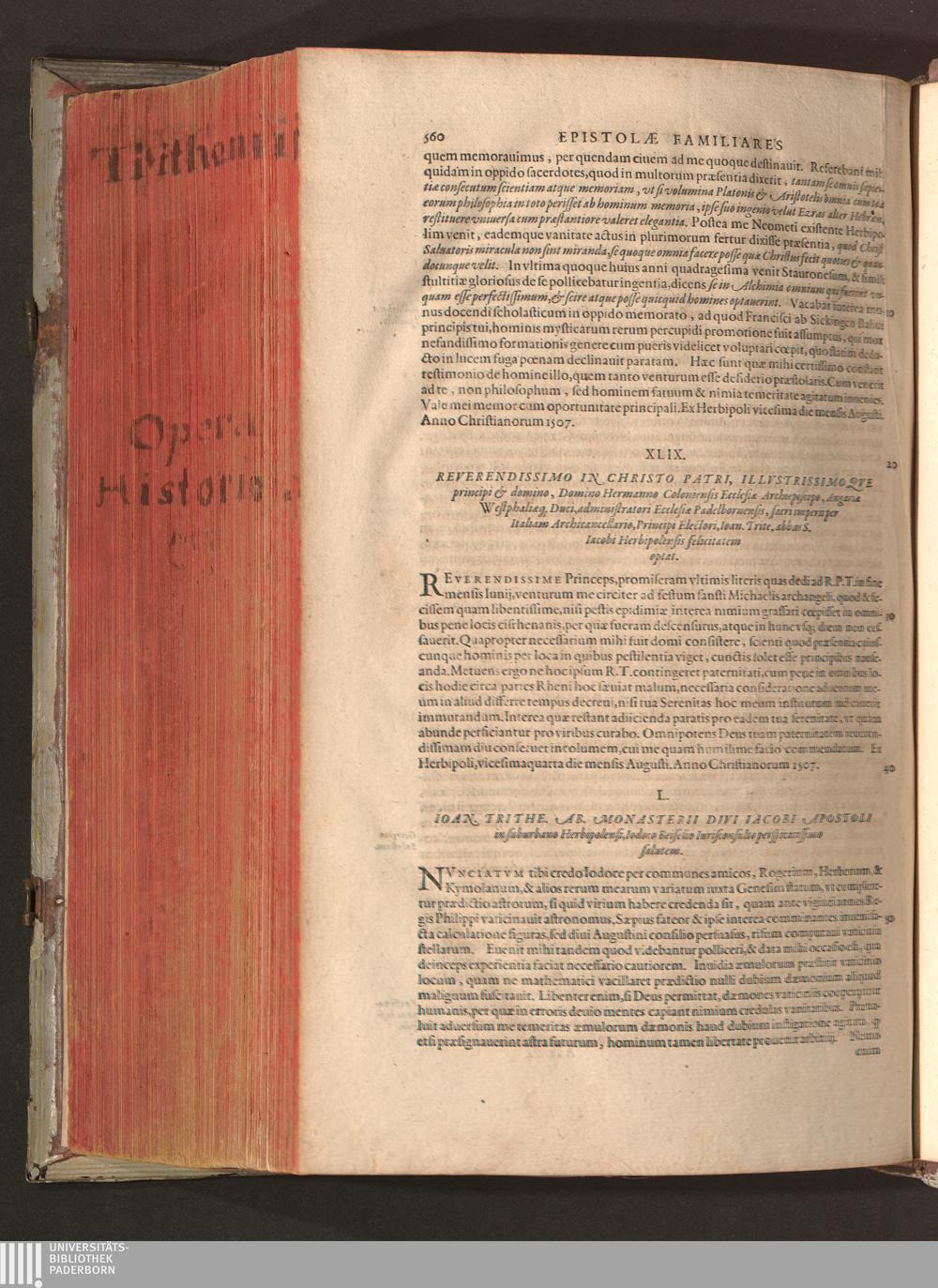 2 (1601) Iohannis Trithemii Spanheimensis Primo, Deinde D. Iacobi Maioris Apvd Herbipolin Abbatis, viri suo æuo doctissimi Secvndæ Partis Chronica Insignia Dvo : I. Coenobii Hirsavgiensis, Diœcesis Spirensis: eius fundationem & progressum ab Anno Christi DCCCXXX. vsque ad Annum MCCCLXX. II. Coenobii Spanheimensis, Diœcesis Moguntinensis: eius fundationem & progressum ab Anno Christi MCXXIIII. vsque ad Annum MDXXVI. vel potius res ab octo illis sæculis in tota Ecclesia & Imperio memorabiliter gestas, complectens; Qvorvm Privs Collatione Archetypi Ipsivs Auctoris manuscripti correctius & plenius; posterius verò istud nunc primùm è tenebris erutum, ob insignem vtilitatem optimâ fide in lucem editur; Accedunt Epistolæ eiusdem Familiares, ab excessu eius de cœnobio Spanheimensi ad Principes clarosque viros scriptæ, historiis eius æui referctæ