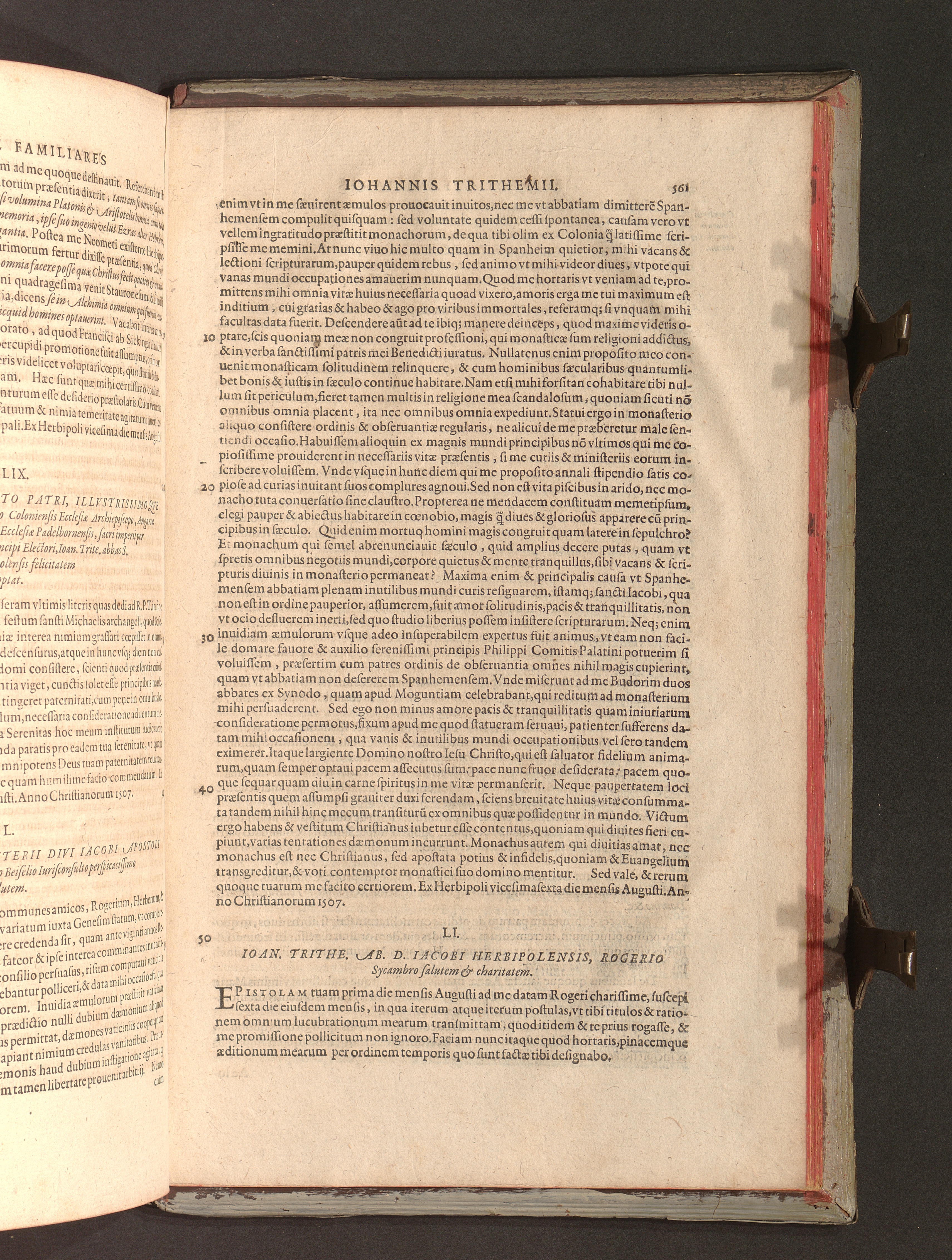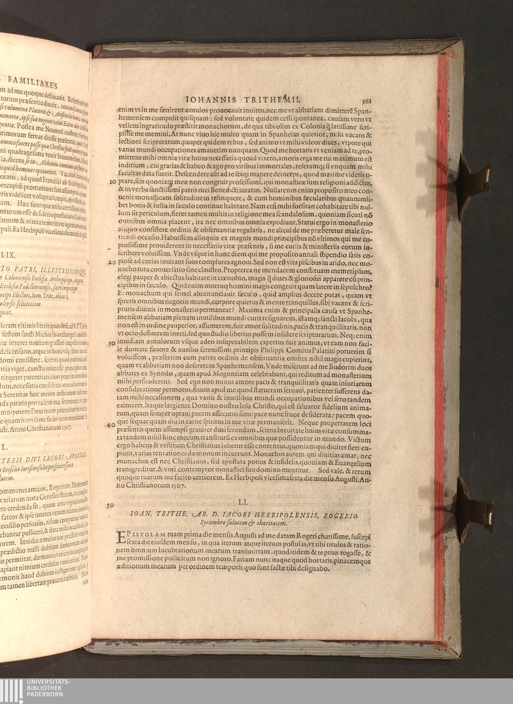 2 (1601) Iohannis Trithemii Spanheimensis Primo, Deinde D. Iacobi Maioris Apvd Herbipolin Abbatis, viri suo æuo doctissimi Secvndæ Partis Chronica Insignia Dvo : I. Coenobii Hirsavgiensis, Diœcesis Spirensis: eius fundationem & progressum ab Anno Christi DCCCXXX. vsque ad Annum MCCCLXX. II. Coenobii Spanheimensis, Diœcesis Moguntinensis: eius fundationem & progressum ab Anno Christi MCXXIIII. vsque ad Annum MDXXVI. vel potius res ab octo illis sæculis in tota Ecclesia & Imperio memorabiliter gestas, complectens; Qvorvm Privs Collatione Archetypi Ipsivs Auctoris manuscripti correctius & plenius; posterius verò istud nunc primùm è tenebris erutum, ob insignem vtilitatem optimâ fide in lucem editur; Accedunt Epistolæ eiusdem Familiares, ab excessu eius de cœnobio Spanheimensi ad Principes clarosque viros scriptæ, historiis eius æui referctæ