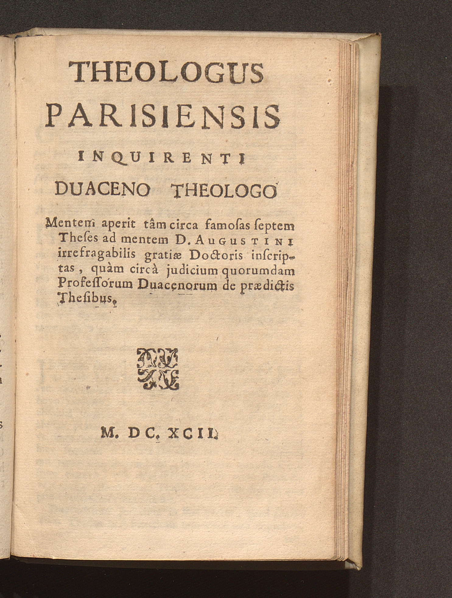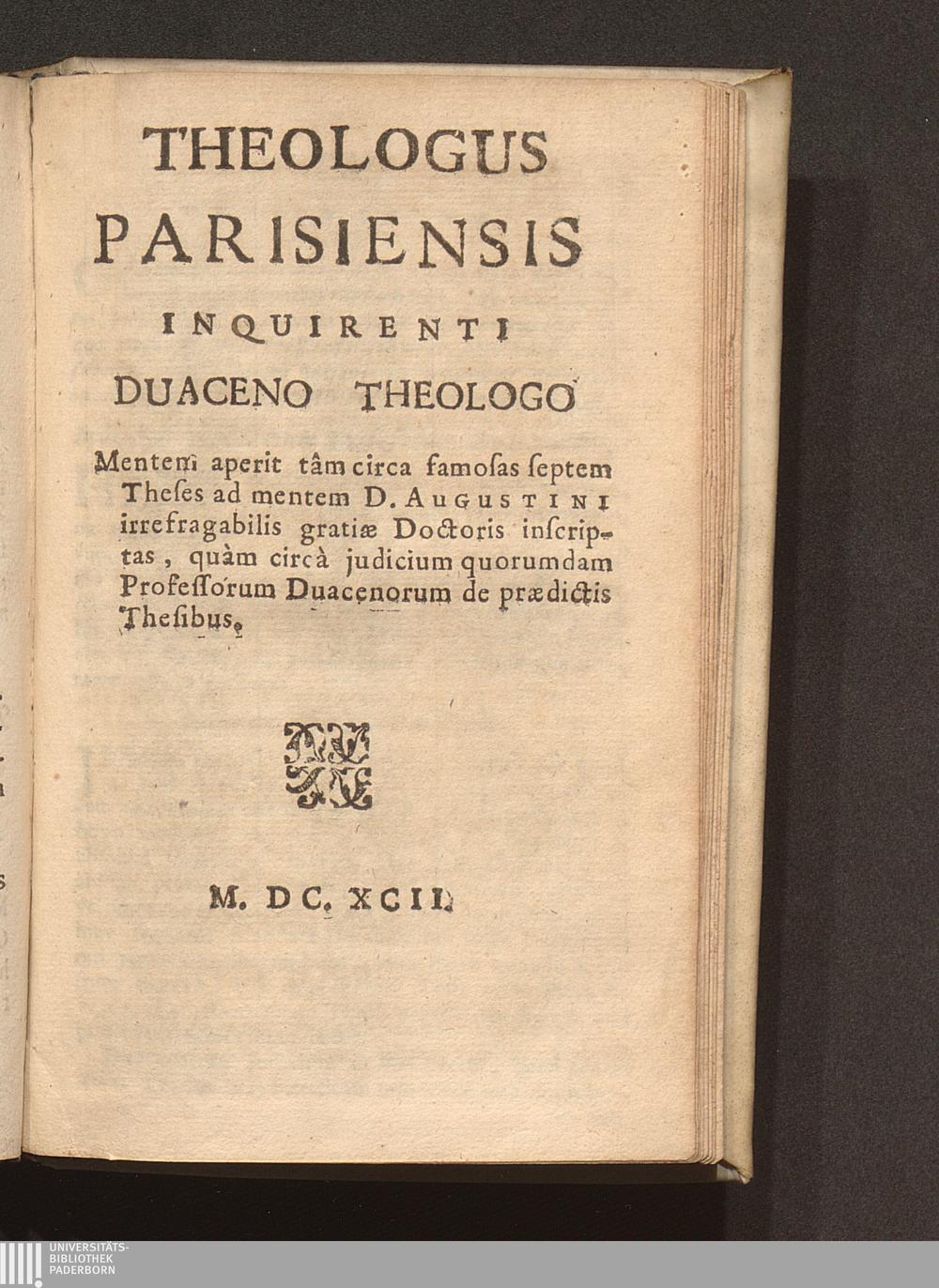 Theologus Parisiensis Inquirenti Duaceno Theologo : Mentem aperit tâm circa famosas septem Theses ad mentem D. Augustini irrefragabilis gratiæ Doctoris inscriptas, quàm circà iudicium quorumdam Professorum Duacenorum de prædictis Thesibus