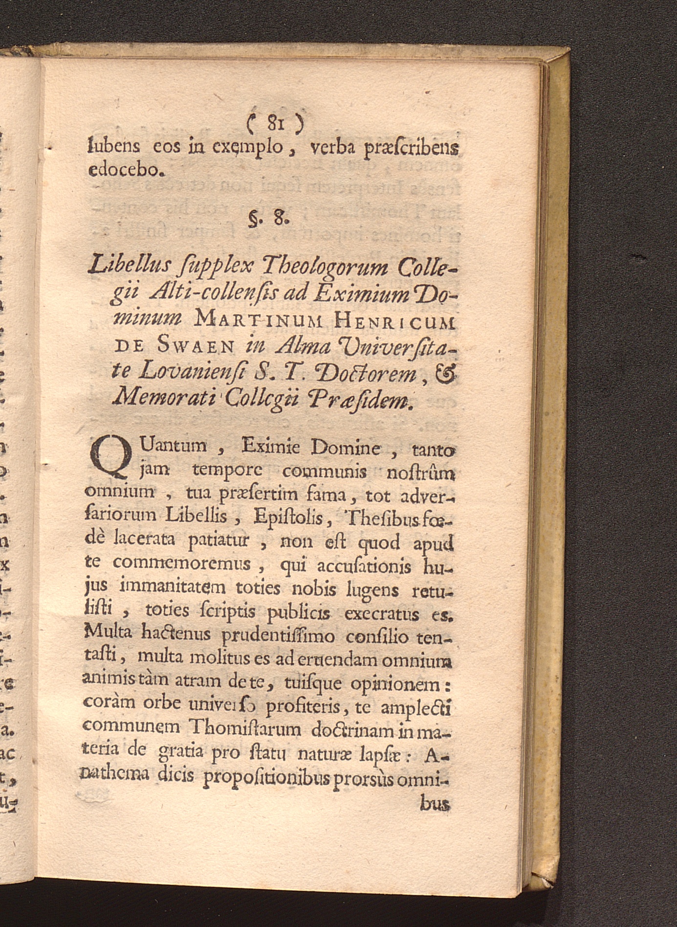 Secunda Pars (1692) Complectens 1. Justam defensionem adversus Libellum supplicem eximii Domini De Swaen, & eruditissimi Domini Melis. 2. Instaurationem priorum difficultatum cum Libello supplice Alumnorum Collegii Alticollensis ad Exim: suum Præsidem. 3. Æquam & facilem pacis conditionem