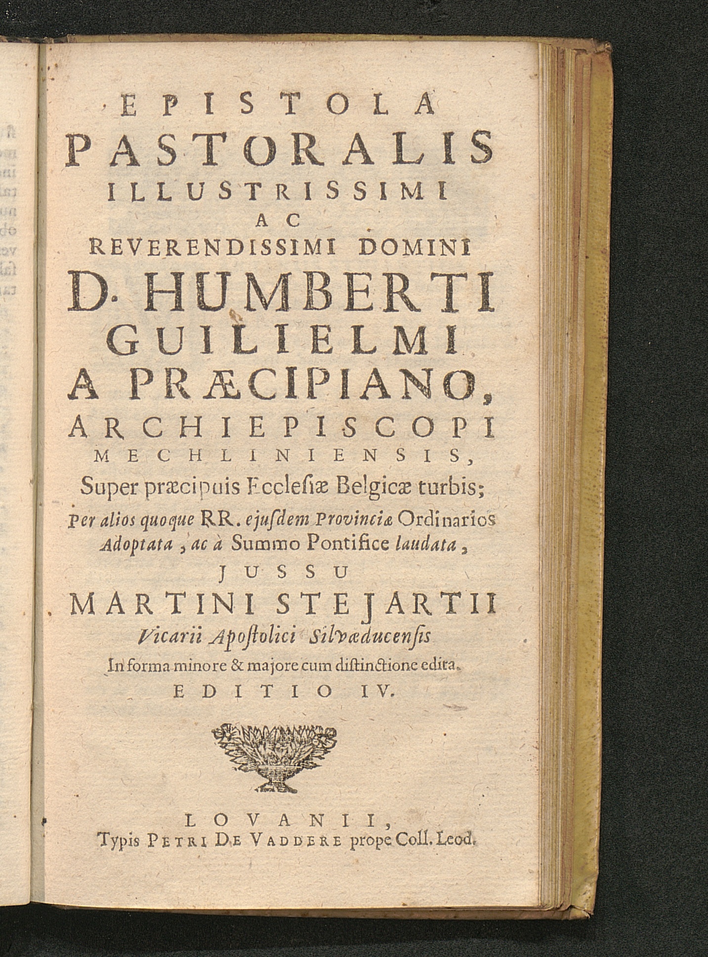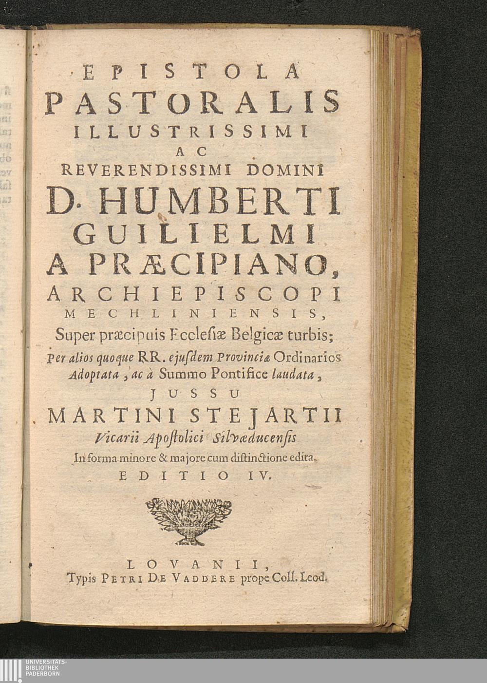 Epistola Pastoralis Illustrissimi Ac Reverendissimi Domini D. Humberti Guilielmi A Præcipiano, Archiepiscopi Mechliniensis : Super præcipuis Ecclesiæ Belgicæ turbis; Per alios quoque RR. ejusdem Provinciæ Ordinarios Adoptata, ac à Summo Pontifice laudata, Jussu Martini Stejartii Vicarii Apostolici Silvæducensis
