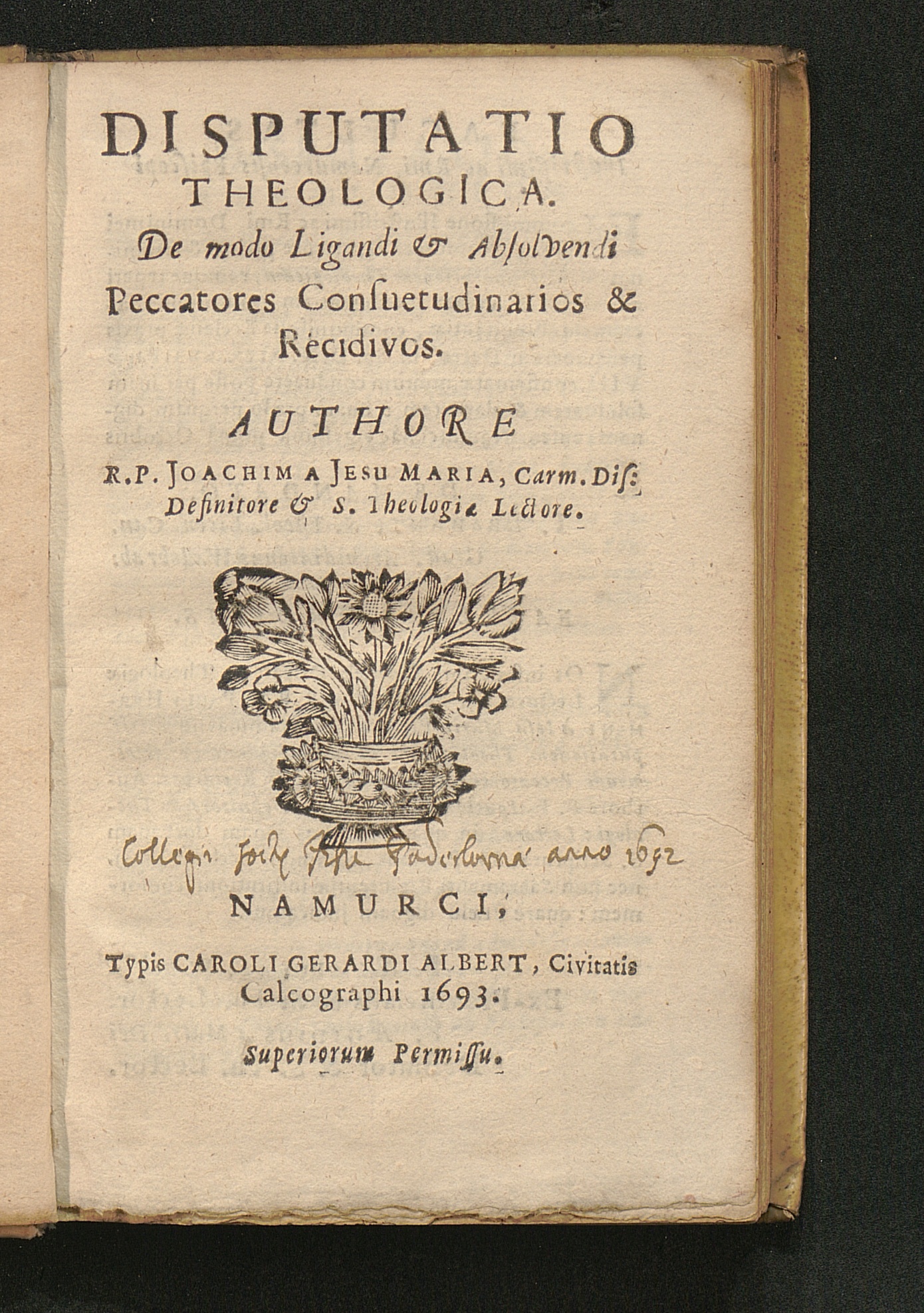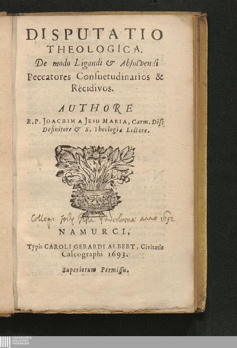 Disputatio Theologica. De modo Ligandi & Absolvendi Peccatores Consuetudinarios & Recidivos / Authore R. P. Joachim A Jesu Maria, Carm. Dis: Definitore & S. Theologiæ Lectore