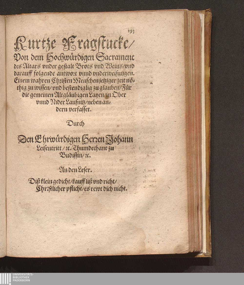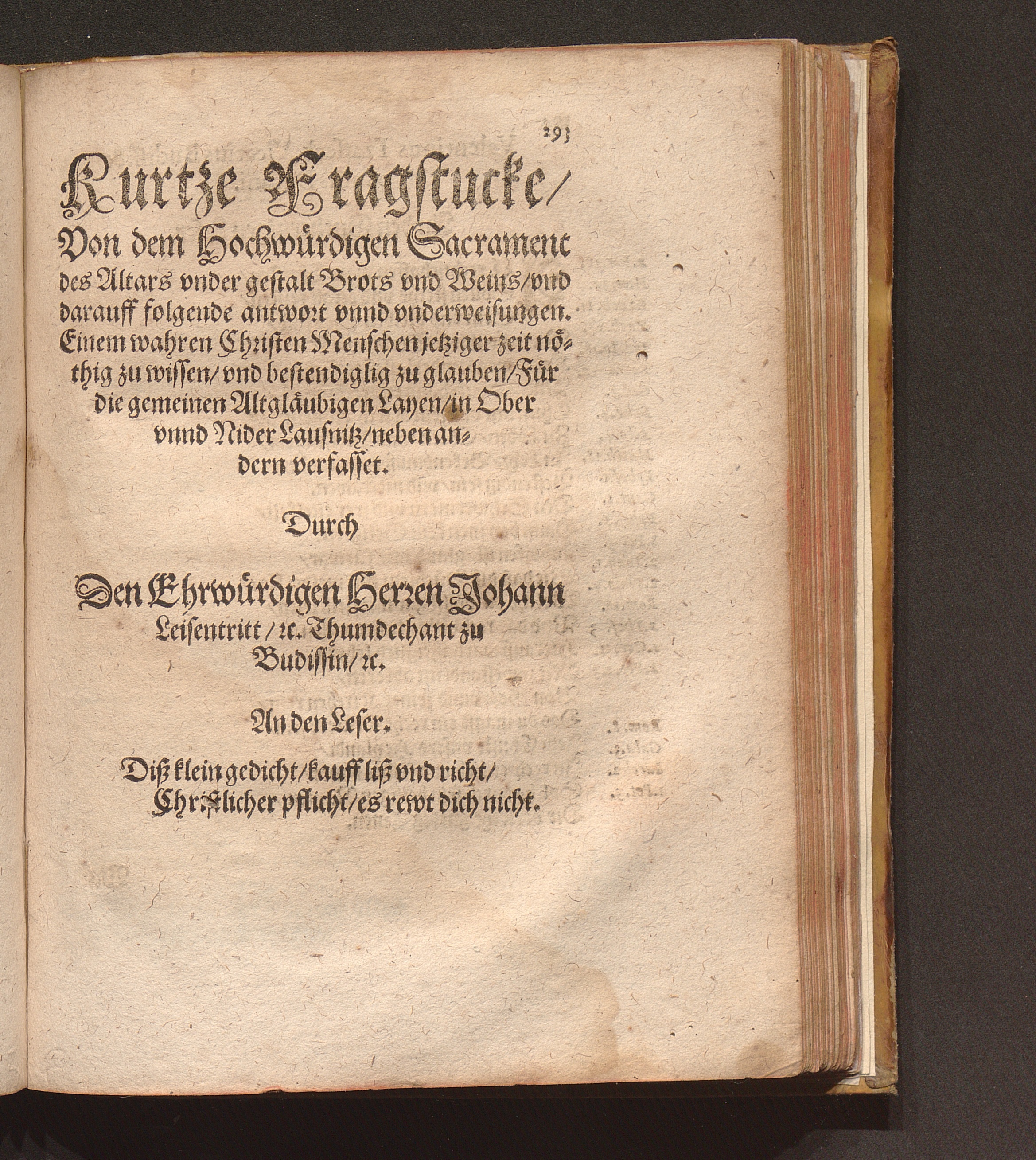 Catholisch Pfarbuch Oder Form vnd Weise/ wie die Catholischen Seelsorger (jetziger hochgefehrlicher zeit) jre Krancken eingepfarrten ohne vnderscheidt besuchen ... sollen / Durch Den Ehrwürdigen Herren Johan. Leisentritt/ Administratorem Ecclesiasticum, &c. vnd Thumdechant zu Budissin/ [et]c.