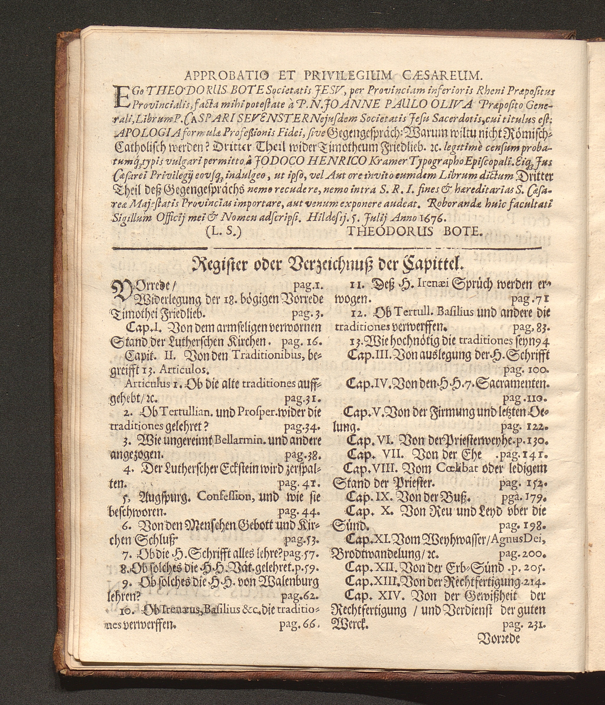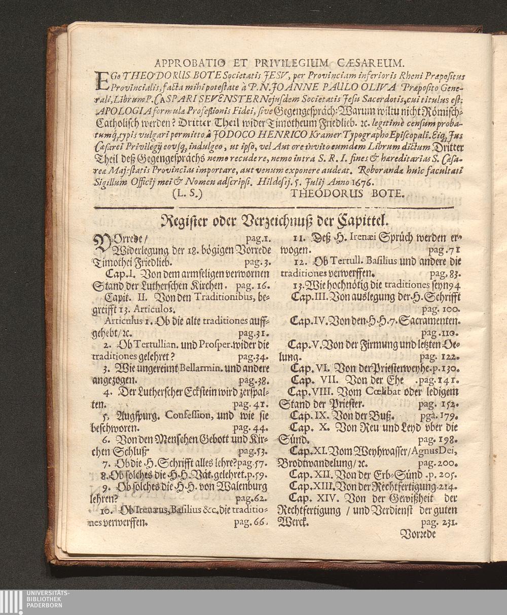 Dritter Theil (1677) Apologia Formulæ Professionis Fidei Defensæ Oder Dritter Theil Deß Gegengesprächs Warum wilt du nicht Römisch-Catholisch werden/ wie deine Vorfahren gewesen? : Jn diesem Wird das ungültige/ hochstraffbare Kippergeld/ Welches unlängst Timotheus Friedlieb außgebotten/ seine hinterlassene nachdenckliche hohe Schulden abzulegen/ An dem Probstein des H. göttlichen Worts Vnd der Vhralten Kirchenlehr angestrichen/ Und gar ungültig unannemlich befunden ; Allen irrlauffenden Seelen zur Warnung und Nachricht