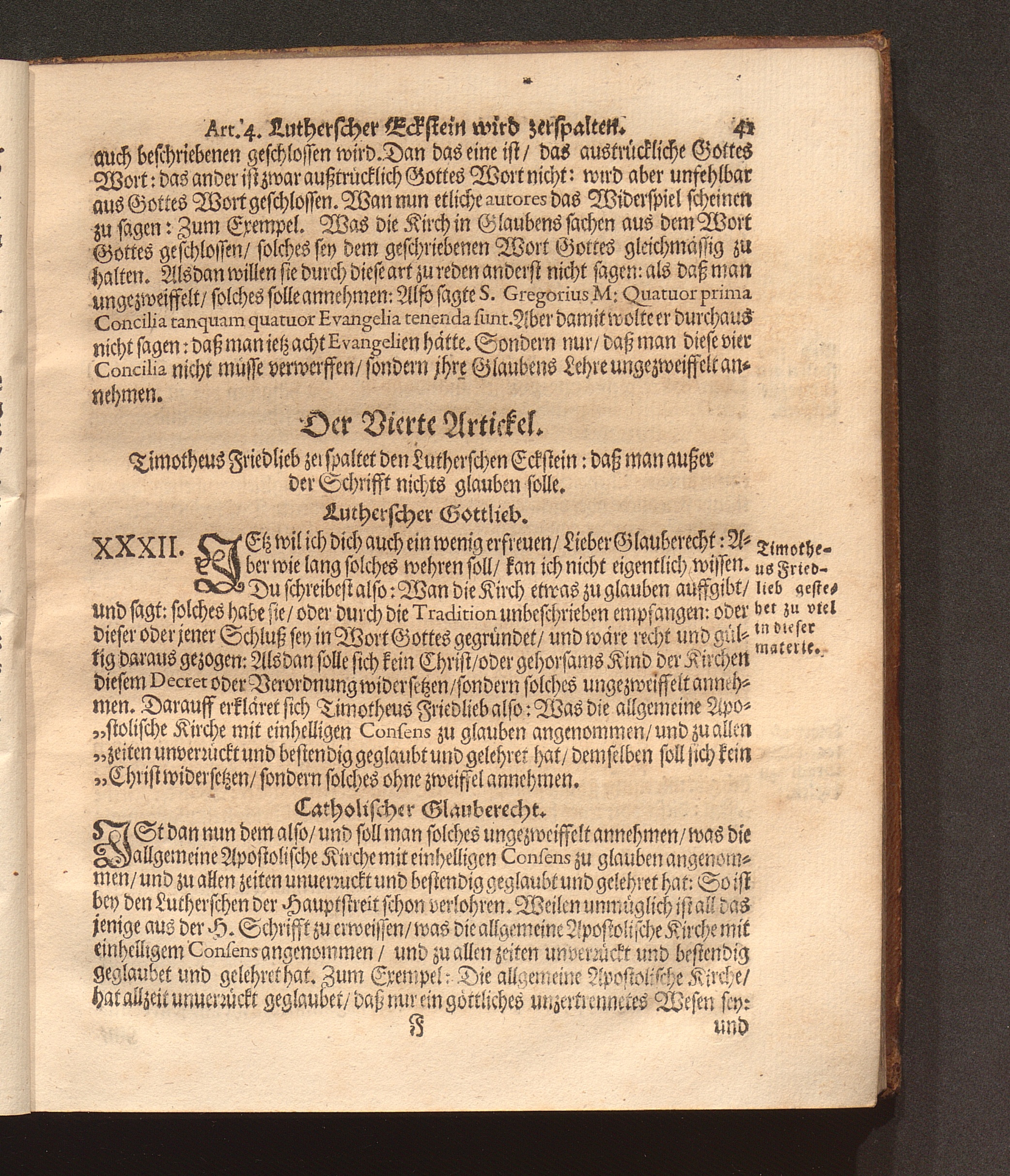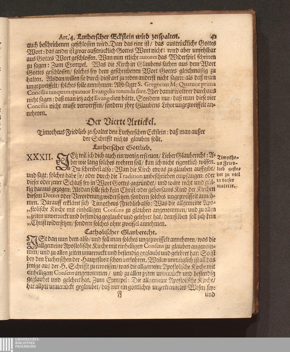 Dritter Theil (1677) Apologia Formulæ Professionis Fidei Defensæ Oder Dritter Theil Deß Gegengesprächs Warum wilt du nicht Römisch-Catholisch werden/ wie deine Vorfahren gewesen? : Jn diesem Wird das ungültige/ hochstraffbare Kippergeld/ Welches unlängst Timotheus Friedlieb außgebotten/ seine hinterlassene nachdenckliche hohe Schulden abzulegen/ An dem Probstein des H. göttlichen Worts Vnd der Vhralten Kirchenlehr angestrichen/ Und gar ungültig unannemlich befunden ; Allen irrlauffenden Seelen zur Warnung und Nachricht