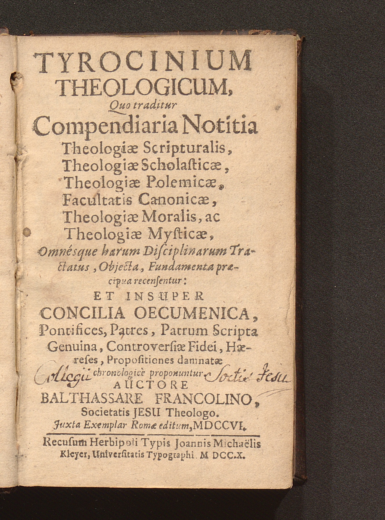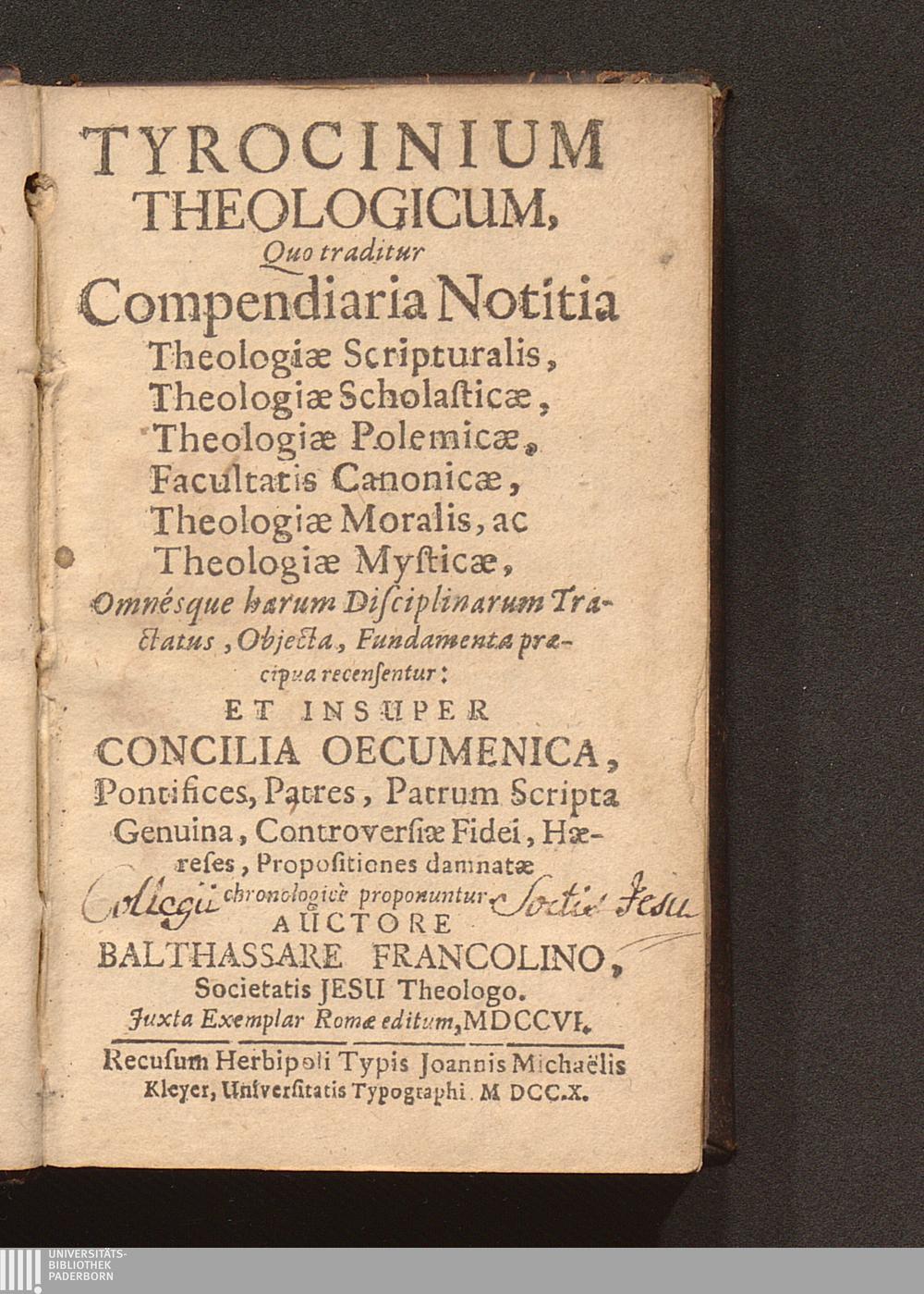 Tyrocinium Theologicum : Quo traditur Compendiaria Notitia Theologiæ Scripturalis, Theologiæ Scholasticæ, Theologiæ Polemicæ, Facultatis Canonicæ, Theologiæ Moralis, ac Theologiæ Mysticæ, Omnésque harum Disciplinarum Tractatus, Objecta, Fundamenta præcipua recensentur: Et Insuper Concilia Oecumenica, Pontifices, Patres, Patrum Scripta Genuina, Controversiæ Fidei, Hæreses, Propositiones damnatæ chronologicè proponuntur / Auctore Balthassare Francolino, Societatis Jesu Theologo
