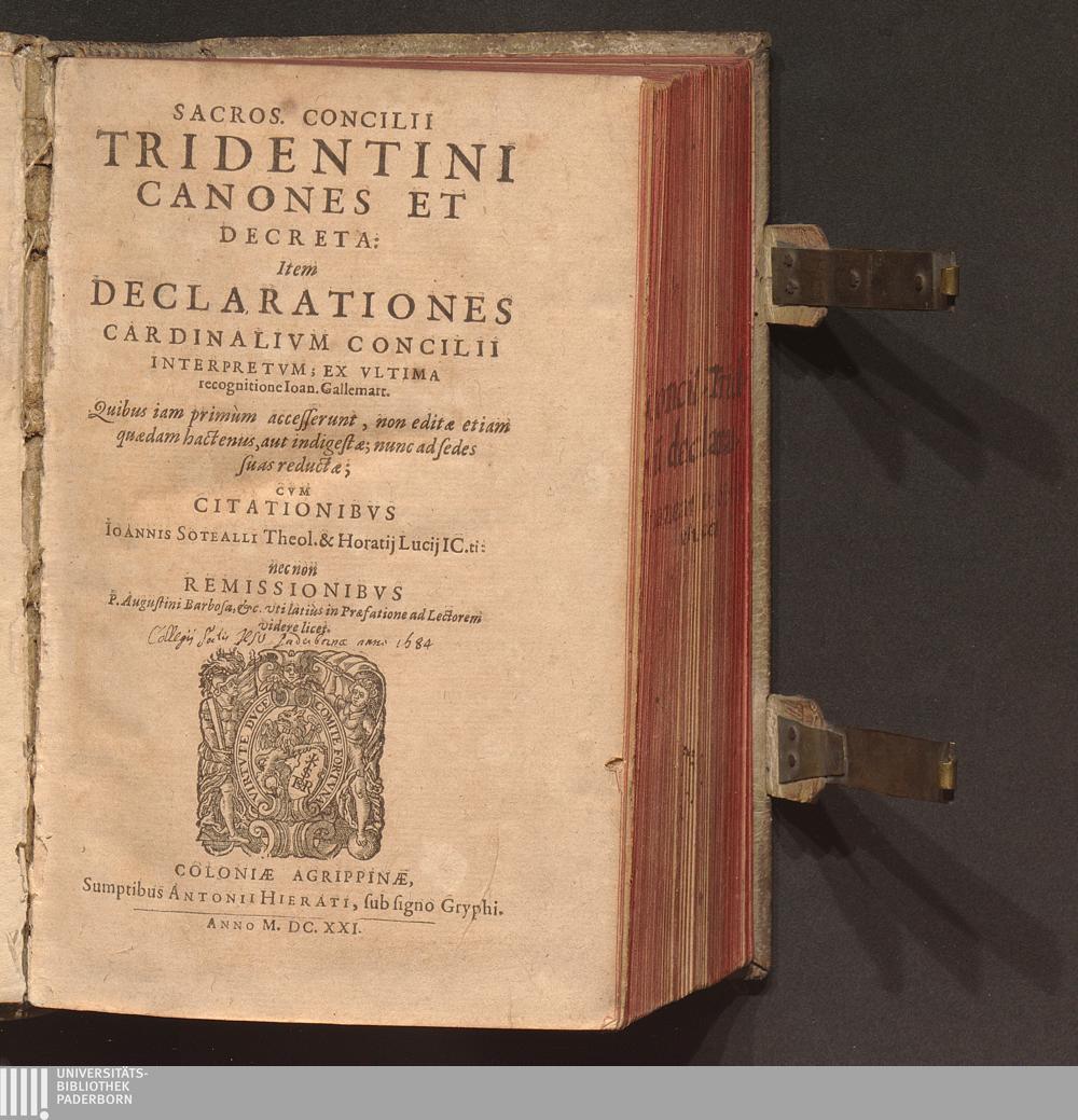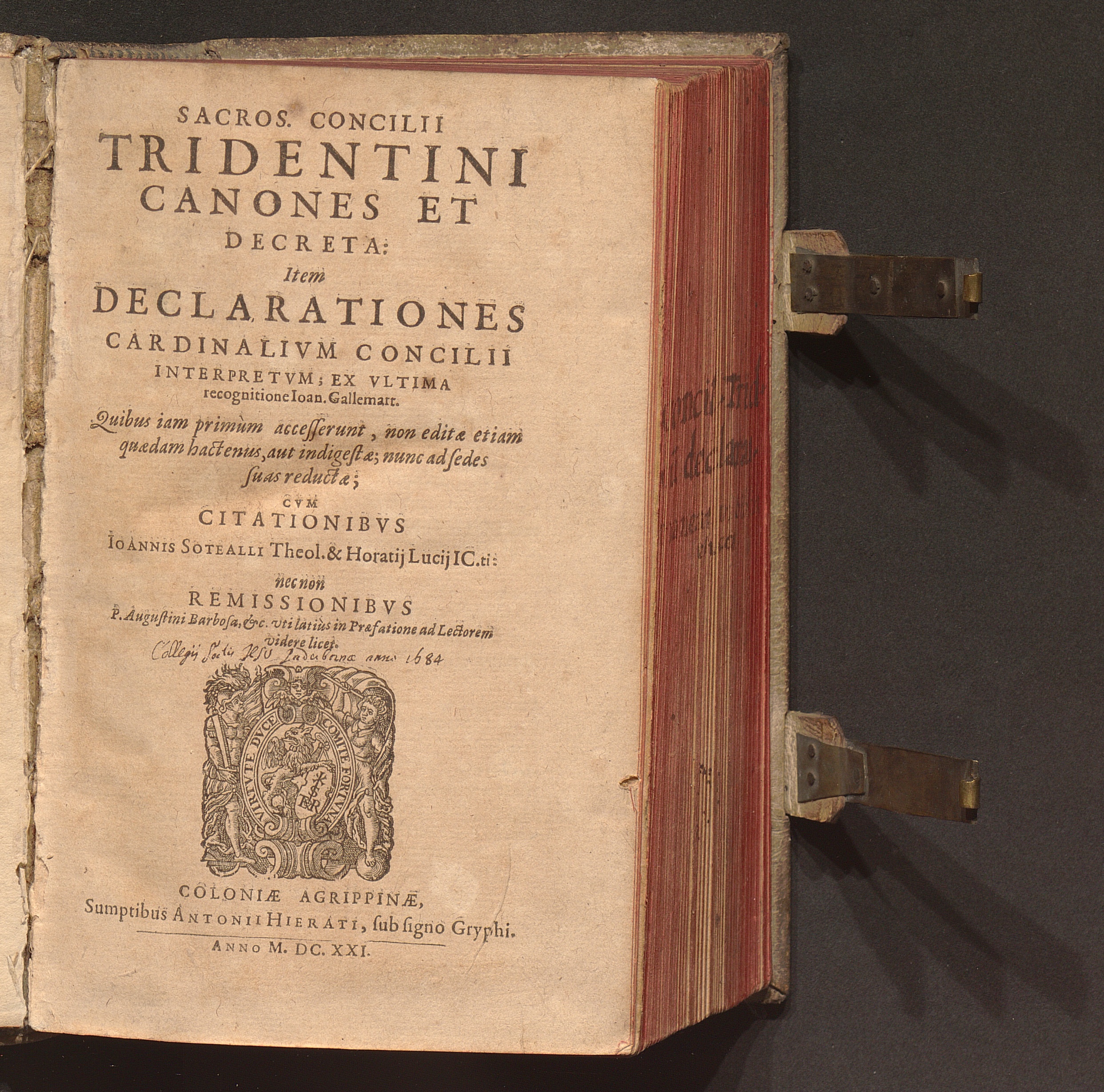 Sacros. Concilii Tridentini Canones Et Decreta : Item Declarationes Cardinalivm Concilii Interpretvm / Ex Vltima recognitione Ioan. Gallemart. Quibus iam primùm accesserunt, non editæ etiam quædam hactenus, aut indigestæ; nunc ad sedes suas reductæ; Cvm Citationibvs Ioannis Sotealli Theol. & Horatij Lucij IC.ti: nec non Remissionibvs P. Augustini Barbosa , ...