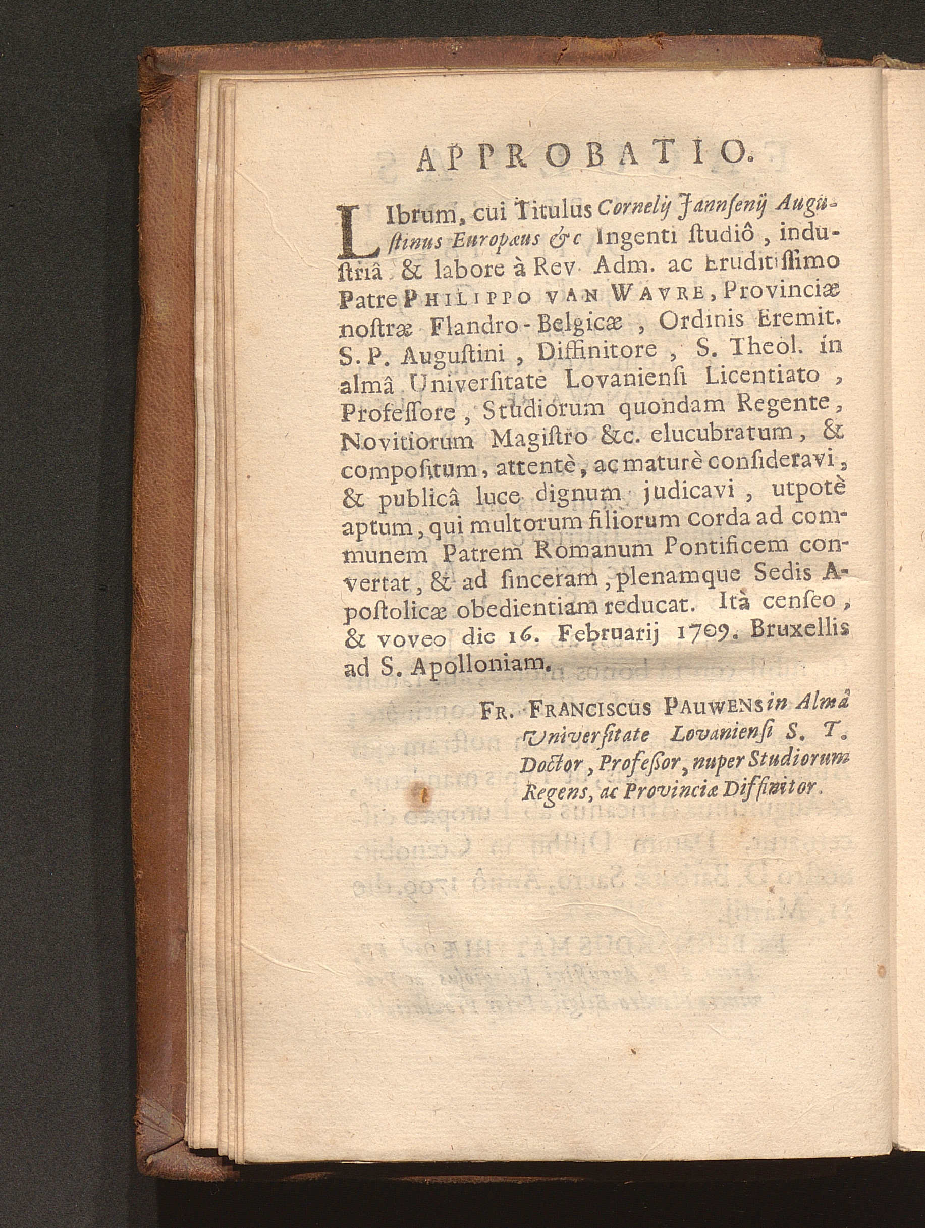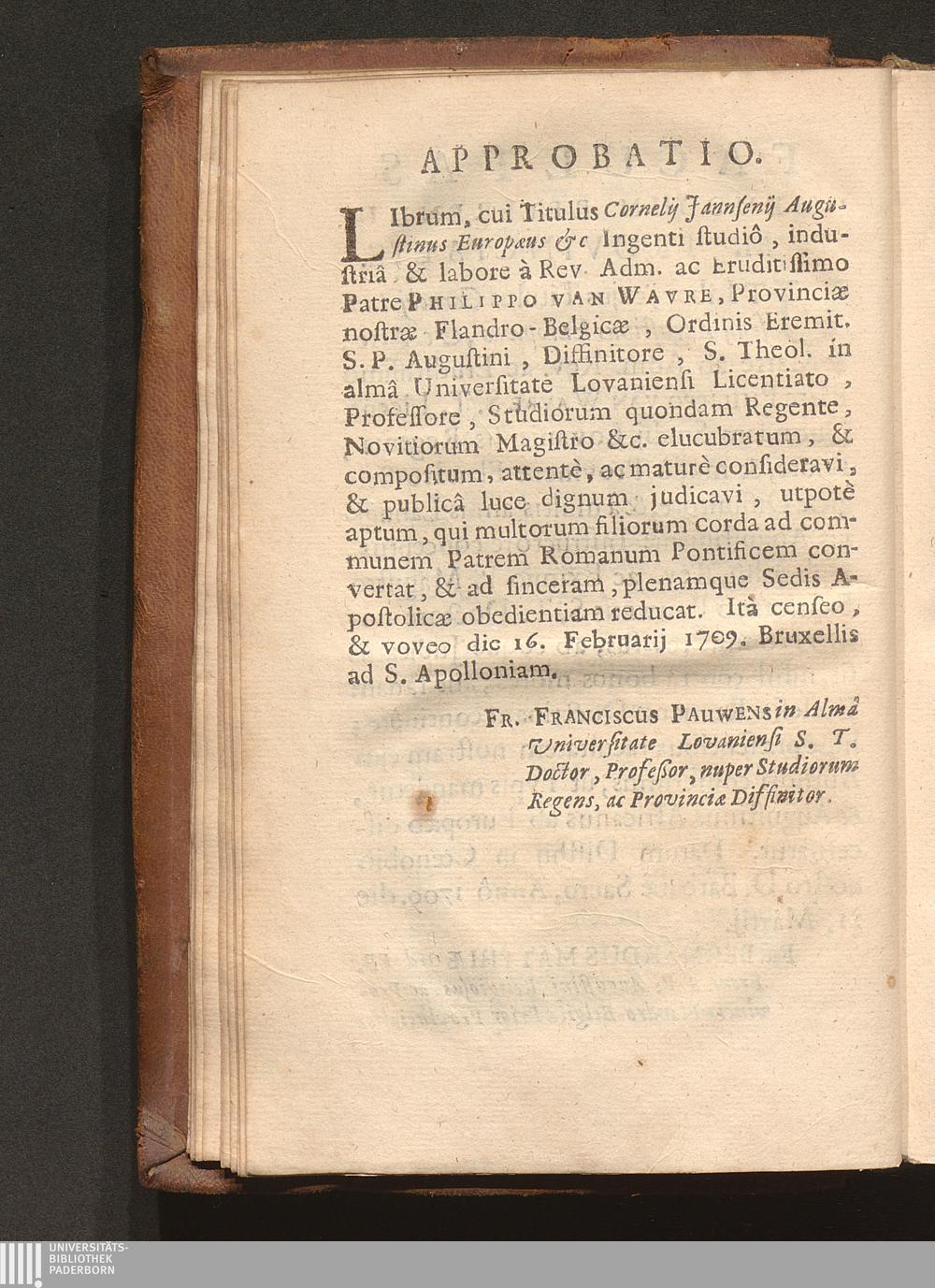 Cornelii Jansenii Iprensis Episcopi Augustinus Europaeus Perperam Dictus : In ferali Famosarum suarum Pentade per Augustinum Verum Maximum Ecclesiae Doctorem (Salvâ Gratiâ Christi per se efficiente) Triumphatus, damnatus, priusquam natus, atque Apostolico fulmine ictus / Opera Ac Studio Fr. Philippi van Wavre Ordinis Eremitarum S. Augustini Sacrae Theologiae Licentiati & Provinciae Flandro-Belgicae Diffinitoris